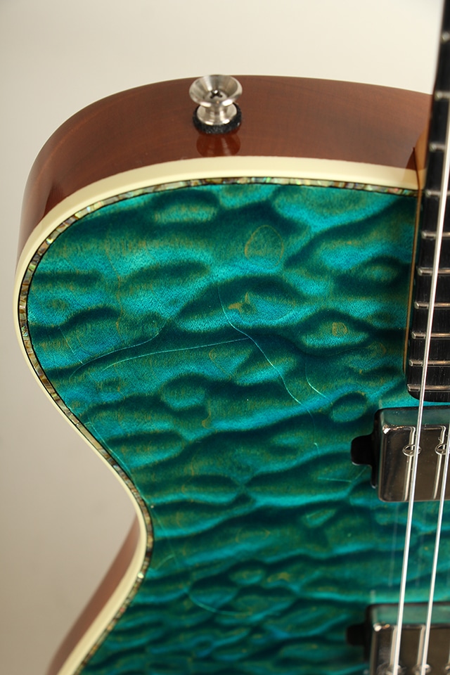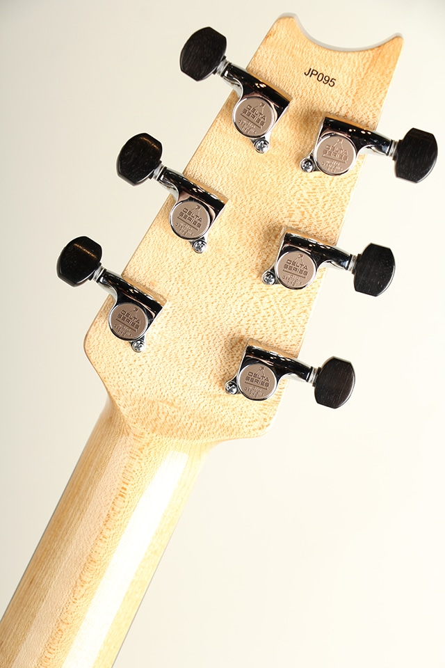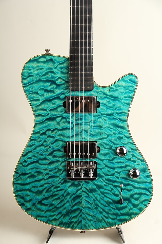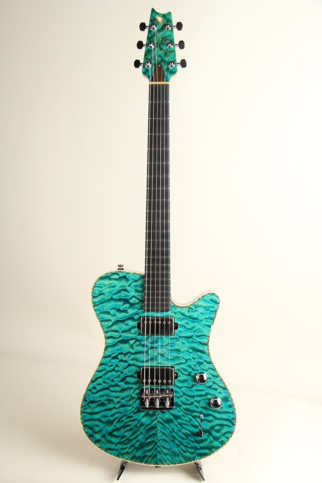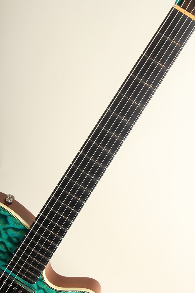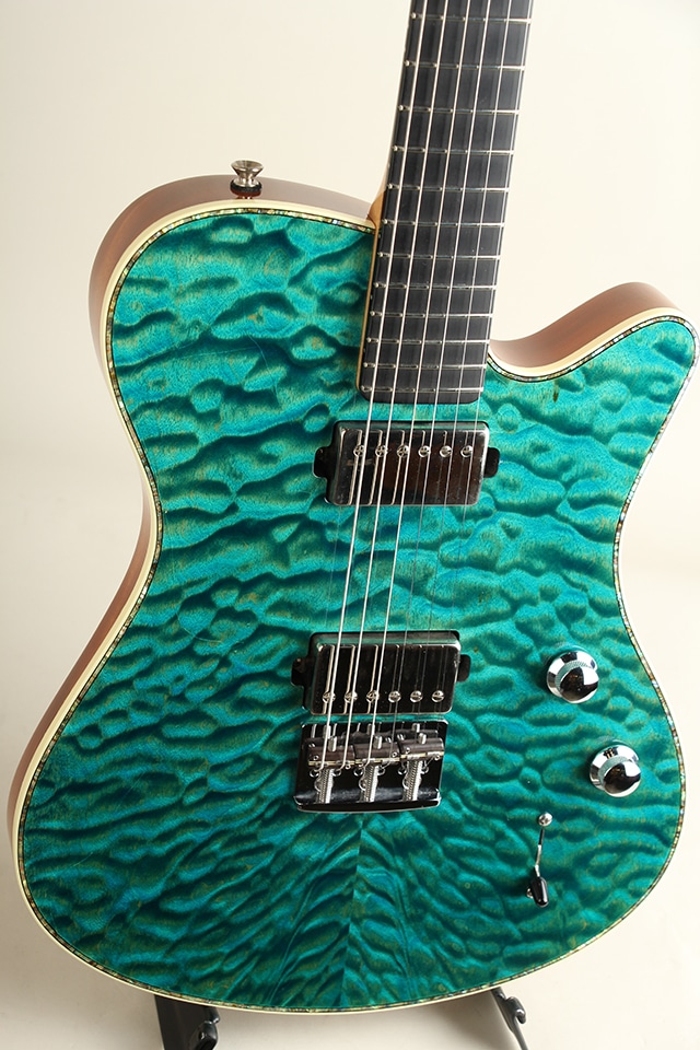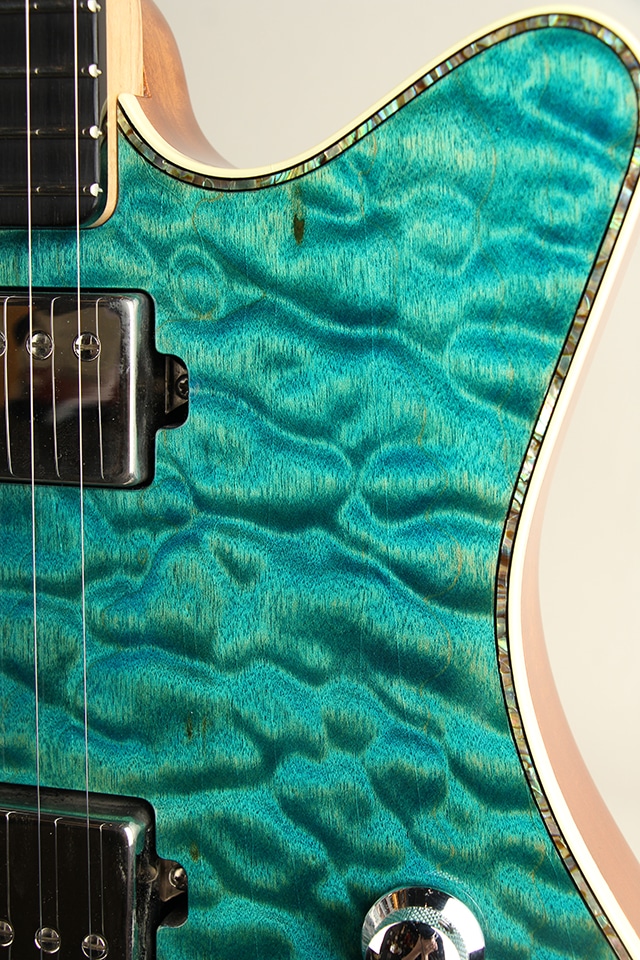 当機はボルトオンのオリジナルボディ・シェイプに、ひときわ目を引く極上のキルトトップにマホガニーバック、メイプルネックにエボニー指板といったウッドスペックが採用されております。ボディカラーはBoraBoraBlueのようなトランスブルー&グリーン系のカラー、ヘッドトップもキルト材が貼られたマッチングヘッド仕様、ボディ外周にはアバロンを使ったパーフリングが施されており、見事なキルト材と相まって豪華絢爛な見事な仕上がりとなっております。
