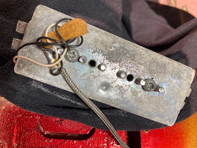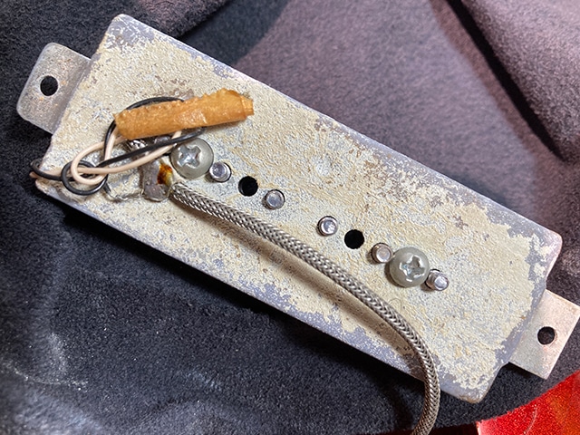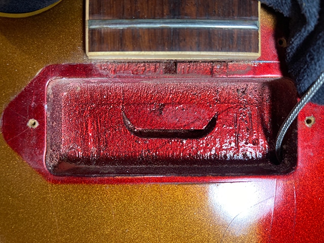 経年によって赤みの退色がみられ、ピックガードやピックアップカバー下にはしっかりと赤みが残ったこの年代のバーガンディ。