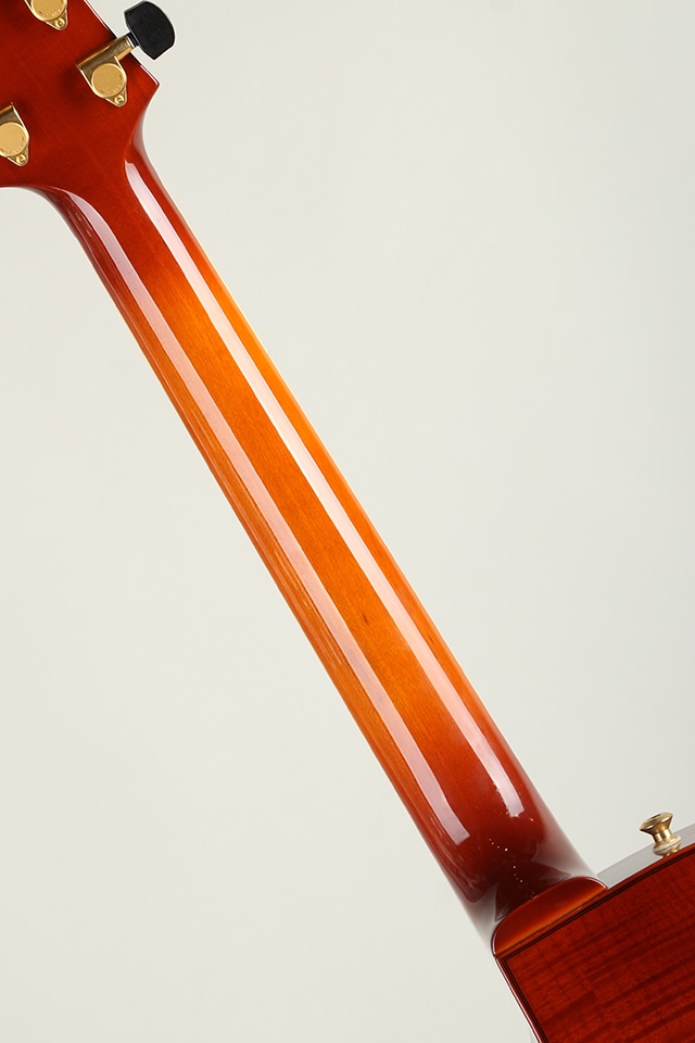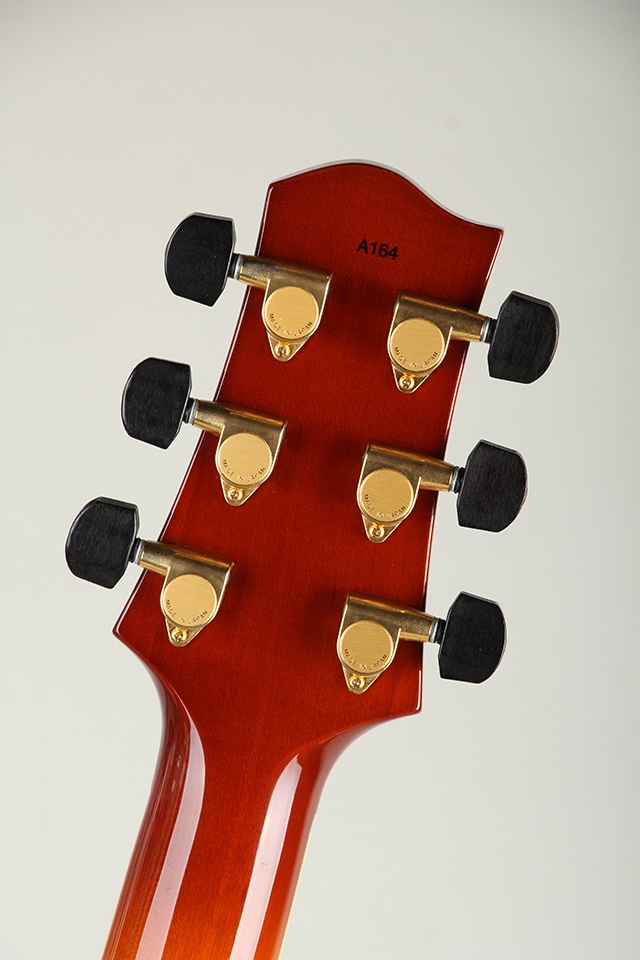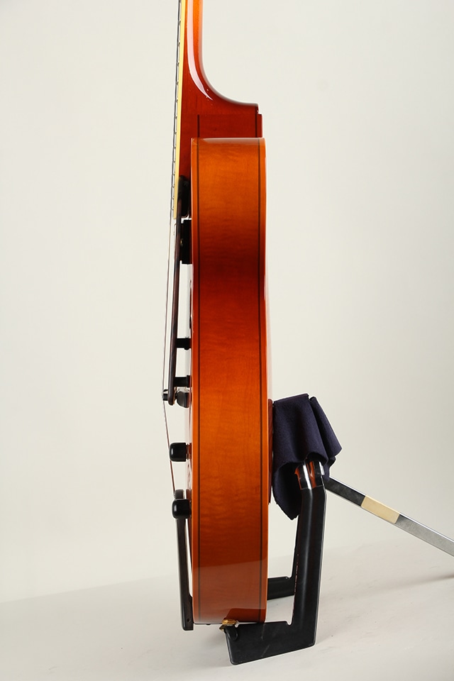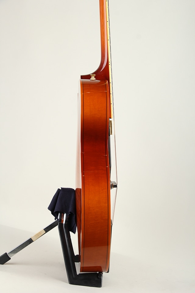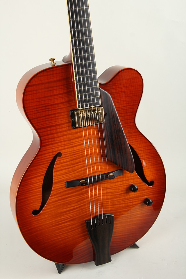 やや薄胴の16インチサイズ。上品に杢の出たラミネイトメイプル・ボディ、エボニー指板、ブリッジ&テールピース、24 3/4インチスケール、やや幅広で薄い弾きやすいネック等、シンプルで洗練されたデザインの中に細部まで拘りぬいて製作された精度の高さを感じさせてくれる仕上がりです。