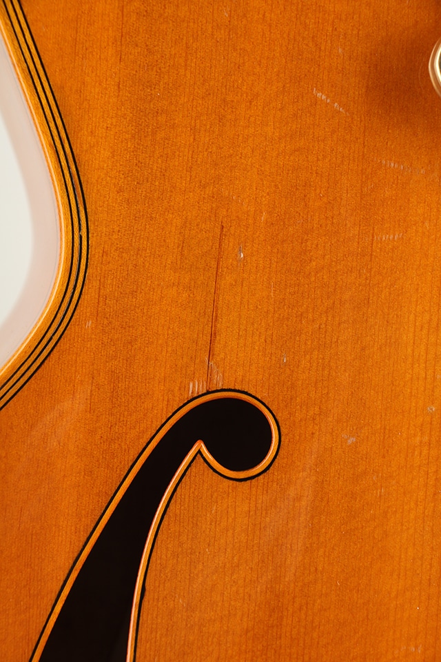 こちらFホール付近にトップクラック修正あり、キズ等は散見されますが、ネックコンディションは良好でトラスロッド余裕有、フレット残7割と演奏面は良好です。セミハード・ハードケースが付属します。