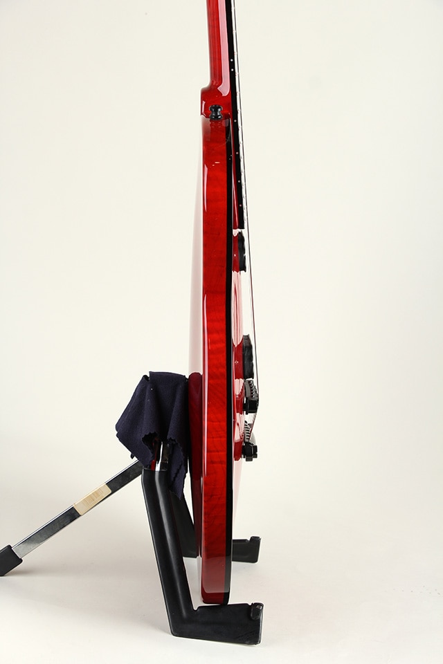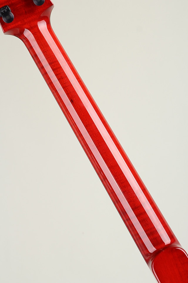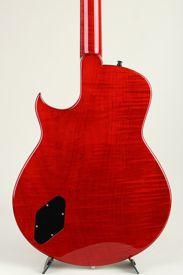 トップ材にはイタリアン・アルパイン・スプルース、ボディバックには1ピース・フィギュアドメイプルを使用しギブソンスケール仕様のオーダーモデルです。ネックにはフレイムメイプルを、指板にはエボニー材を使用したウッドスペック、カラーはMarchione Transparent Redとなります。