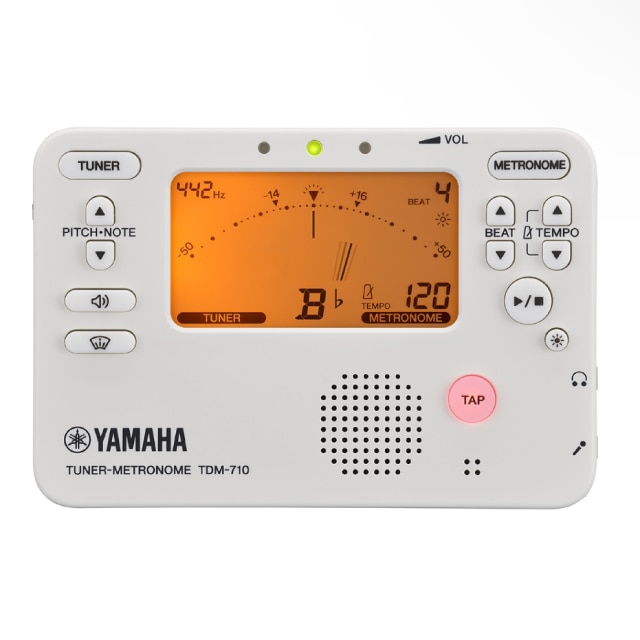 ヤマハチューナーメトロノームTDM-710は、演奏の魅力を最大限に引き出すために、音程感とテンポ感の向上をサポートするアイテム。2段階バックライト付きの大型液晶にチューナーとメトロノームを同時に表示可能。正しいピッチを確認しながらメトロノームを使った練習ができます。練習をサポートする「サウンドバック」「トラック」「フォーカス」各種モード付き。