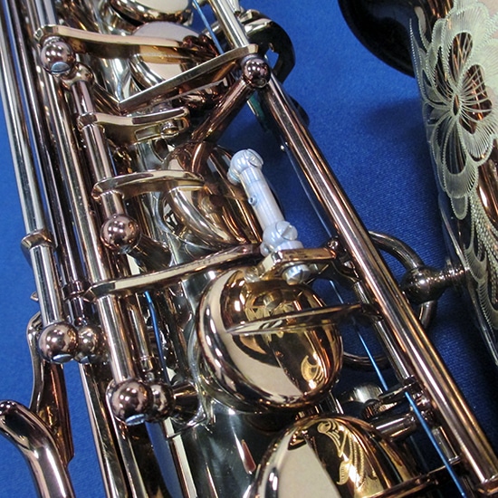 半世紀にわたりサックスのリペアを行ってきた経験を基に、独自のノウハウを注ぎ込んだウッドストーンサックス。音色・レスポンス・音程・操作性、いずれも素晴らしく、低音域から高音域までナチュラルでスムーズな吹奏感。 どのモデルも根底にある柔らかく優雅な音色と輝かしい倍音を豊富に含んだサウンドです。様々な仕上から好みに合ったサウンドを見つけられる、現代の楽器でヴィンテージを極限まで再現した楽器です。 ■【ネック】 ・軽量かつ密度のある響きとレスポンスの良さ、倍音を多く含んだ音色を実現。ヴィンテージサックスでも人気の高い楽器のネック形状を基にウッドストーン独自のノウハウを加えたネックはこの楽器最大の魅力です。 ■【ウッドストーンオリジナルカスタマイズパーツ】 ・ネックジョイントスクリュー、ライアースクリュー:特殊な製法で作られた銀合金スクリューにより、音色はまろやかで音のつながりを飛躍的に向上しています。 ・ヴィンテージラバーサムレスト:通常はプラスチック製が装着している楽器が多く見られますが、良質なハードラバー素材を使用し、さらに接着材は使用せず、ネジ固定式にする事でスムースな響きと素早いレスポンス、柔らかく豊富な倍音を含んだ音色になります。 ・ブラス製サムフック:独自の設計により管体とサムフックの接触面を極力抑え、低音域から高音域まで幅広い音量調節が可能となっています。また、サックスではこもりやすい音域のD、E、Fの音質も改善されます。 ■【U字管、2番管接合】 ・現在のサックスは生産性向上や修理時の分解をする為に、通常、接着剤で接合されていますが、ハンダ溶接で接合。ネックから吹き込んだ息をダイレクトにベルまで振動させると共に、振動効率が良くなり、音量も向上させています。 ■【彫刻】 ・熟練の職人の手によって一本一本丁寧に彫られた彫刻は、昔の古き良き時代を彷彿とさせる豪華な彫刻となっています。 ■【ケース・付属品】 ・ケースはGL社製セミハードケースが付属。大切な楽器を衝撃や振動から守ります。 ・その他付属品に、ウッドストーンオリジナルのスムースパッド、マイクロファイバークロス、ボディスワブが付属。(マウスピース、リガチャー、キャップは付属しません)