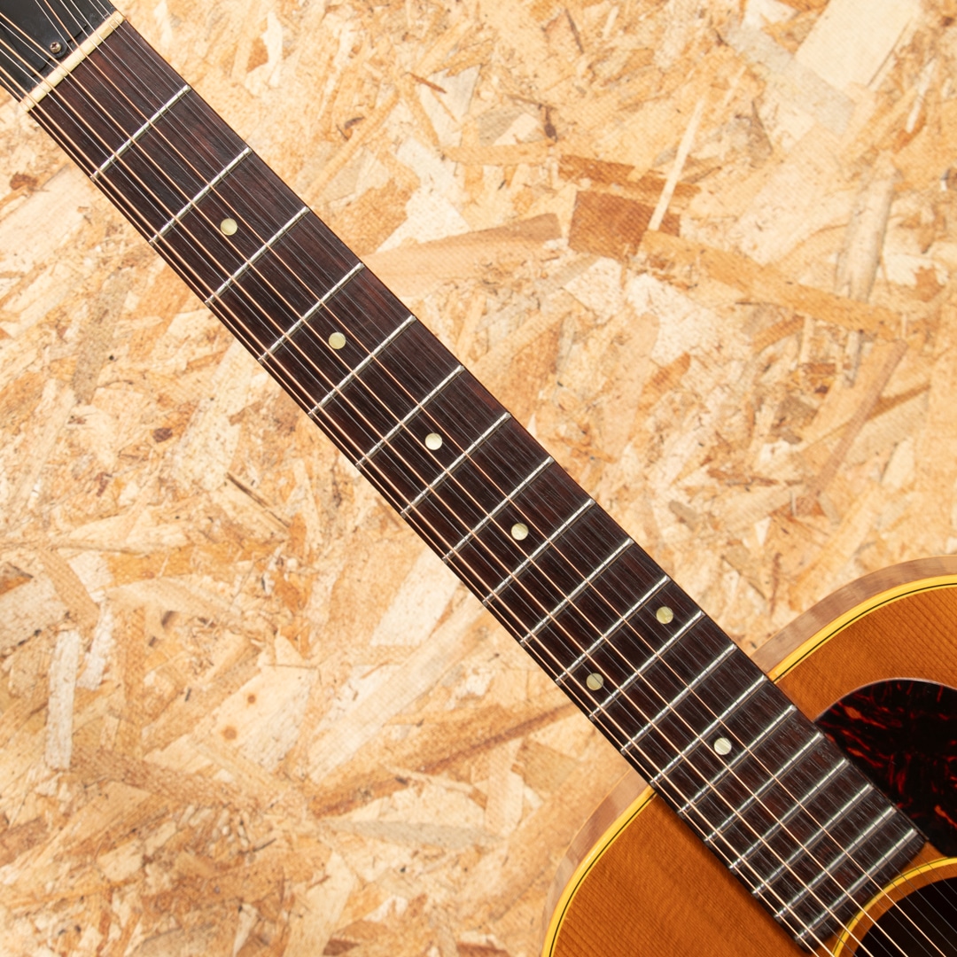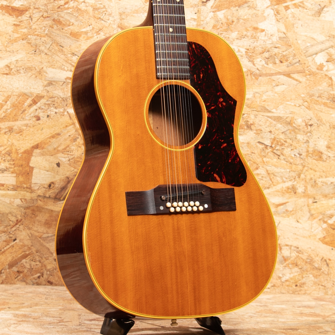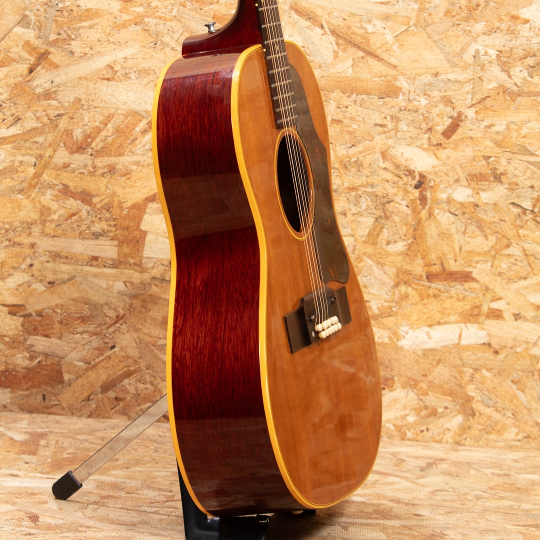 1962年に発売となったギブソンの人気小型機種B-25の6弦モデルと同時期に発売された12弦モデル"B-25-12N"です。本器は1964年製の一品で初期型のアップベリーブリッジ、ブリッジピン仕様期のものです。スプルーストップ、マホガニーサイド&バック、マホガニーネック、薄型ラージオリジナルピックガード、ハカランダ指板&アップベリーブリッジ、クルーソン6per Plateオリジナルペグ。6弦仕様同様ザクザク感の強いパーカッシブかつマイルドなサウンドで伸びの良いマーティンスタイルの12弦とは音色のアプローチが異なり個性の強いサウンドです。ボディートップのセンターにクラックがありますが修正済。その傷や使用感はもちろんございますが、製作年数から見て非常に良いコンディションを保っています。アジャスタブルブリッジは限界まで低くし、弦高を低い状態に設定しており、演奏性も良好です。チップボードケースが付属いたします。