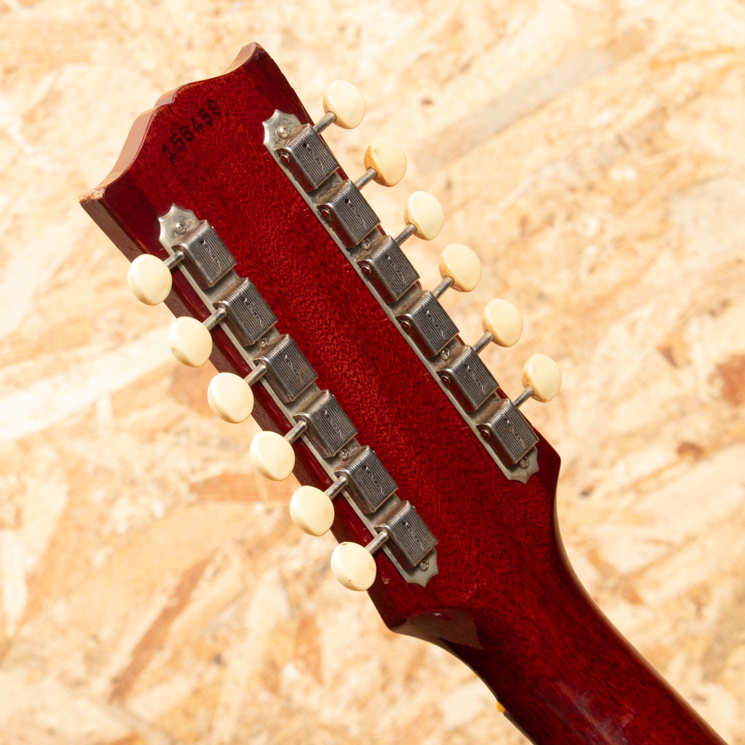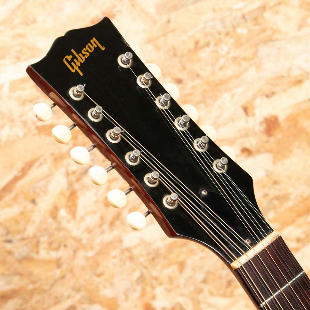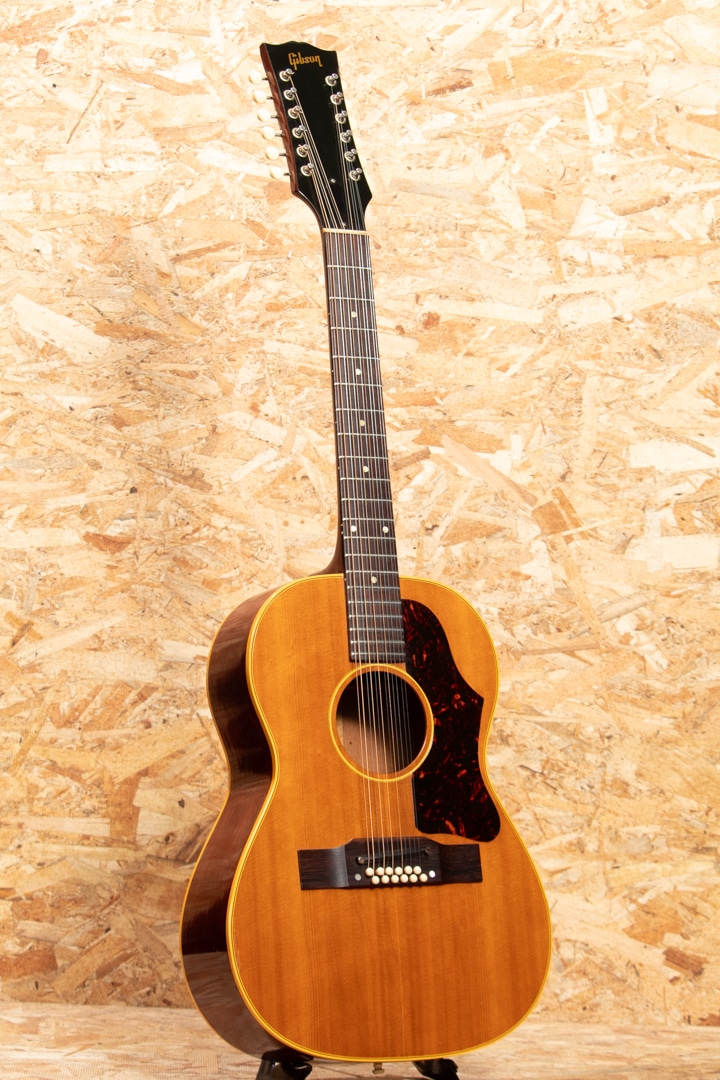 1962年に発売となったギブソンの人気小型機種B-25の6弦モデルと同時期に発売された12弦モデル"B-25-12N"です。本器は1964年製の一品で初期型のアップベリーブリッジ、ブリッジピン仕様期のものです。スプルーストップ、マホガニーサイド&バック、マホガニーネック、薄型ラージオリジナルピックガード、ハカランダ指板&アップベリーブリッジ、クルーソン6per Plateオリジナルペグ。6弦仕様同様ザクザク感の強いパーカッシブかつマイルドなサウンドで伸びの良いマーティンスタイルの12弦とは音色のアプローチが異なり個性の強いサウンドです。ボディートップのセンターにクラックがありますが修正済。その傷や使用感はもちろんございますが、製作年数から見て非常に良いコンディションを保っています。アジャスタブルブリッジは限界まで低くし、弦高を低い状態に設定しており、演奏性も良好です。チップボードケースが付属いたします。