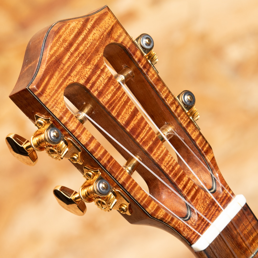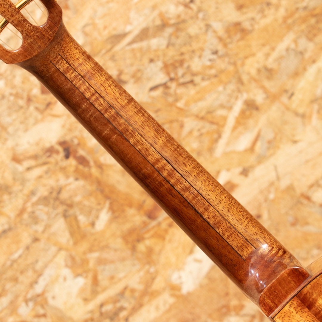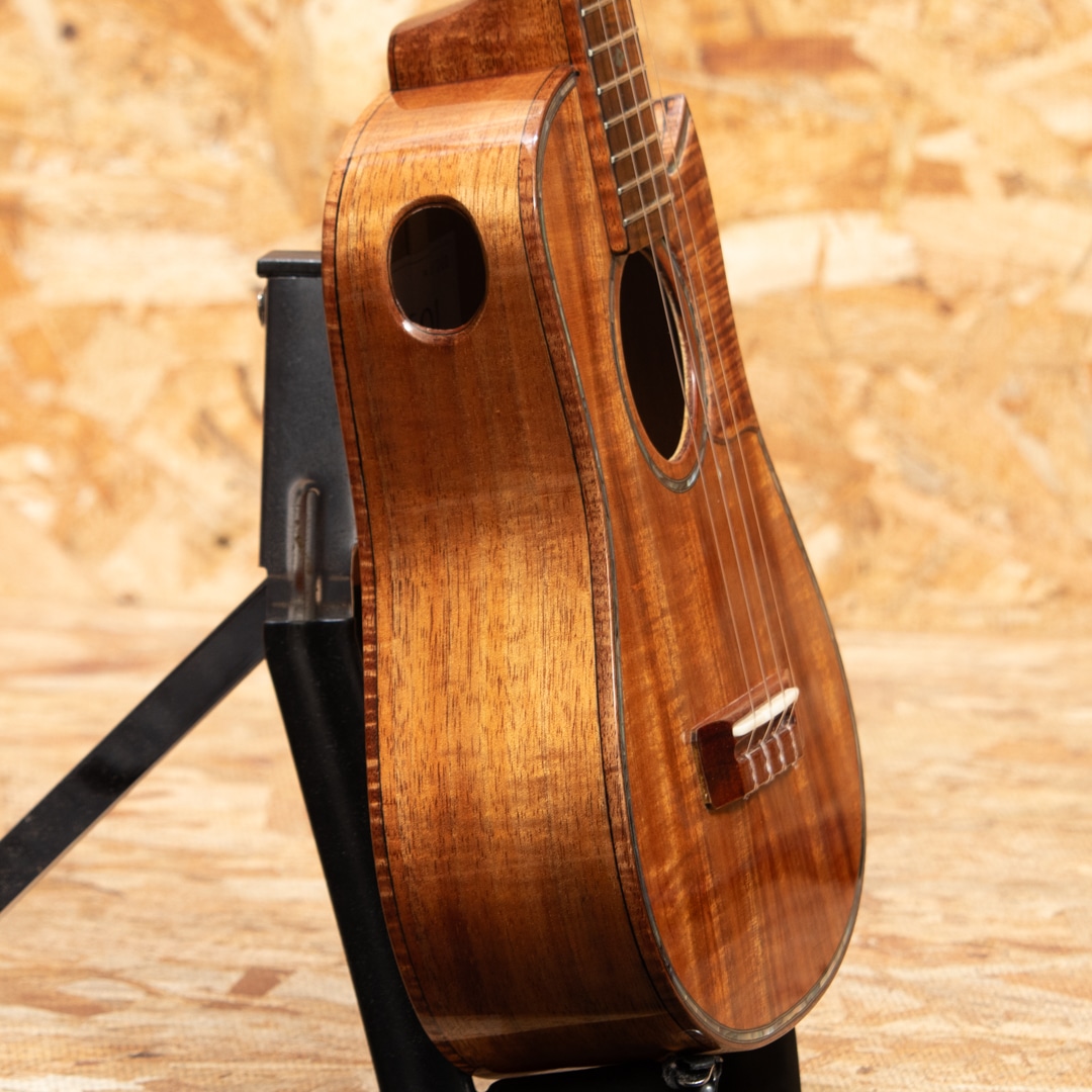 1998年茶位幸信氏に師事し、工房にて12年の修行を積み、ギター、ウクレレの製作技術を習得。2010年満を持して独立を果たす。クラシックギターの原点といえるトーレスの製作方法などを研究し、ウクレレに活かした構造はこれまでのウクレレのイメージを払拭した音色で、コアなウクレレファンを唸らせています。これまで”Furubayashi”、”F’s uke”というブランド名にて多数のウクレレを製作されてきましたが、また新たなコンセプトのもと誕生した話題のブランド”KOU”。デザイン性、使用される材等に更なるこだわりが感じられ、コストパフォーマンス性にも優れたウクレレ。”KOU”というブランド名は持っていただいた方に「幸せ」な気分になってほしい、という思いで名付けられたとのこと。本器はボディ、ネック、ヘッド、指板、ブリッジ、ピックガードなど、すべてのウッドマテリアルに極上のハワイアンコア材を用いて製作された極上のカスタム品。コンサートベルシェイプボディにやや長めのセミロングネックを合わせたオリジナルサイズ。良質なハワイアンコア材を使用しており、見た目も美しく、安定性に優れた明瞭なサウンドを大音量で響かせてくれます。随所に施されたアバロンの装飾もハイグレードモデルならではの高級感。サウンドポート、フローレンタインカッタウェイ付き仕様で音響特性、演奏性にも長けたモデルとなっております。多様なスタイル、ジャンルに対応できる万能な1本。ギグケース付き。