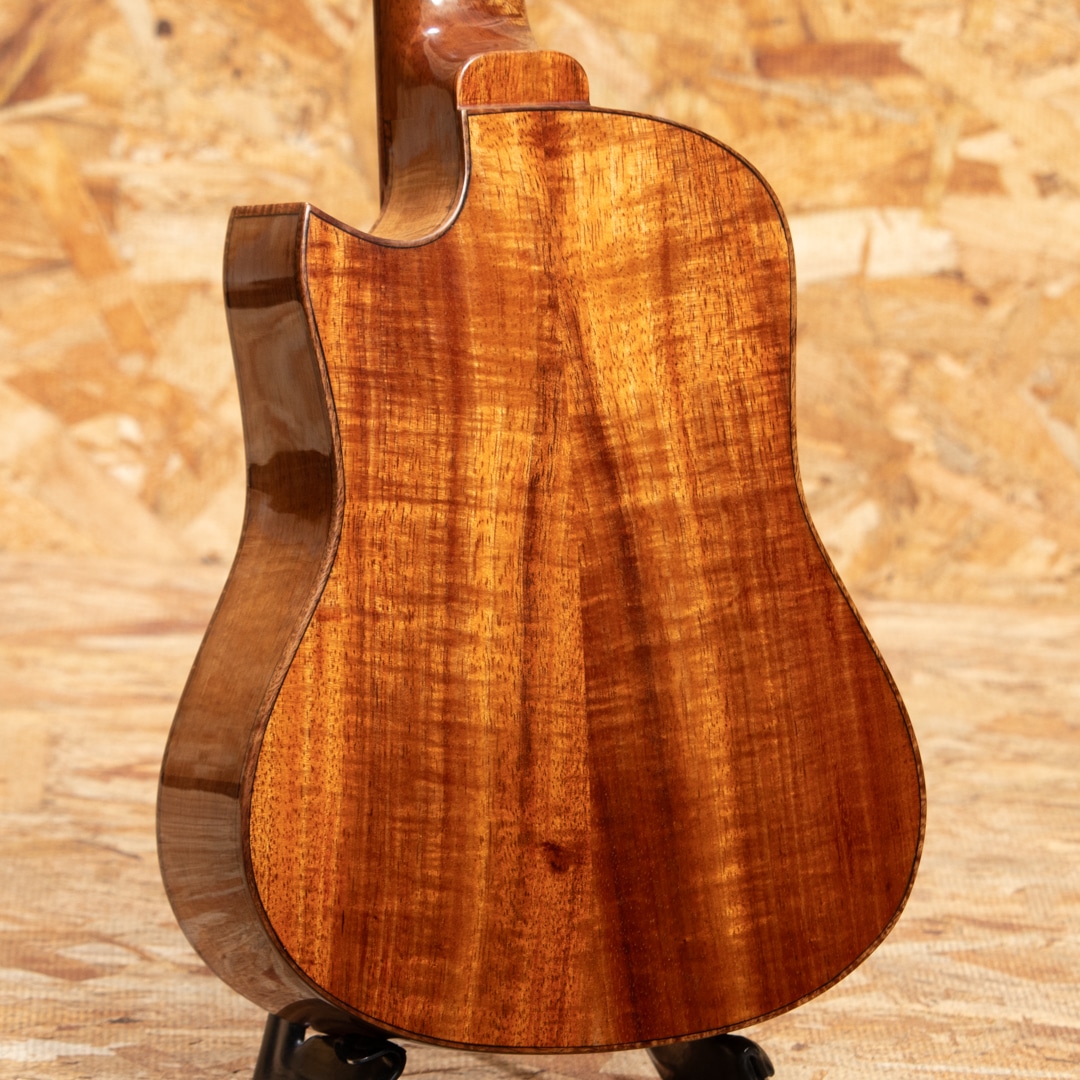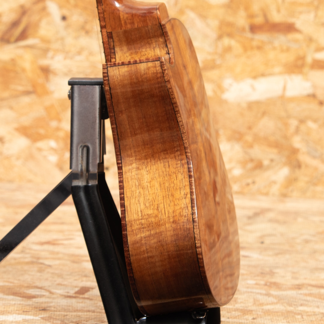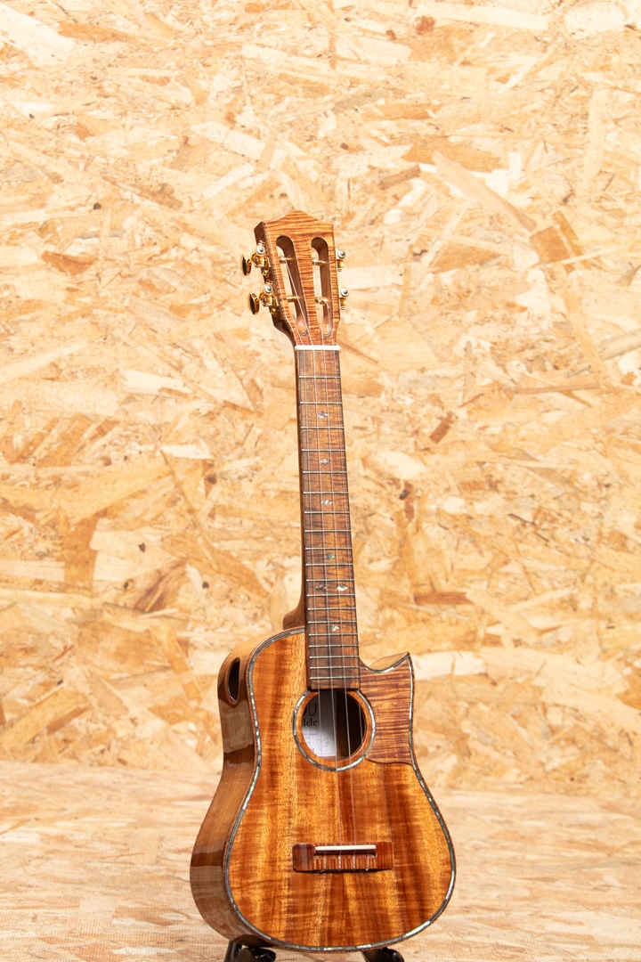 1998年茶位幸信氏に師事し、工房にて12年の修行を積み、ギター、ウクレレの製作技術を習得。2010年満を持して独立を果たす。クラシックギターの原点といえるトーレスの製作方法などを研究し、ウクレレに活かした構造はこれまでのウクレレのイメージを払拭した音色で、コアなウクレレファンを唸らせています。これまで”Furubayashi”、”F’s uke”というブランド名にて多数のウクレレを製作されてきましたが、また新たなコンセプトのもと誕生した話題のブランド”KOU”。デザイン性、使用される材等に更なるこだわりが感じられ、コストパフォーマンス性にも優れたウクレレ。”KOU”というブランド名は持っていただいた方に「幸せ」な気分になってほしい、という思いで名付けられたとのこと。本器はボディ、ネック、ヘッド、指板、ブリッジ、ピックガードなど、すべてのウッドマテリアルに極上のハワイアンコア材を用いて製作された極上のカスタム品。コンサートベルシェイプボディにやや長めのセミロングネックを合わせたオリジナルサイズ。良質なハワイアンコア材を使用しており、見た目も美しく、安定性に優れた明瞭なサウンドを大音量で響かせてくれます。随所に施されたアバロンの装飾もハイグレードモデルならではの高級感。サウンドポート、フローレンタインカッタウェイ付き仕様で音響特性、演奏性にも長けたモデルとなっております。多様なスタイル、ジャンルに対応できる万能な1本。ギグケース付き。