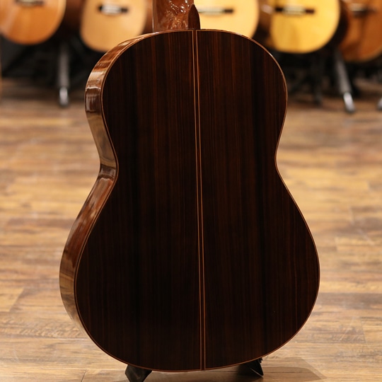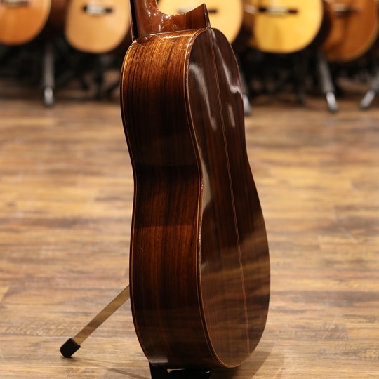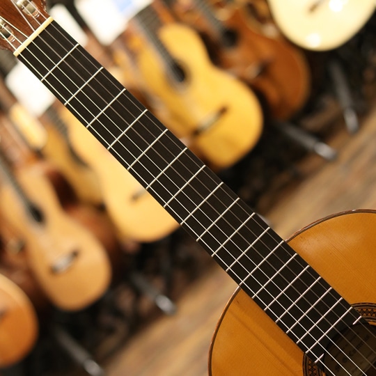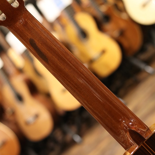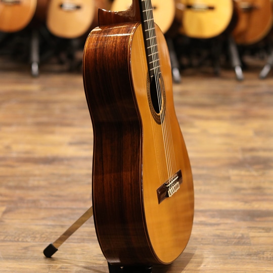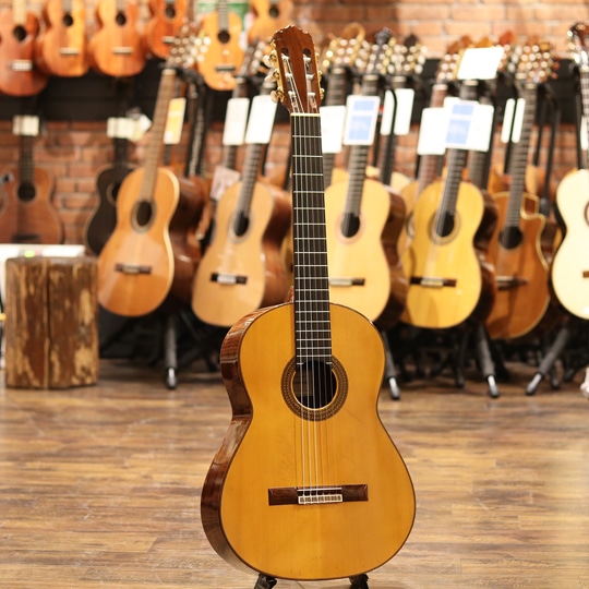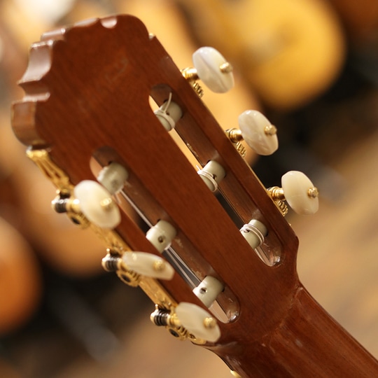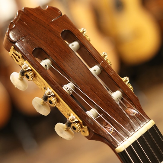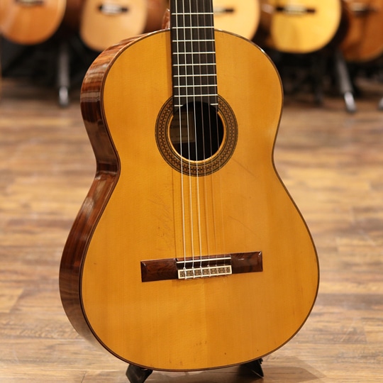 スペインの名工【マヌエル・ゴンザレス・コントレラス】。ホセ・ラミレスのもとで働いていた経歴を持っており、本場スペインの伝統に忠実なクラシカルギターの見本とも言うべき素晴らしい音色が持ち味。バランスがよく堅牢な音像は、埋もれにくいしっかりとした粒立ちと遠達性を持ちます。本器は1967年に製作された工房品。スプルーストップ、ローズウッドサイド&バック、エボニー指板、ハカランダローズウッドブリッジ、ウッドモザイクロゼッタ、ローズウッドバインディング、55ミリ幅ナット、650ミリスケール。使用に伴う小傷や弾き傷はありますがボディに割れ等はございません。ネック裏塗装摩耗などやネックヒール積層部に剥離、ネックとヘッドへの継ぎ目にクラックがありますが補修がされています。弾き込まれたスペインギターならではの芳醇な音色をお楽しみ頂ける1本です。汎用ハードケースが付属いたします。