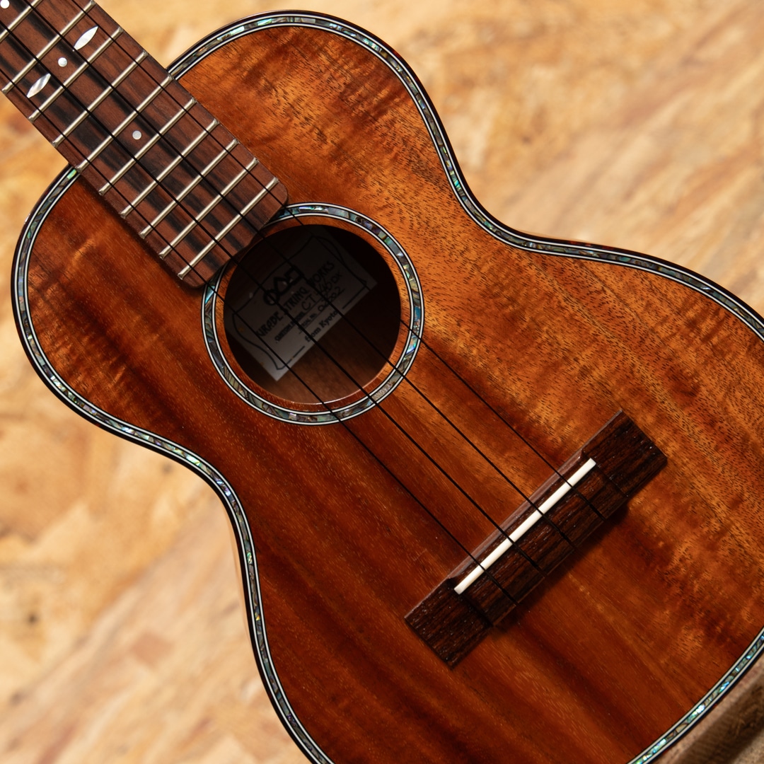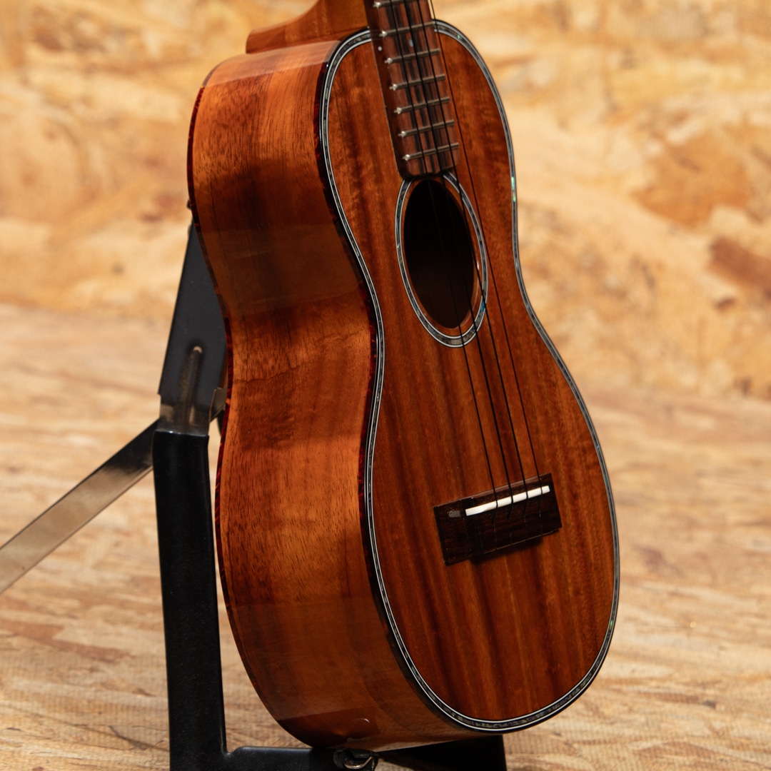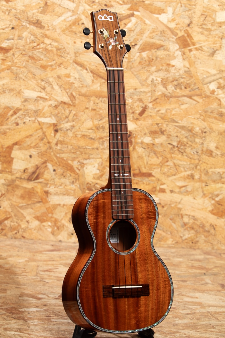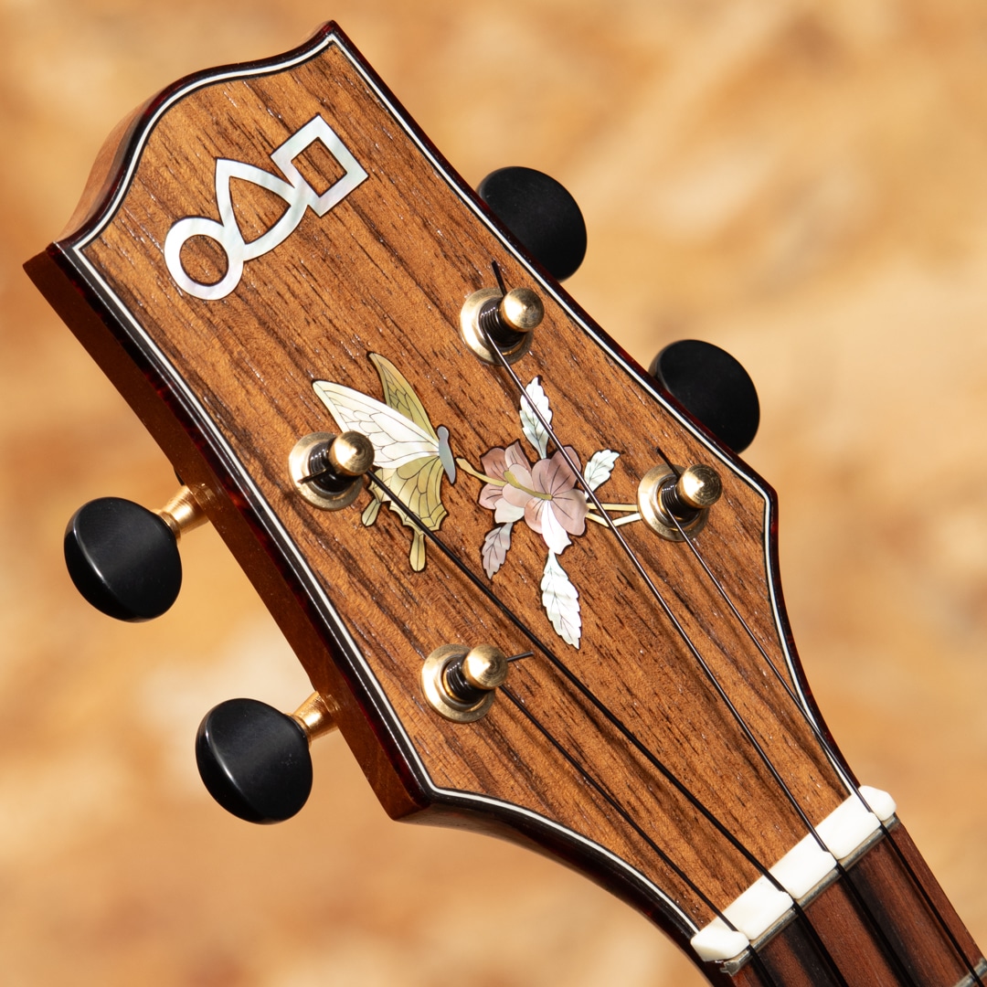 京都市の工房にて占部英明氏、息子の直宏氏によって製作されるハンドメイドウクレレ。本器はテナーサイズのデラックスモデル。ハワイアンコア材ボディ、マホガニーネック、エボニー指板&ブリッジ、べっ甲柄バインディング、アバロンロゼッタ、アバロンボディトリムの王道なスタイルの高級モデル。ヘッドにはインレイ職人”加藤穂高”氏が施した蝶のデザインのインレイが施されており、高級感のある華やかなルックスです。ハワイアンコアらしい深み、甘みもあるサウンド。0フレット仕様でローポジションの弾き易さは格別。こちらはビッグテナー同様の442mmスケールが採用されており、音色のハリ、音量、安定感も優れています。落ち着きのあるデザインが目を引く、豪華なデラックスモデルです。