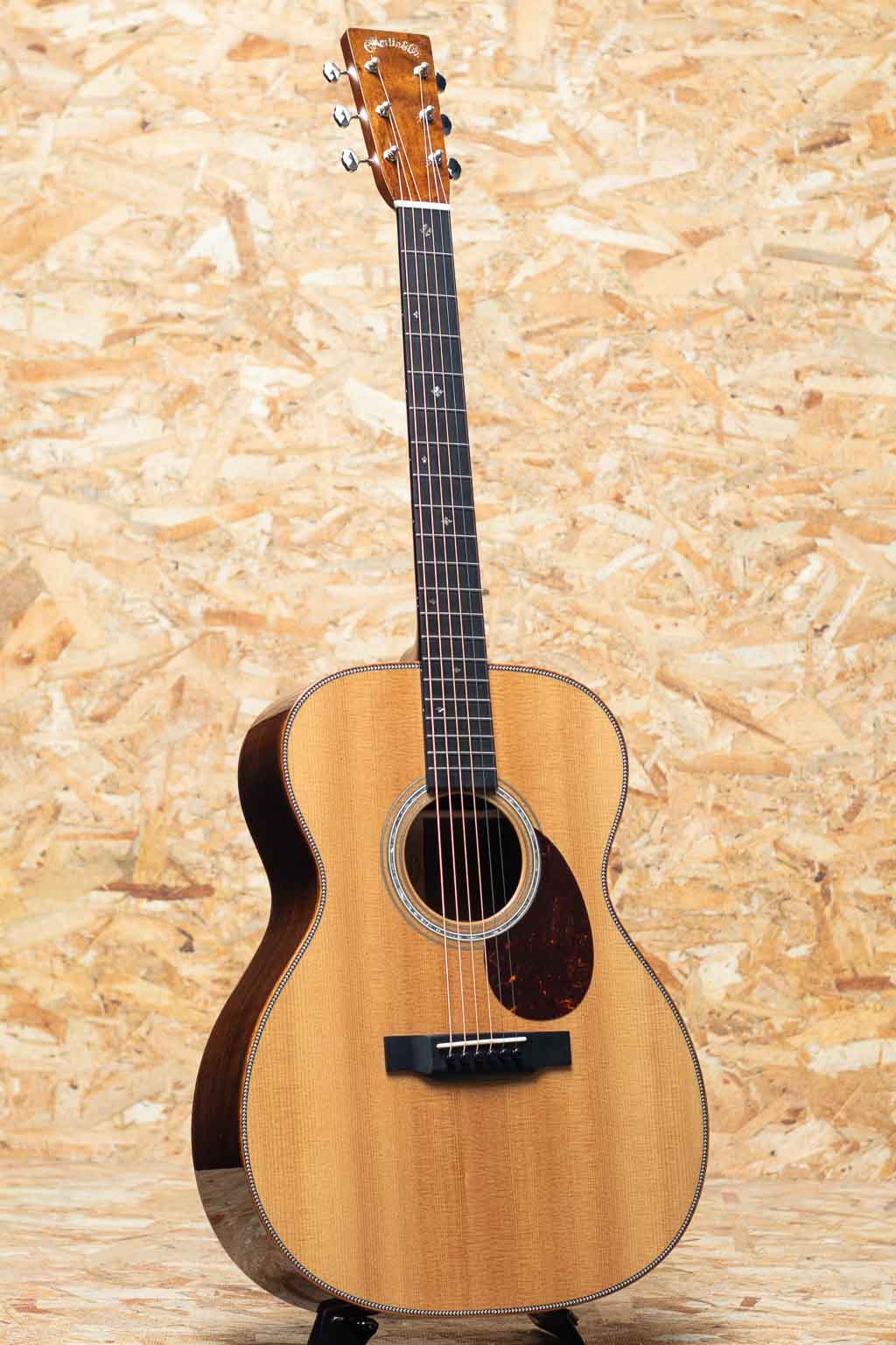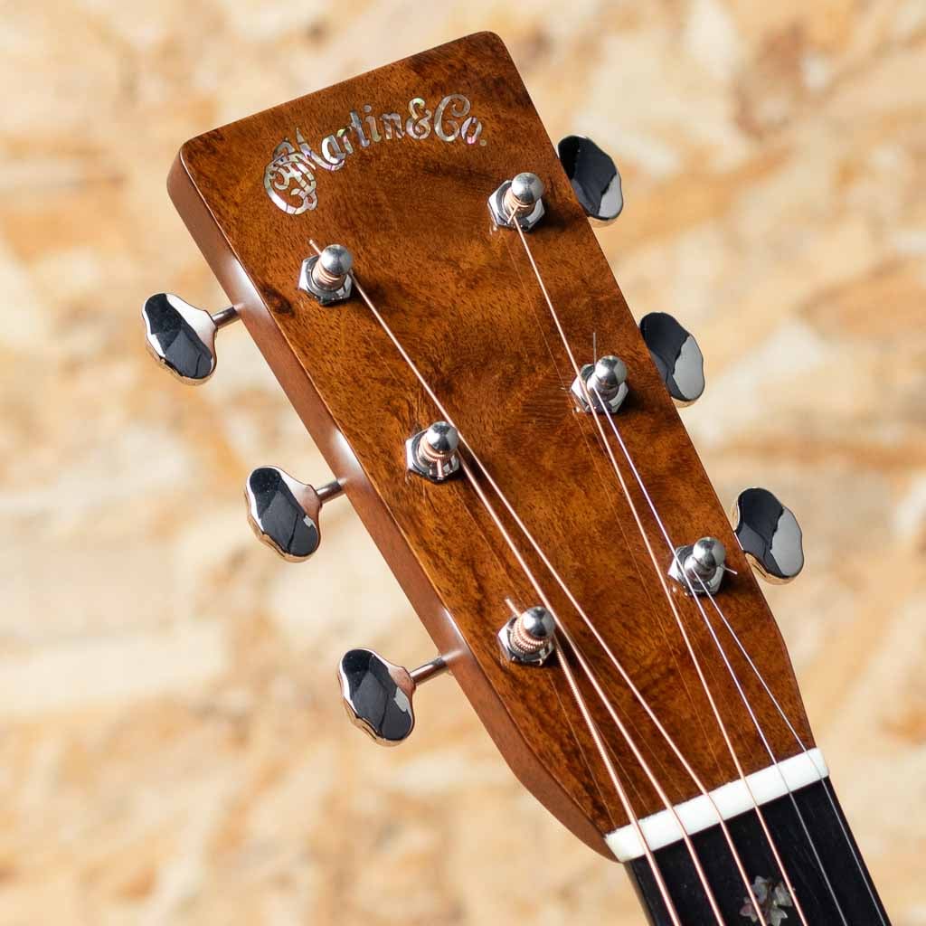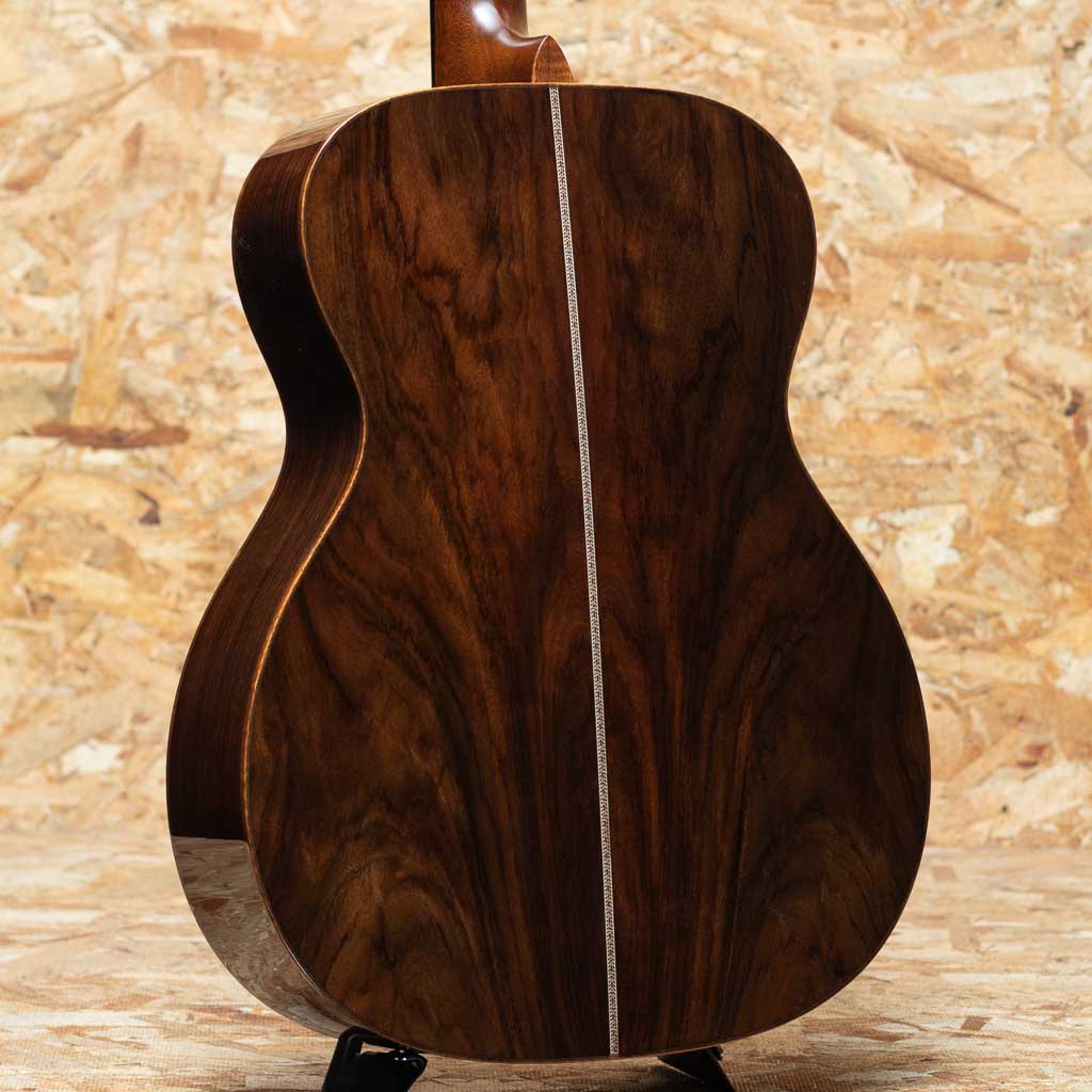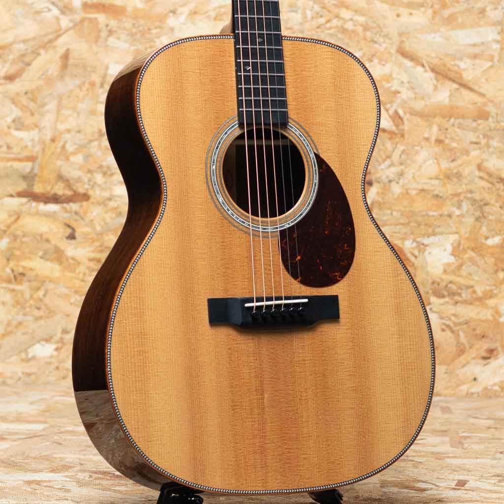 世界に一つだけのカスタムモデル!マーティンカスタムショップ製ギターとはマーティンファクトリー内のほんの一郭にて少数精鋭の熟練職人により手掛けられる超一級ギターのこと。オーセンティックシリーズや、特注品、一点モノのギターなどの生産がそれに当たります。本器はOMサイズボディを基として作成したカスタムモデル。当店スタッフがマーチンファクトリーを訪問した際に買い付けてきた極上の1本。シトカスプルーストップ、ワイルドグレインインディアンローズウッドサイド&バック、マホガニーネック、ブラックエボニー指板&ブリッジ、グローバーペグ、ワイルドグレインローズウッドウッドヘッドプレート、アバロンスプリクトCFMヘッドロゴ、アバロンロゼッタ、ニューデザインのアシンメトリーなアバロンスノウフレーク指板インレイ、フレイムコアウッドバインディング。サイドバックに使用されているワイルドな木目を持つインディアン・ローズウッドは厳選を重ねたプレミアムグレードの材を採用。通常のインディアン・ローズウッドとは一線を画す艶やかな趣を醸しだしています。ネックプロファイルはモディファイド・ロー・オーバル仕様かつハイパフォーマンステーパー仕様。より高い演奏性を持ち、見た目にも実用性にも拘りたい方におすすめの1本に仕上がっています。