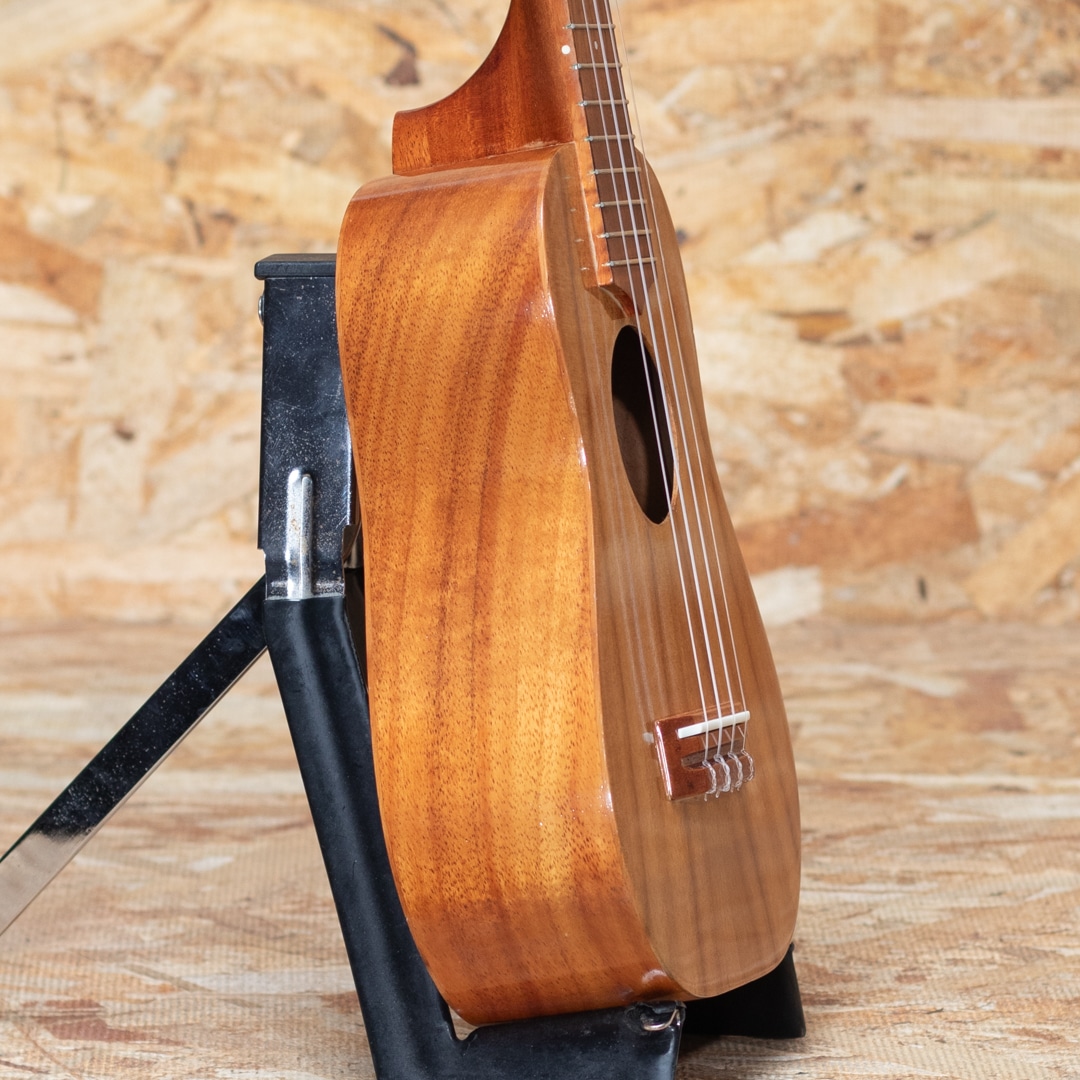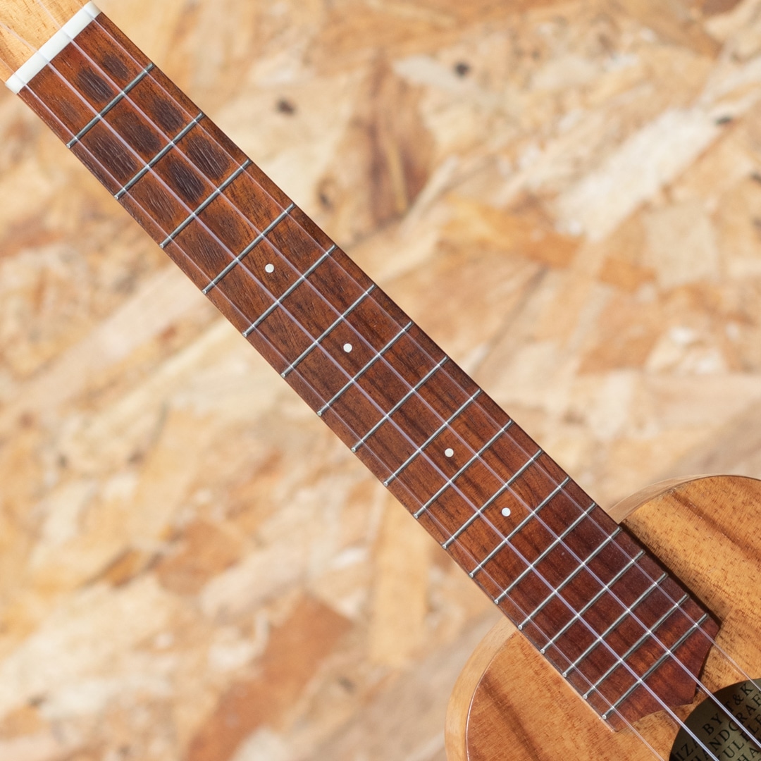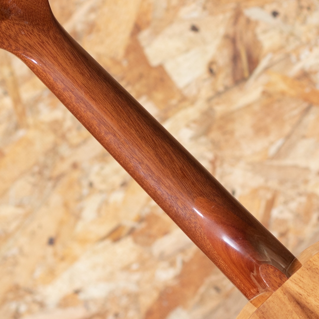 1986年創立のウクレレブランド”セニーザ”。ハワイのオワフ島にて、トーマス&キャサリン夫婦二人で製作されておりましたが、2000年代後半より惜しくも生産を終了してしまいました。現在は中古市場でも希少となっております。夫のトーマス・セニーザは“Valley Made Ukuleles”(ヴァリー・メイド・ウクレレ)の制作者ジェロマ氏の叔父に当たる存在で、代々ウクレレ作りの伝統を受け継いでいる血筋を持っており、製作されるウクレレも味わいのある伝統のハワイアンウクレレそのもの。本器はハワイアンコアボディのソプラノシェイプをベーシックに少し長めの380mmスケールで製作されたロングネック仕様のUSED品です。しっかりとしたボリュームに甘く温かみのある音色。ハワイアンミュージックがよく似合う1本です。ヘッドや部分的にウェザーチェックや僅かに塗装の剥離が見られ、ヘッド裏にはシールを剥がしたような痕が見られますがいずれも雰囲気を損なわない程度の状態です。
