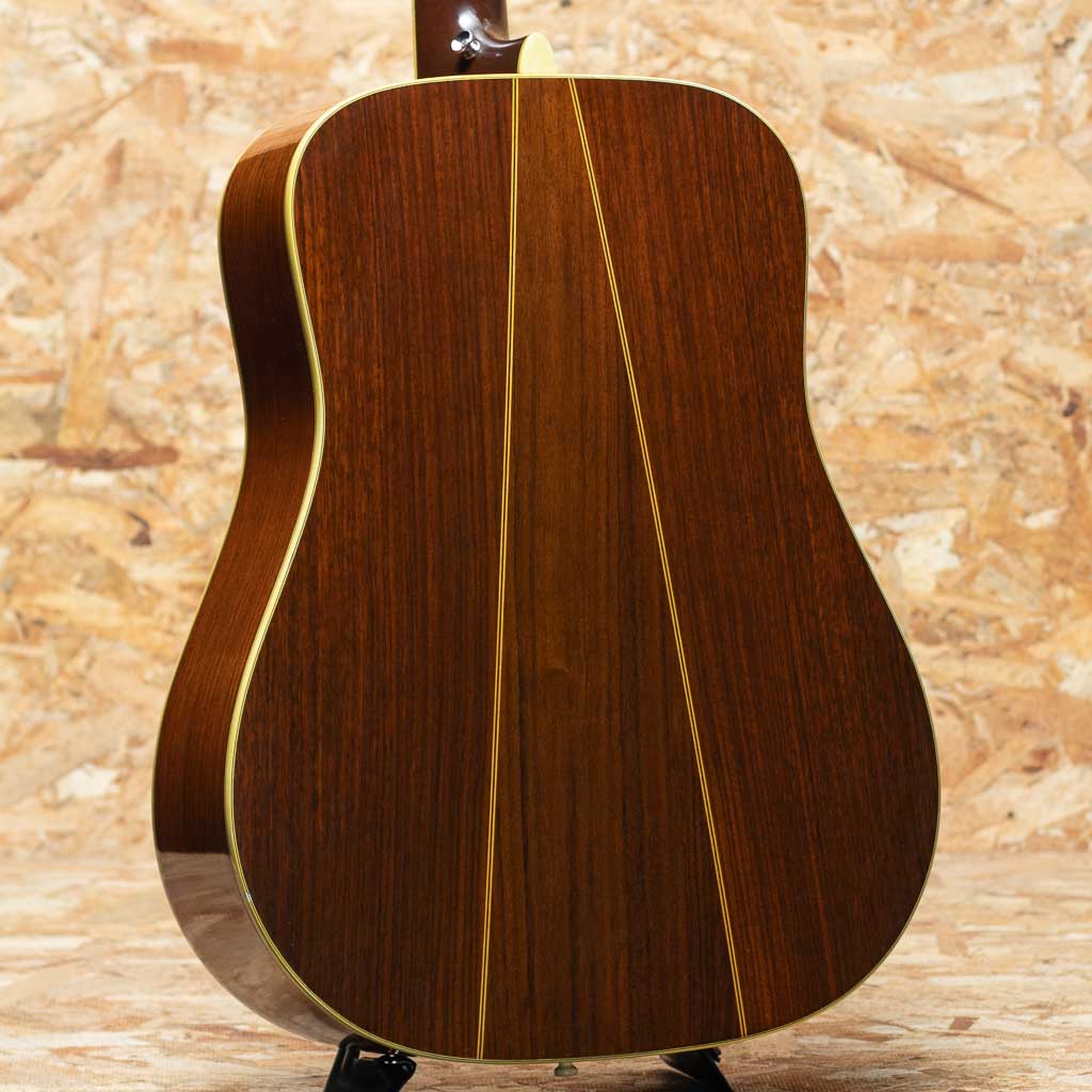 1965年発表のロングセラーモデル"D-35"。それまでのマーチンギターの伝統的な作りを覆したモデルで、その構造故にD-28とは違うサウンドと魅力を堪能できるドレッドノートとしてマーチンギターを語る上で欠かせないモデルです。本器は1976年製USED品。スプルーストップ、インディアンローズウッドサイド&バック、マホガニーネック、エボニー指板&ブリッジ、オリジナルグローバーペグ、パール指板ドット、ブラックピックガード、スクエアロッド、ローズウッドプレート、ノンスキャロップド・エックスブレイシング。良質なハカランダ部材の入手が困難になったことからスリーピースバックのデザインとなって生まれた機種ですが、その整ったトーンバランスやデリケートな高音、スムースなレスポンスが評価され、今日も多くのプレイヤーがこのモデルを愛用しています。また、本器はこの時期特有のSQネックの影響もあり、他の年代と比べてもやや甘く太いサウンドがお楽しみいただけます。ネックヒールにはストラップピンの取り付け、ピックガードは交換がなされており、ガード下にクラックの修正痕がございます。現在の音楽シーンに合わせた弦高に設定するため、僅かにブリッジをシェイプダウン&弦スロットの溝切りがなされており演奏性は非常に良好。現代の奏法、演奏にもストレス無く使っていただけます。傷や打痕はございますが製作年を鑑みると使用感の少ない、おすすめUSED品です。汎用ハードケースが付属いたします。