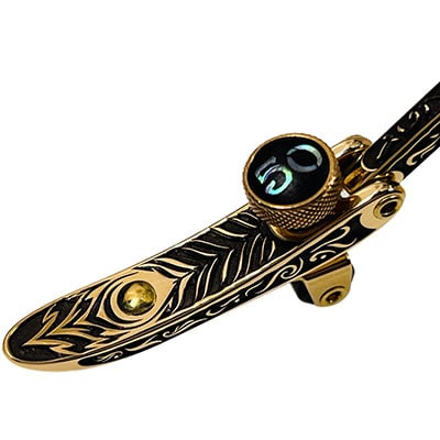 表面全体にセコイアの葉を模した精巧な彫刻が施され、調整ネジにはアバロンとエボニーで「50」の文字が象嵌されたこのカポタストは、まさに見事です。精巧なセコイア風の彫刻と、ネジに象嵌された「50」で飾られた、他に類を見ない真鍮製カポタストです。真鍮が時間とともに生み出す豊かな緑青も、使い込まれた時代を感じることのできるカポタストとなっています。