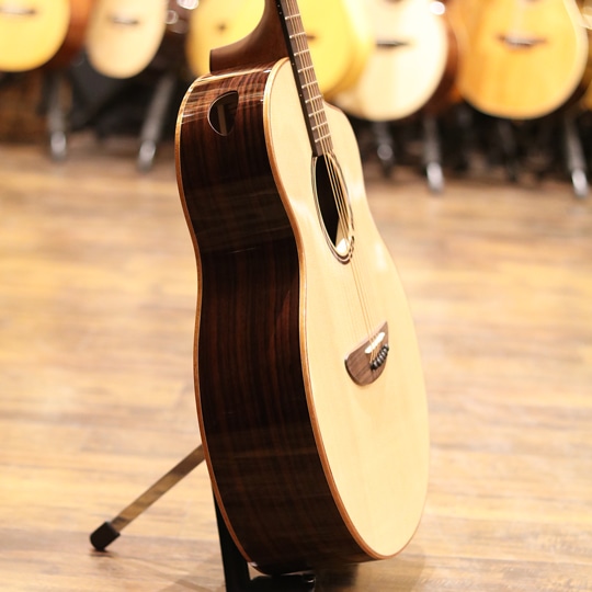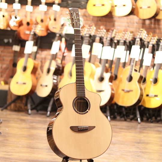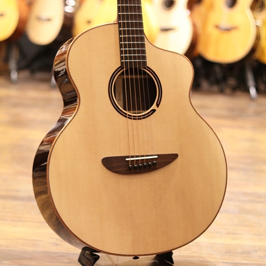 2009年、創始者アドウィン・ライ氏によってマレーシアで誕生した "エル・ルシアー "。デザイン性、コストパフォーマンス性に優れ、ハイクオリティなサウンドとプレイヤビリティを兼ね備えた今注目のアコースティックギターブランドです。本器はフルスケールのスタンダードボディ上位モデル”Eden”。シトカスプルーストップ、インディアンローズウッドサイド&バック、マホガニーネック、ローズウッド指板&ブリッジ、アンティークな風合いのオリジナルペグ、ベネチアンカッタウェイ、ラティスブレーシング。比較的軽量で抱え易く、薄めのネックシェイプでハイポジションまでの運指も容易。優れたセットアップで演奏性も抜群です。サウンドポートにはモニター効果、サラウンド効果があり、ダイレクトでエアリーなサウンドが弾き手自身を立体的に包み込み、極上の弾き心地、聴き心地を体感可能。立ち上がりやレスポンスもよく、バランスの良いサウンドです。ジャンル問わずに扱えるようなオールマイティな1本。個性的なルックスを持ちながら、実用的で優れた演奏性、ハイクオリティなサウンドで人気急上昇中の注目株。ギターを楽しむための要素がふんだんに盛り込まれた上位機種。持ち運びにも便利なギグケース付属です。