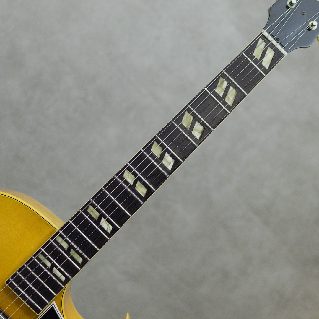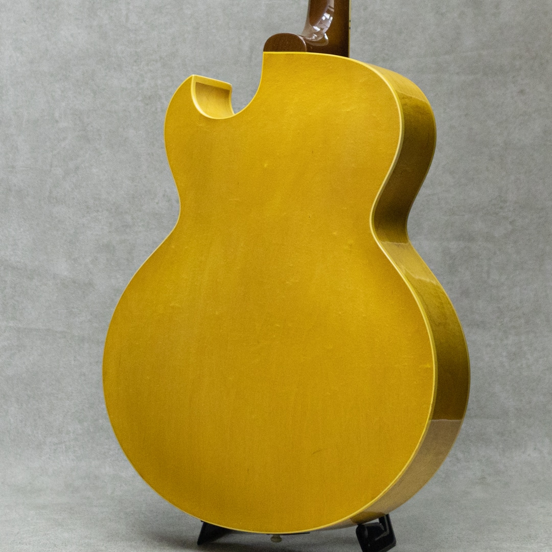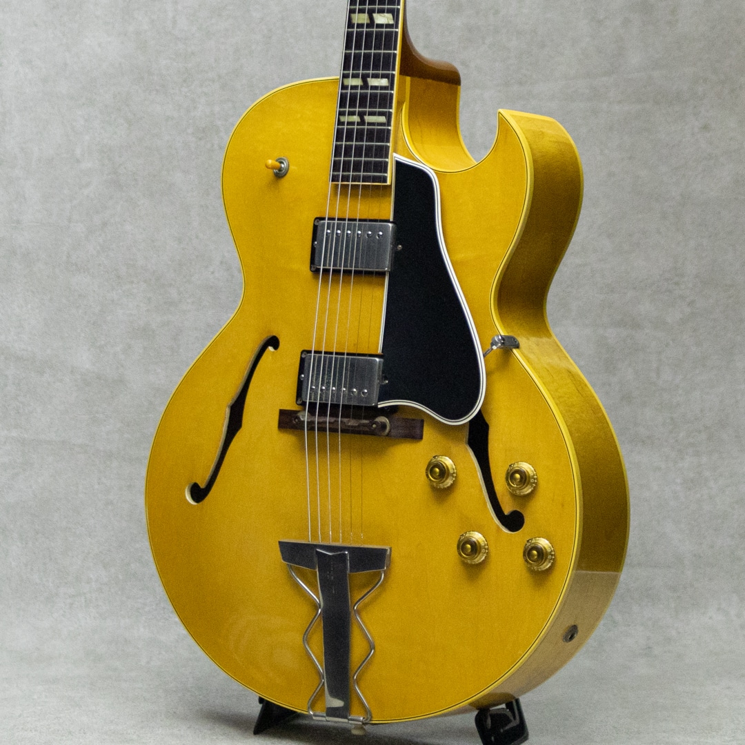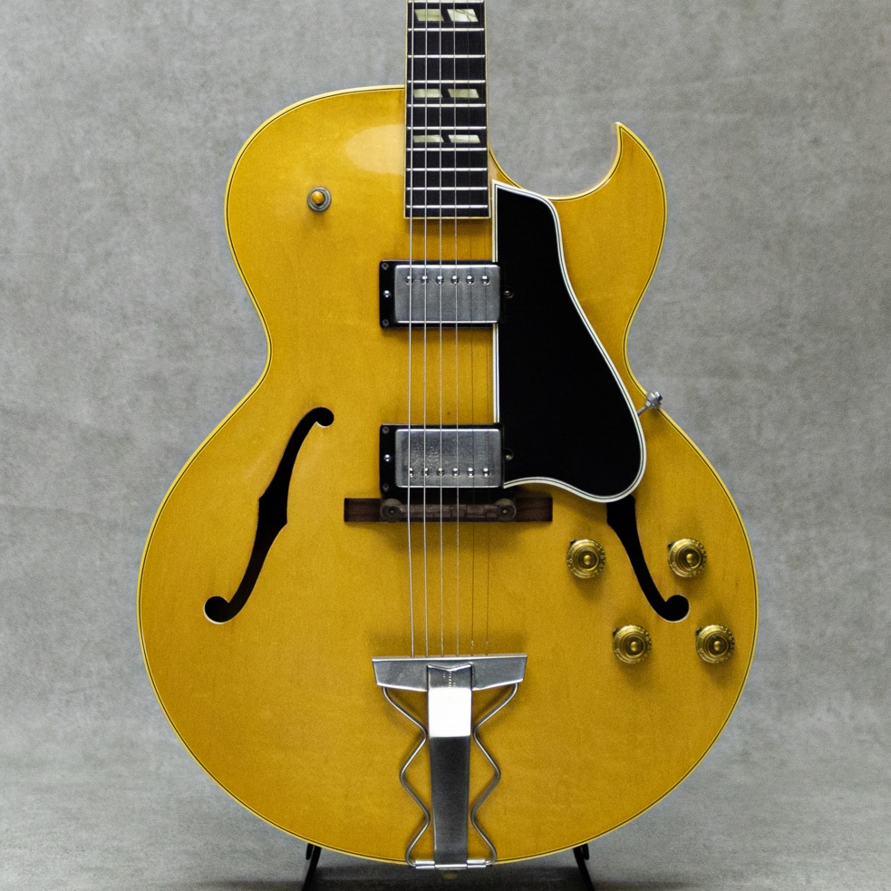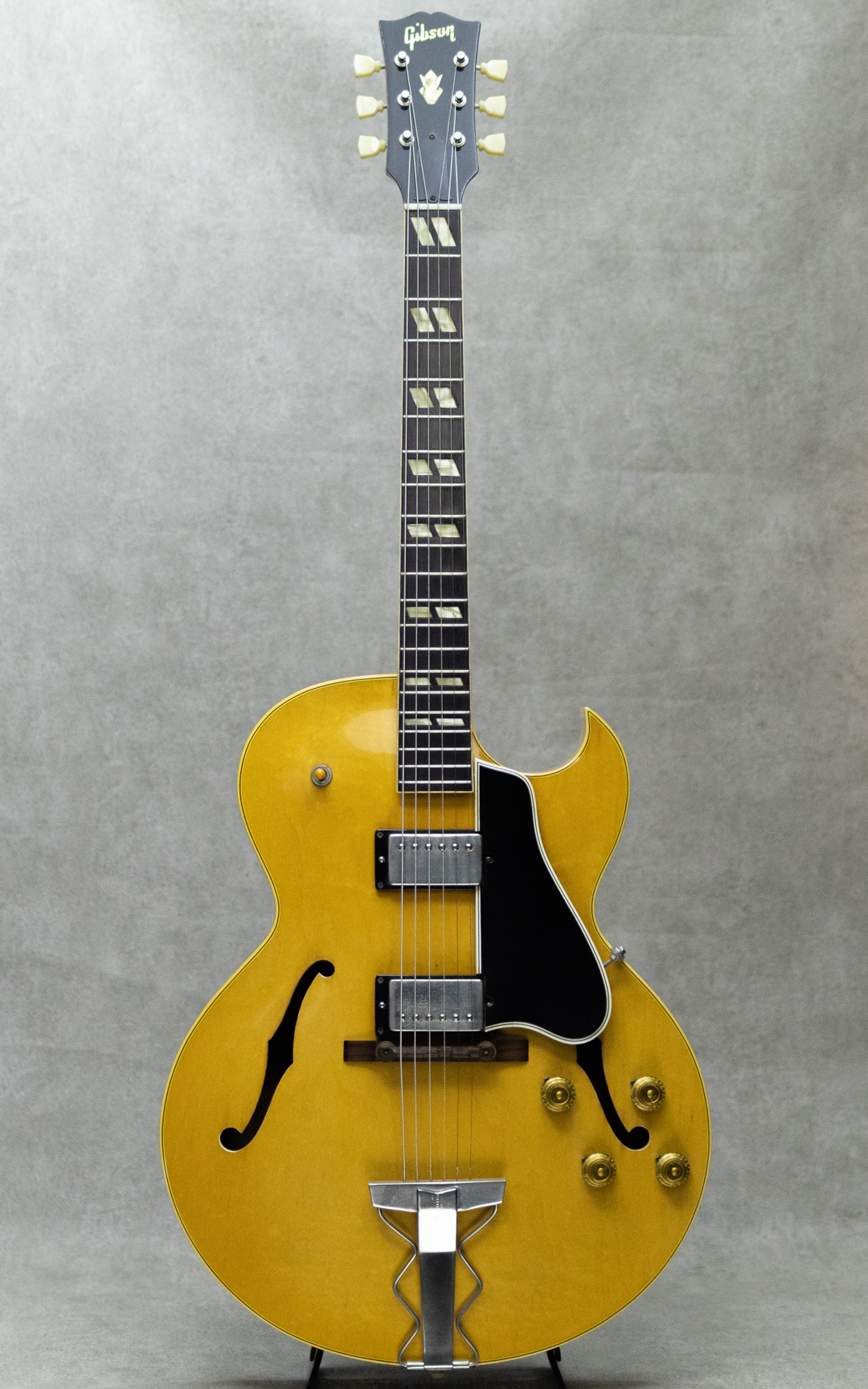 ギブソン”ES-175”。ジャズギターの代名詞とも言えるルックスとサウンドで、長い歴史の中でもっともアイコニックな存在になったフルアコモデルのひとつ。1949年に当時のフラッグシップモデルであった”L-5”に次ぐミッドモデルとして、またラミネイトトップを採用したエレクトリックモデルとして誕生した”ES-175”。”ES”の名の通り、”Electric=電気”の機構を持つ”Spanish=スパニッシュ(横に抱える)”ギターとして、そのラインナップの人気モデルとして、70年近く製造され続けた人気モデルです。本機はそんな175にハムバッカーPUが搭載され始めた最初期の1本、”ES-175DN”。うっすらとフィギュアド杢の浮き出た色気爆発メイプルボディを持つ美しいブロンドカラー、エクセレントコンディションの1958年製ニア・ミントVintage品。揺らめくフィギュアド杢が美しいメイプルラミネイトのフルホロウボディ、経年で色気を放つ美事なブロンドカラーの本器。セルロイドバインディングを持つマホガニーネックにハカランダ指板、ダブルパラレログラムのパーロイド指板インレイ、Gibsonロゴ&クラウンヘッドインレイ、オリジナルシングルラインクルーソンデラックスペグ。指板インレイは若干の痩せは見られますが、欠損はなく良好。細身でなく若干の握り心地のあるネックシェイプで、現行ギブソンの58ネックシェイプでは味わえないしっかりと安心感のありながら決して太くは感じないグッドなネックシェイプ。ピックアップは、オリジナル”P.A.F"の”PU-490”ハムバッキングPUx2が搭載されています。POTやコントロールノブ、ピックガード、”ジグザグ”テイルピースなど、すべてオリジナルパーツを保ち、PUカバーやテイルピースのニッケルメッキも光沢をしっかりと保つエクセレントコンディション。ヌケが良くレンジの広い”P.A.F”サウンド。ギブソン・フルアコモデルならではのピークを踏むトーンサウンドは、無意識にフレーズに彩りを添えてくれます。特にフロントの倍音感はひとしおで、簡単なフレーズを弾くだけで間が埋まっていく、良い楽器にだけ与えられた神力が見られます。極々僅かな小傷とヘッドの弦痕くらいで、ウェザーチェッキングもほとんど見られないニア・ミントコンディション。ネック周りもパーフェクトで、弾きやすいアクションを音詰まりなく保ってくれています。ブルース、ロック、ジャズ、、数多くの音楽に囲まれて経年して来たオリジナル175。弾いてよし愛でてよしのコレクタブルピースの1本です。本体同様にグッドコンディションのオリジナルブラウンハードケースとS/Nマッチドの当時タグも付属します。
