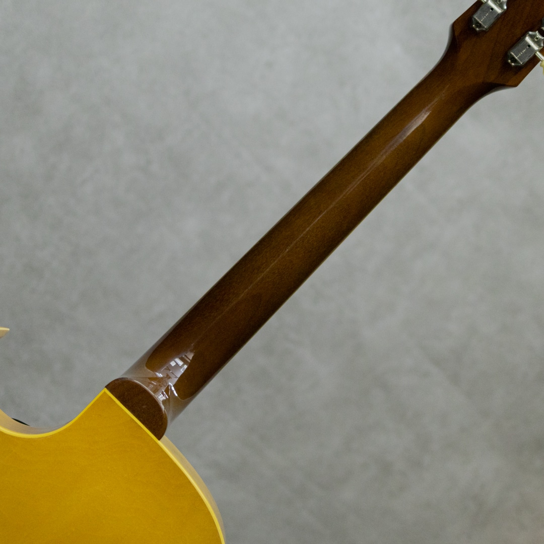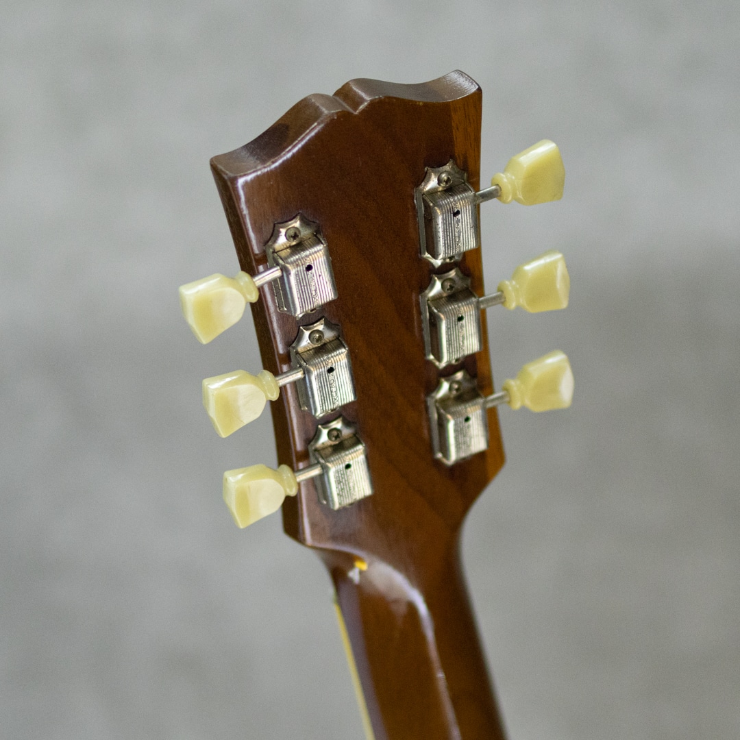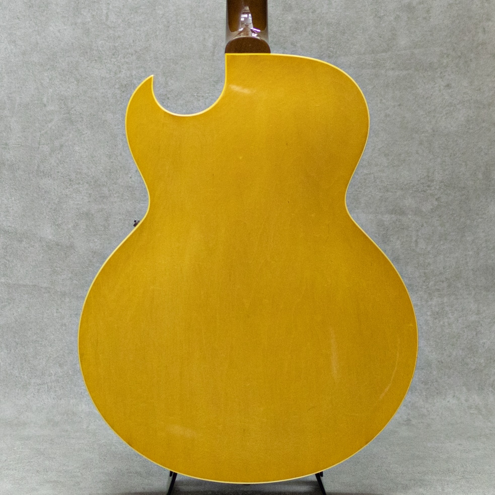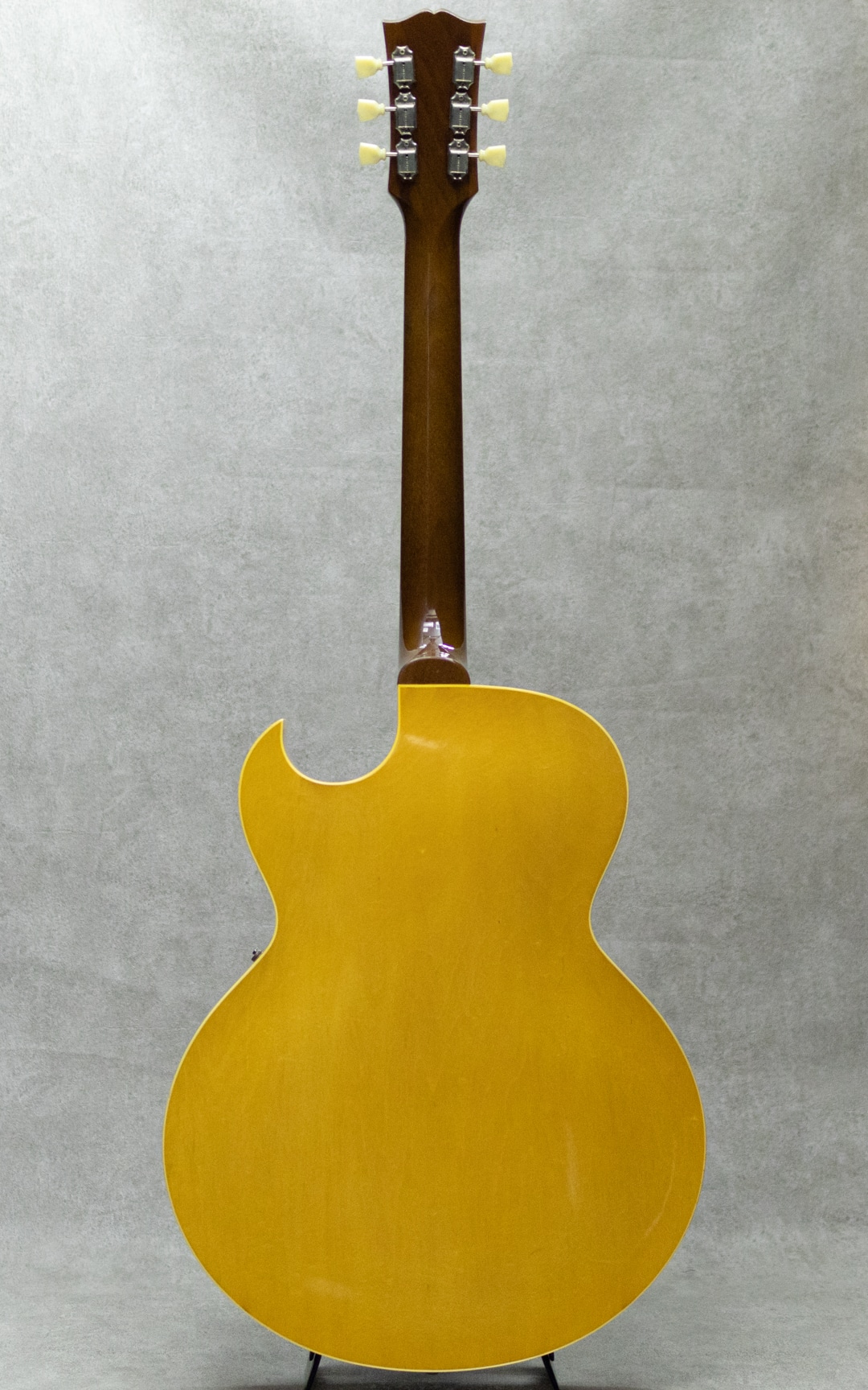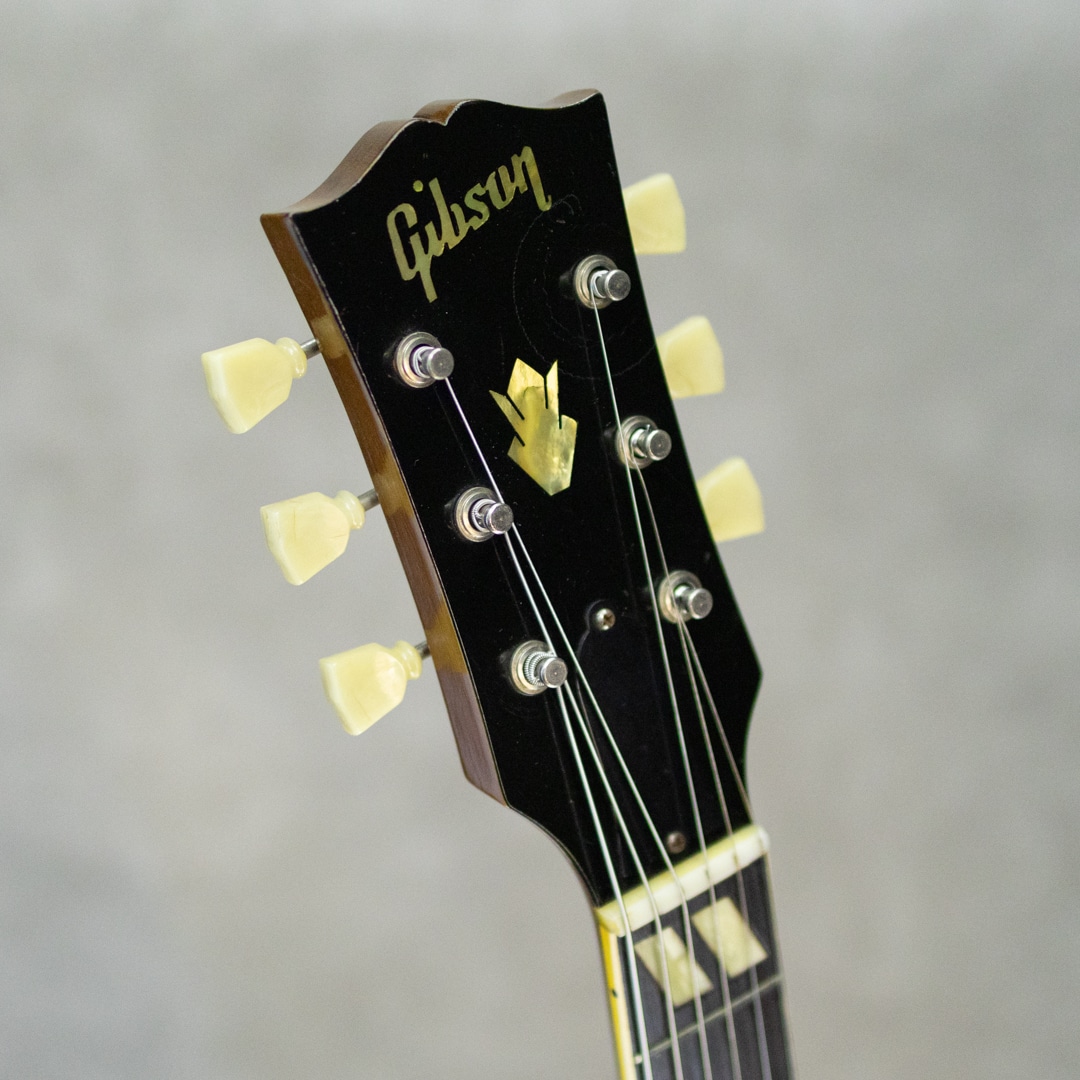 ギブソン”ES-175”。ジャズギターの代名詞とも言えるルックスとサウンドで、長い歴史の中でもっともアイコニックな存在になったフルアコモデルのひとつ。1949年に当時のフラッグシップモデルであった”L-5”に次ぐミッドモデルとして、またラミネイトトップを採用したエレクトリックモデルとして誕生した”ES-175”。”ES”の名の通り、”Electric=電気”の機構を持つ”Spanish=スパニッシュ(横に抱える)”ギターとして、そのラインナップの人気モデルとして、70年近く製造され続けた人気モデルです。本機はそんな175にハムバッカーPUが搭載され始めた最初期の1本、”ES-175DN”。うっすらとフィギュアド杢の浮き出た色気爆発メイプルボディを持つ美しいブロンドカラー、エクセレントコンディションの1958年製ニア・ミントVintage品。揺らめくフィギュアド杢が美しいメイプルラミネイトのフルホロウボディ、経年で色気を放つ美事なブロンドカラーの本器。セルロイドバインディングを持つマホガニーネックにハカランダ指板、ダブルパラレログラムのパーロイド指板インレイ、Gibsonロゴ&クラウンヘッドインレイ、オリジナルシングルラインクルーソンデラックスペグ。指板インレイは若干の痩せは見られますが、欠損はなく良好。細身でなく若干の握り心地のあるネックシェイプで、現行ギブソンの58ネックシェイプでは味わえないしっかりと安心感のありながら決して太くは感じないグッドなネックシェイプ。ピックアップは、オリジナル”P.A.F"の”PU-490”ハムバッキングPUx2が搭載されています。POTやコントロールノブ、ピックガード、”ジグザグ”テイルピースなど、すべてオリジナルパーツを保ち、PUカバーやテイルピースのニッケルメッキも光沢をしっかりと保つエクセレントコンディション。ヌケが良くレンジの広い”P.A.F”サウンド。ギブソン・フルアコモデルならではのピークを踏むトーンサウンドは、無意識にフレーズに彩りを添えてくれます。特にフロントの倍音感はひとしおで、簡単なフレーズを弾くだけで間が埋まっていく、良い楽器にだけ与えられた神力が見られます。極々僅かな小傷とヘッドの弦痕くらいで、ウェザーチェッキングもほとんど見られないニア・ミントコンディション。ネック周りもパーフェクトで、弾きやすいアクションを音詰まりなく保ってくれています。ブルース、ロック、ジャズ、、数多くの音楽に囲まれて経年して来たオリジナル175。弾いてよし愛でてよしのコレクタブルピースの1本です。本体同様にグッドコンディションのオリジナルブラウンハードケースとS/Nマッチドの当時タグも付属します。