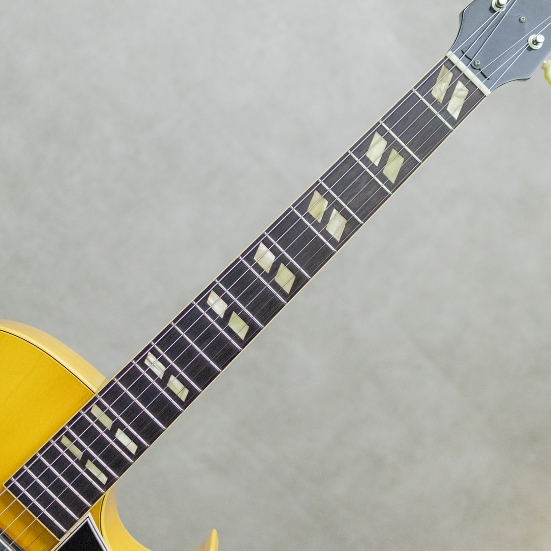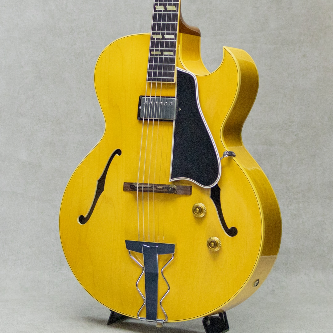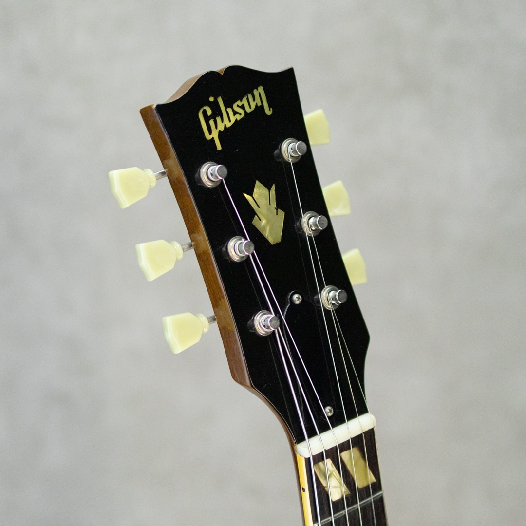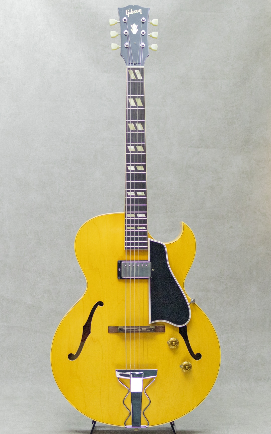 ギブソン”ES-175”。ジャズギターの代名詞とも言えるルックスとサウンドで、長い歴史の中でもっともアイコニックな存在になったフルアコモデルのひとつ。1949年に当時のフラッグシップモデルであった”L-5”に次ぐミッドモデルとして、またラミネイトトップを採用したエレクトリックモデルとして誕生した”ES-175”。”ES”の名の通り、”Electric=電気”の機構を持つ”Spanish=スパニッシュ(横に抱える)”ギターとして、そのラインナップの人気モデルとして、70年近く製造され続けた人気モデルです。本機はそんな175にハムバッカーPUx1が搭載され始めた最初期の1本、”ES-175N”。ゆらめく杢のメイプルボディがお色気たっぷりな美しいブロンドカラー、極上エクセレントコンディションの1958年製ニア・ミントVintage品。うっすら揺らめく杢が美しいメイプルラミネイトのフルホロウボディ、経年で色気を放つ美事なブロンドカラーの本器。セルロイドバインディングを持つマホガニーネックにハカランダ指板、ダブルパラレログラムのパーロイド指板インレイ、Gibsonロゴ&クラウンヘッドインレイ。指板インレイの痩せも最小限の極上コンディション。細身でなく若干の握り心地のあるネックシェイプで、現行ギブソンの58ネックシェイプでは味わえないしっかりと安心感のありながら決して太くは感じないグッドなネックシェイプ。ピックアップは、オリジナル”P.A.F"の”PU-490”ハムバッキングPUx1が搭載されています。POTやコントロールノブ、ピックガード、”ジグザグ”テイルピースなど、すべてオリジナルパーツを保ち、PUカバーやテイルピースのニッケルメッキも光沢をしっかりと保つ極上エクセレントコンディション。オリジナルシングルラインクルーソンデラックスペグのノブがシュリンクしているため、現在はリプレイスメントパーツを装着していますが、ケース内にオリジナルペグも残されています。見た目に違わぬお色気たっぷりなサウンド。ワンPUならではの豊かでレンジの広い倍音感。ファットで甘く、メロウな響きを魅せながら、素直に抜けていく極上トーン。ギブソン・フルアコモデルならではのピークを踏むトーンサウンドが、たまらなく心地よい1本です。使用感もほとんど伺えないほどで、極々僅かな小傷が見られる程度。ウェザーチェッキングもほとんど見られないニア・ミントコンディションです。ネック周りもパーフェクトで、弾きやすいアクションを音詰まりなく保ってくれています。ブルース、ロック、ジャズ、、数多くの音楽に囲まれて経年して来たオリジナル175。弾いてよし愛でてよしのコレクタブル・マスターピースの1本です。本体同様にグッドコンディションのオリジナルブラウンハードケースが付属します。