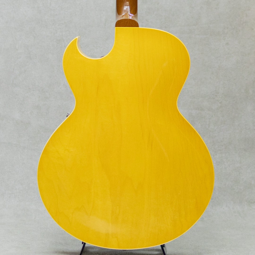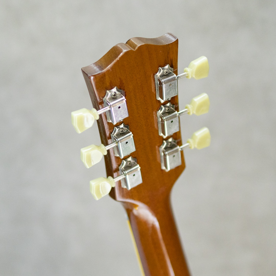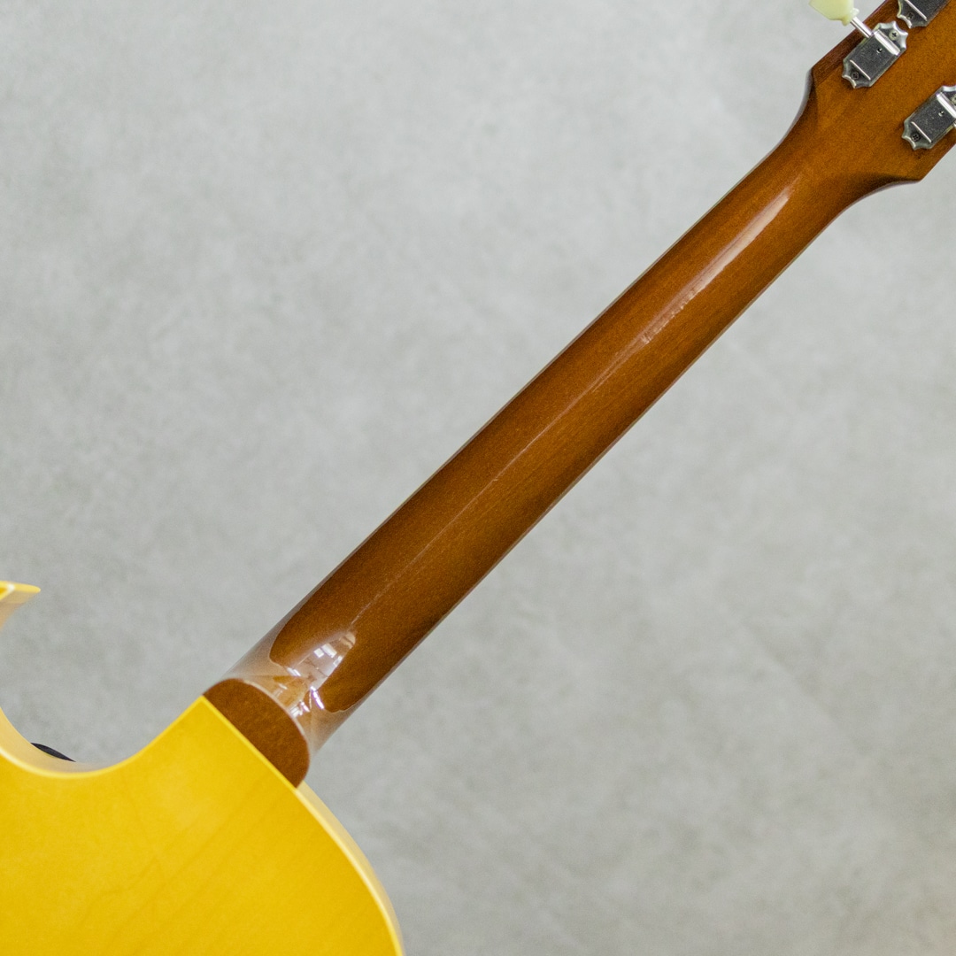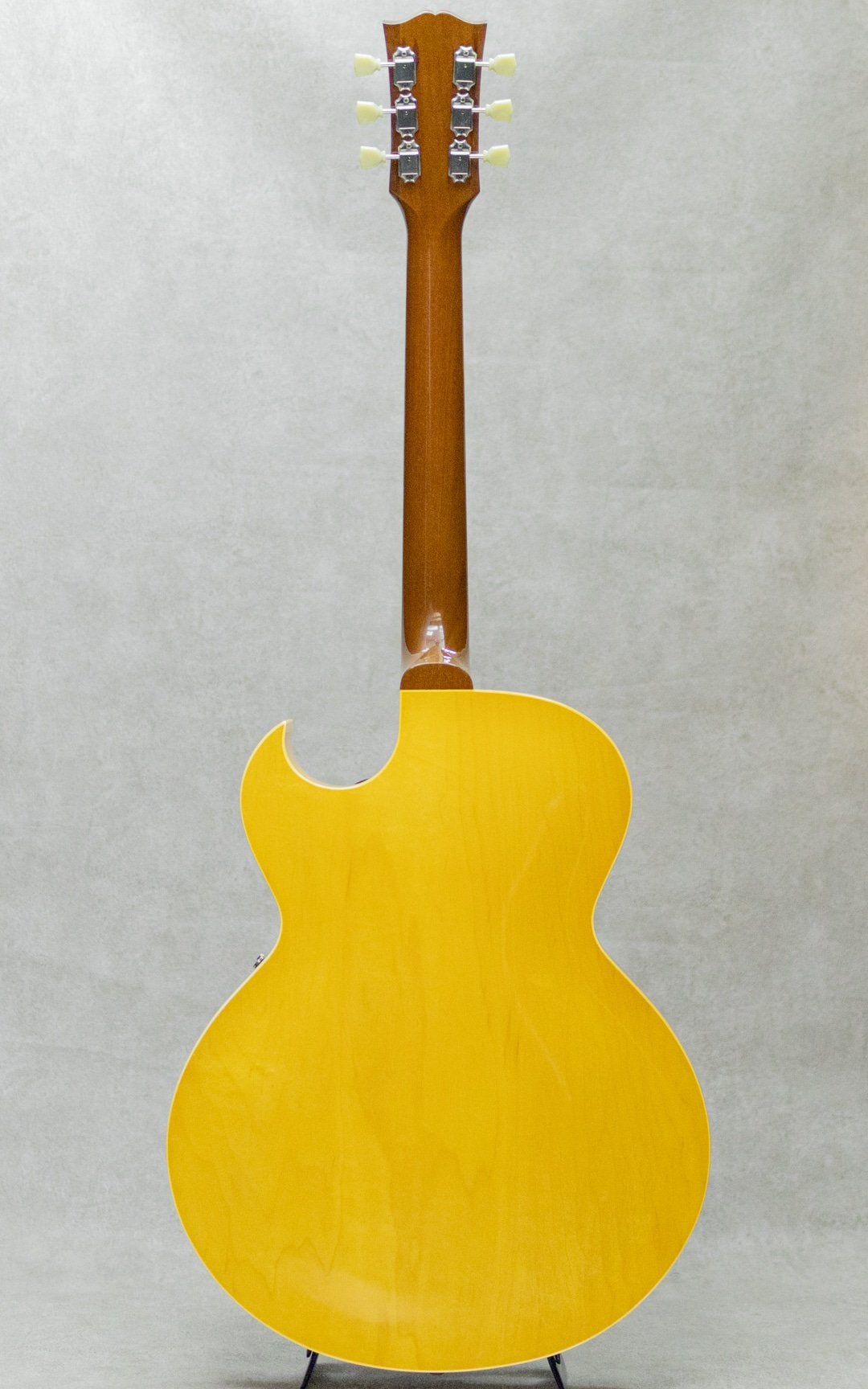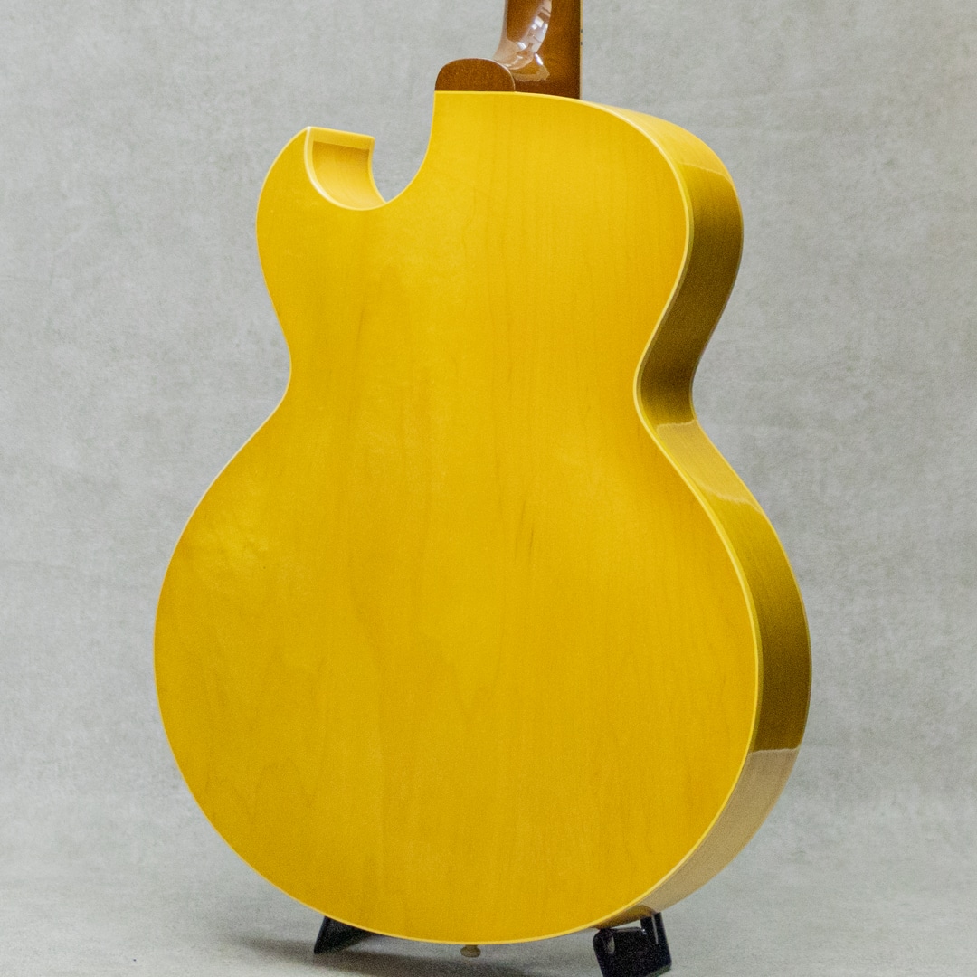 ギブソン”ES-175”。ジャズギターの代名詞とも言えるルックスとサウンドで、長い歴史の中でもっともアイコニックな存在になったフルアコモデルのひとつ。1949年に当時のフラッグシップモデルであった”L-5”に次ぐミッドモデルとして、またラミネイトトップを採用したエレクトリックモデルとして誕生した”ES-175”。”ES”の名の通り、”Electric=電気”の機構を持つ”Spanish=スパニッシュ(横に抱える)”ギターとして、そのラインナップの人気モデルとして、70年近く製造され続けた人気モデルです。本機はそんな175にハムバッカーPUx1が搭載され始めた最初期の1本、”ES-175N”。ゆらめく杢のメイプルボディがお色気たっぷりな美しいブロンドカラー、極上エクセレントコンディションの1958年製ニア・ミントVintage品。うっすら揺らめく杢が美しいメイプルラミネイトのフルホロウボディ、経年で色気を放つ美事なブロンドカラーの本器。セルロイドバインディングを持つマホガニーネックにハカランダ指板、ダブルパラレログラムのパーロイド指板インレイ、Gibsonロゴ&クラウンヘッドインレイ。指板インレイの痩せも最小限の極上コンディション。細身でなく若干の握り心地のあるネックシェイプで、現行ギブソンの58ネックシェイプでは味わえないしっかりと安心感のありながら決して太くは感じないグッドなネックシェイプ。ピックアップは、オリジナル”P.A.F"の”PU-490”ハムバッキングPUx1が搭載されています。POTやコントロールノブ、ピックガード、”ジグザグ”テイルピースなど、すべてオリジナルパーツを保ち、PUカバーやテイルピースのニッケルメッキも光沢をしっかりと保つ極上エクセレントコンディション。オリジナルシングルラインクルーソンデラックスペグのノブがシュリンクしているため、現在はリプレイスメントパーツを装着していますが、ケース内にオリジナルペグも残されています。見た目に違わぬお色気たっぷりなサウンド。ワンPUならではの豊かでレンジの広い倍音感。ファットで甘く、メロウな響きを魅せながら、素直に抜けていく極上トーン。ギブソン・フルアコモデルならではのピークを踏むトーンサウンドが、たまらなく心地よい1本です。使用感もほとんど伺えないほどで、極々僅かな小傷が見られる程度。ウェザーチェッキングもほとんど見られないニア・ミントコンディションです。ネック周りもパーフェクトで、弾きやすいアクションを音詰まりなく保ってくれています。ブルース、ロック、ジャズ、、数多くの音楽に囲まれて経年して来たオリジナル175。弾いてよし愛でてよしのコレクタブル・マスターピースの1本です。本体同様にグッドコンディションのオリジナルブラウンハードケースが付属します。