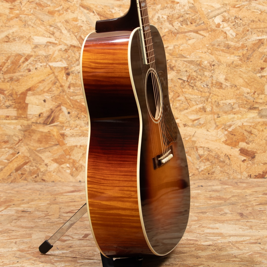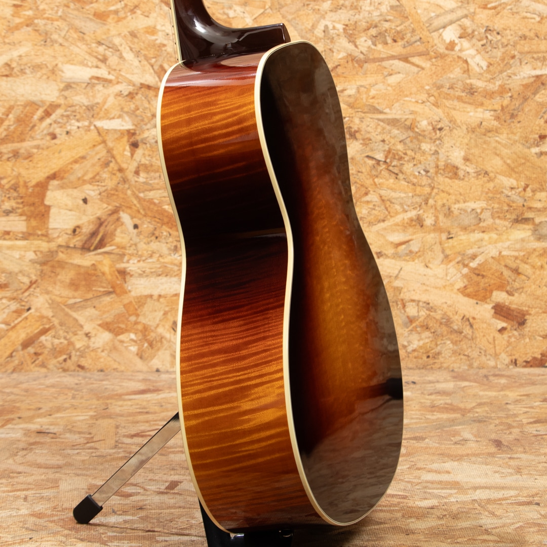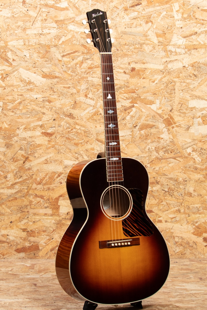 米国のウェストハートフォードに工房を開く"Dale Fairbanks(デイル・フェアバンクス)"が製作する"Fairbanks Guitars"。このギターはニューヨークにあるウッドストックという町で行われたルシアーギターの祭典"Woodstock Luthiers Showcase"のショーモデルで、伝統的なギブソンニックルーカスモデルを踏襲した上質の一台。2015年製USED品。レッドスプルーストップ、細かなフレイム杢のメイプルサイド&バック、ホンジュラスマホガニーネック、マダガスカルローズウッド指板&レクタングルブリッジ、ウェバリーペグ、ニックルーカス・スタイル指板インレイ、ファイアストライプピックガード、アイボロイドロゼッタ&バインディング、サンバーストカラー、トーンバー三本のエックスブレイシング。プレイアクションの良さ、サイズ感を超える音圧、ヴィンテージを彷彿とさせるような軽く抜けるトーンなど、個性が詰まった作品。全体に軽微な使用感、表板サウンドホール周りに弾き傷がありますが、ネックを含む演奏上のコンディションは大変良好です。ブルース主体のフィンガーピッキングからメロディアスなソロギター、歌ものまで万能に対応できる1本。市場にも流通は少なく、大変貴重な1本です。汎用ハードケース付属。