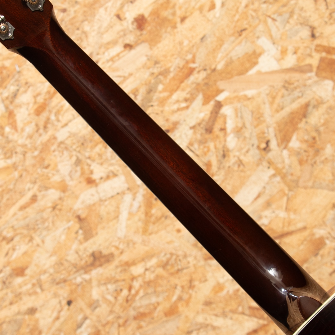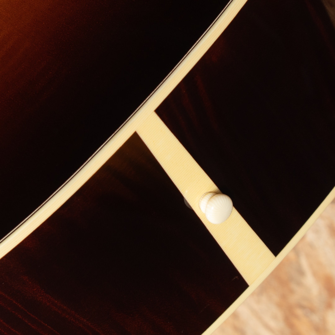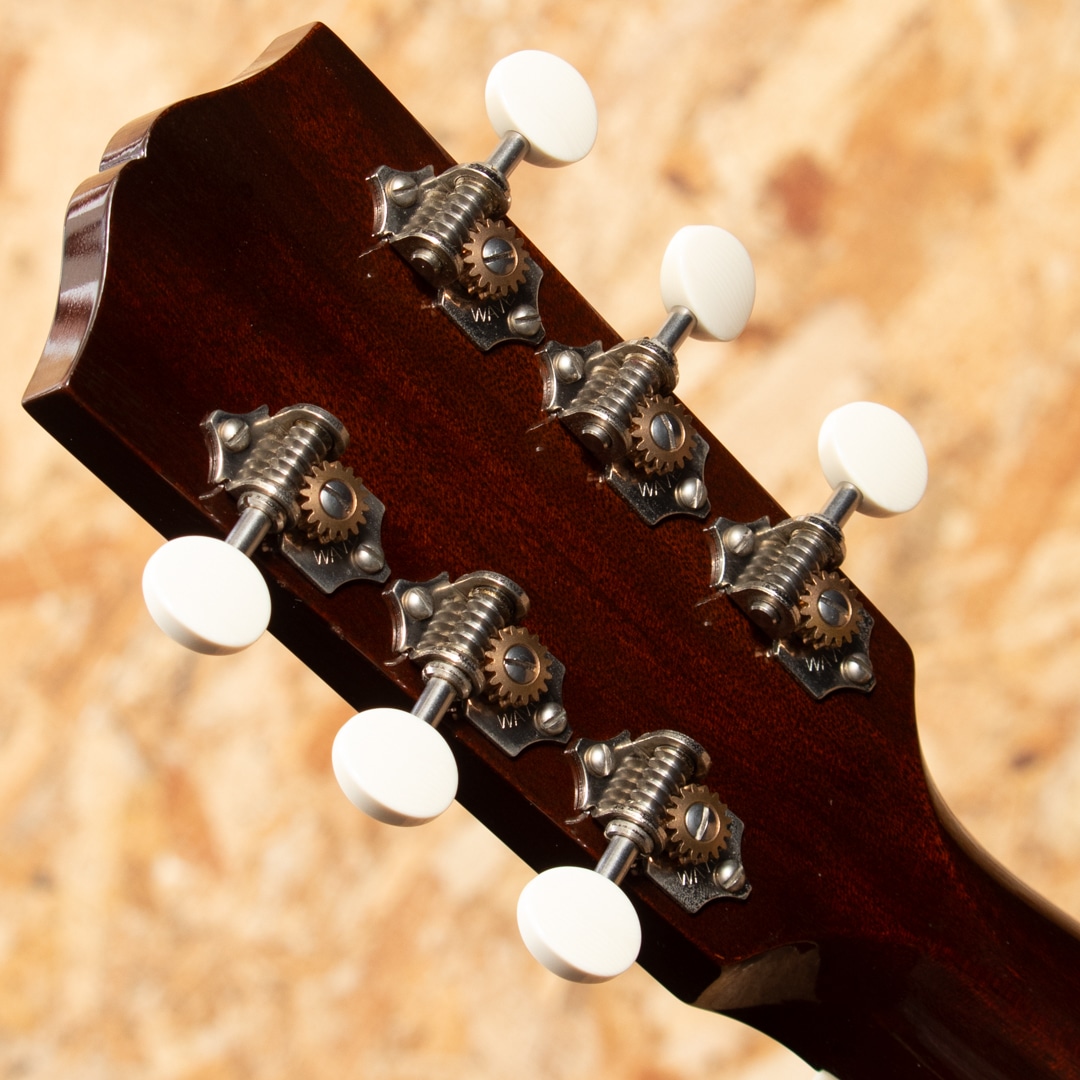 米国のウェストハートフォードに工房を開く"Dale Fairbanks(デイル・フェアバンクス)"が製作する"Fairbanks Guitars"。このギターはニューヨークにあるウッドストックという町で行われたルシアーギターの祭典"Woodstock Luthiers Showcase"のショーモデルで、伝統的なギブソンニックルーカスモデルを踏襲した上質の一台。2015年製USED品。レッドスプルーストップ、細かなフレイム杢のメイプルサイド&バック、ホンジュラスマホガニーネック、マダガスカルローズウッド指板&レクタングルブリッジ、ウェバリーペグ、ニックルーカス・スタイル指板インレイ、ファイアストライプピックガード、アイボロイドロゼッタ&バインディング、サンバーストカラー、トーンバー三本のエックスブレイシング。プレイアクションの良さ、サイズ感を超える音圧、ヴィンテージを彷彿とさせるような軽く抜けるトーンなど、個性が詰まった作品。全体に軽微な使用感、表板サウンドホール周りに弾き傷がありますが、ネックを含む演奏上のコンディションは大変良好です。ブルース主体のフィンガーピッキングからメロディアスなソロギター、歌ものまで万能に対応できる1本。市場にも流通は少なく、大変貴重な1本です。汎用ハードケース付属。
