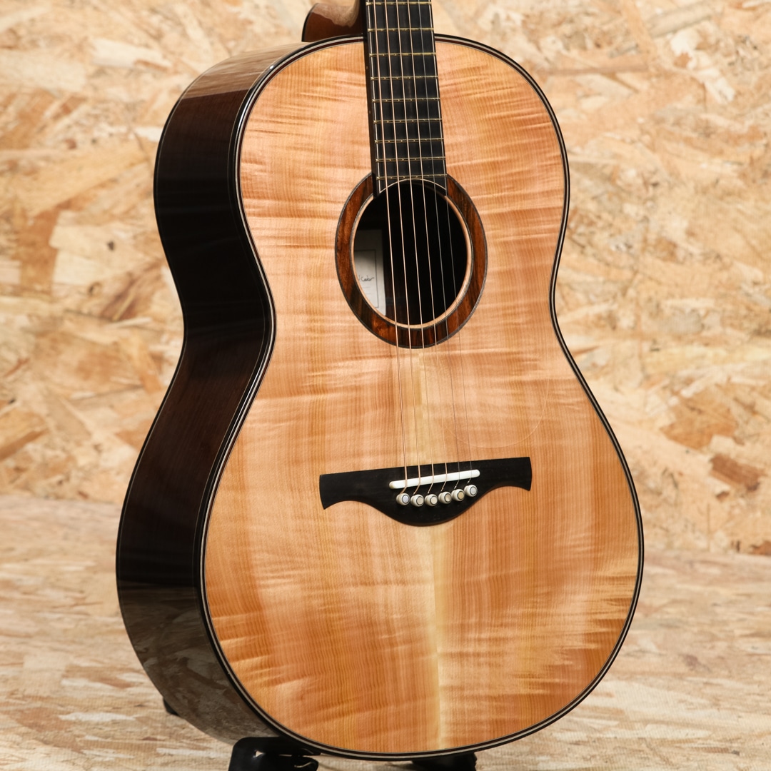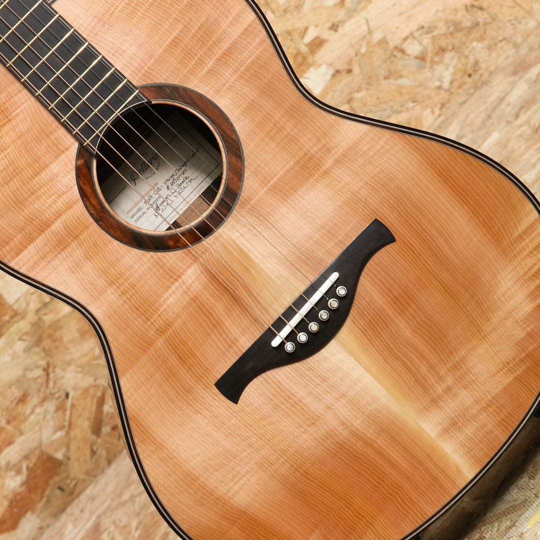 トップに採用されているフィギャードレッドシダーはカナダ、ブリティッシュコロンビア州の太平洋岸沖の群島「Haida Gwaii(ハイダ・グワイ)」に何十年も眠っていた古材をサルベージした非常に希少な材。本来は木目が出づらい材ながらエキゾチックな杢が出ており、一目で特別な希少材であることが伺えます。また、ブレーシングにも100年前の古材であるレッドスプルースを使用しており、希少な材を惜しみなく注ぎ込んだ豪華なスペックを誇ります。