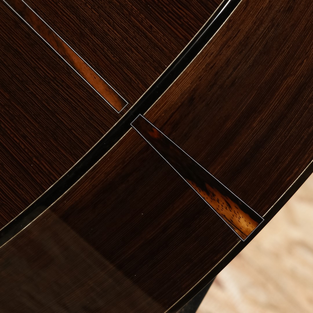 フィギャードレッドシダートップ、ウェンジダブルレイヤーサイド、ウェンジバック、Cシェイプスパニッシュシダーネック、ガブーンエボニー指板&ブリッジ、ウェンジヘッド化粧板、メイプルヘッド&指板パーフリング、エボニー&メイプルバインディング、ゴールド・エボフレット、シャートラーエボニーボタンゴールドペグ、ボディ内セラックフィニッシュ。