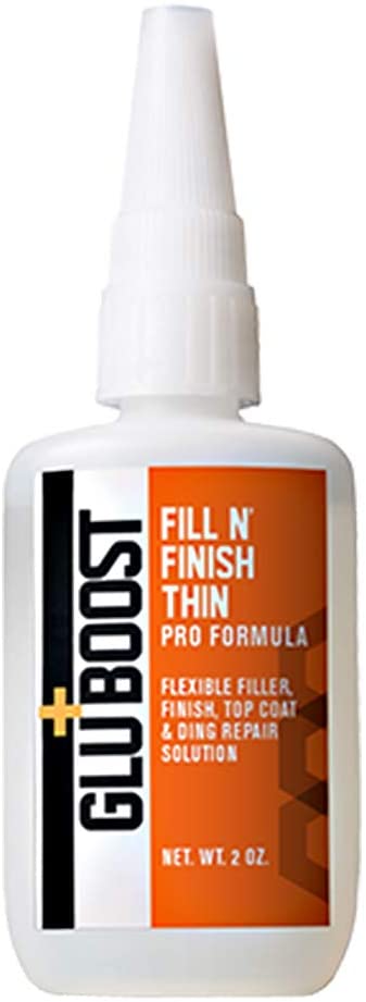 Fill n'Finish Pro Formula Thinはクリアで、柔軟性があり、塗装表面で斑らになりにくい接着剤。 ラッカー、ポリ、ウレタンなどの塗装に反応しない為、塗装面の凹みの埋めや塗装修理箇所のトップコートとしてもご使用いただけます。