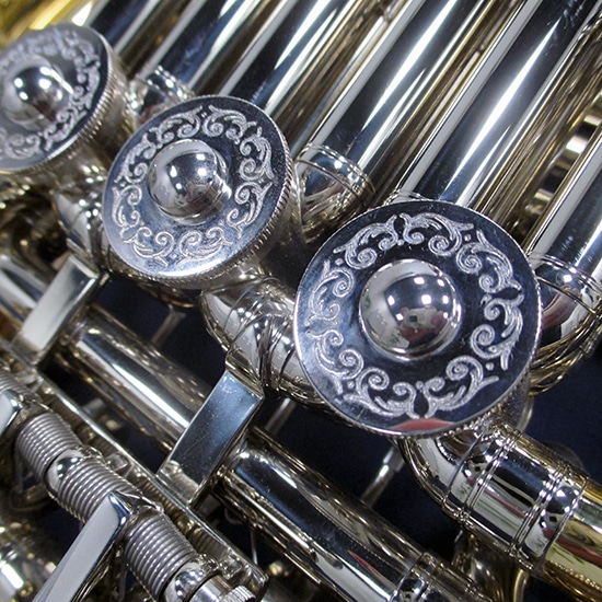 ボールジョイントによるスムーズな操作性、エクストララージベルが奏でる独特な音色は多くの奏者から高く評価されています。手の大きさに合わせて可動させられるフィンガーフック(指掛け)を採用するなど細部まで考えられた数々のメカニズムがプレイヤーの負担を軽減します。