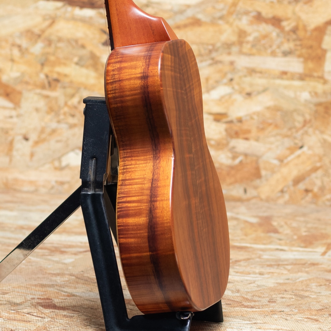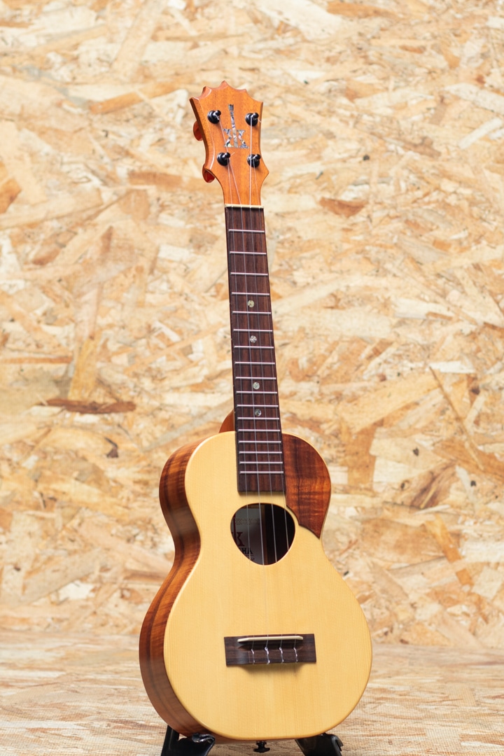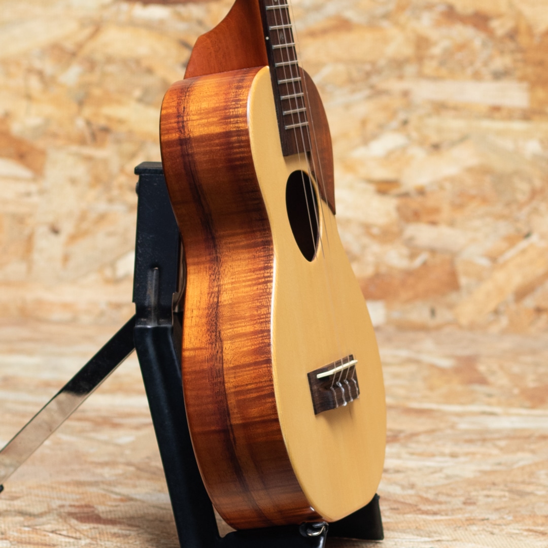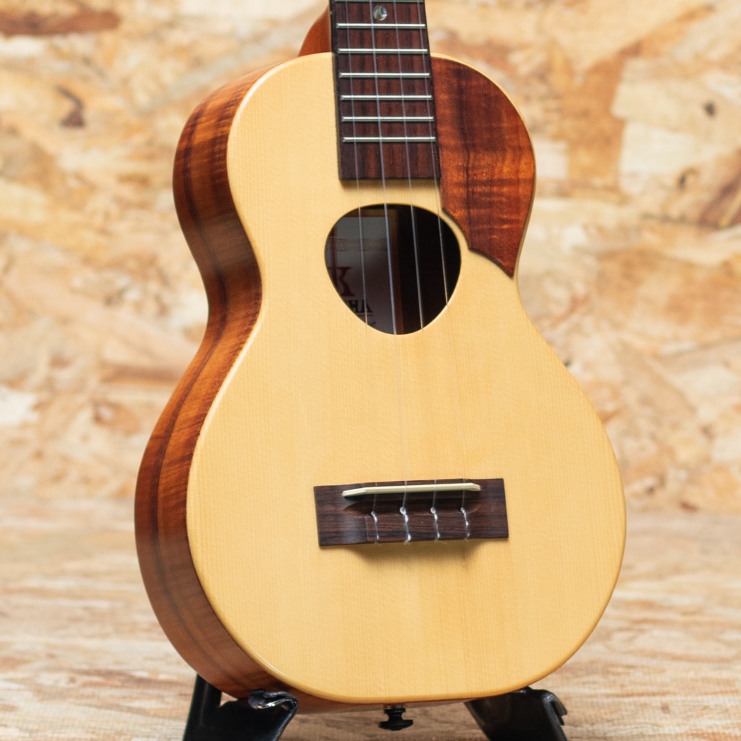 アルヴィン・オカミにより1995年に創設されたコアロハ・ウクレレ。現在は長男で社長のアランと、次男で副社長のポールを中心に、少数精鋭にて運営されております。今ではハワイを代表するウクレレメーカーの一つとなったコアロハ。モダンなルックスデザイン、優れた演奏性で、他のメーカーにはないハイファイでクリア、そしてなんと言っても大きな音量が特徴。本器は入荷も少ないスペシャルイシューのUSED品。こちらはトップにスプルース、サイド&バックにきれいなカーリー杢のハワイアンコア材を使用したコンサートモデル。マホガニーネック、ローズウッド指板&ブリッジ、ゴトー製プラネタリーペグ搭載。ハワイアンコアのピックガードでルックスも良く、より高級感が感じられます。スプルーストップでよりパワフルでハリのあるサウンドです。1弦ブリッジ下付近にやや大きめの打痕傷、その他小傷、打痕等は見られますが比較的きれいな状態が保たれています。なかなか見かけないスペシャルイシューモデル。セミライトケースが付属します。