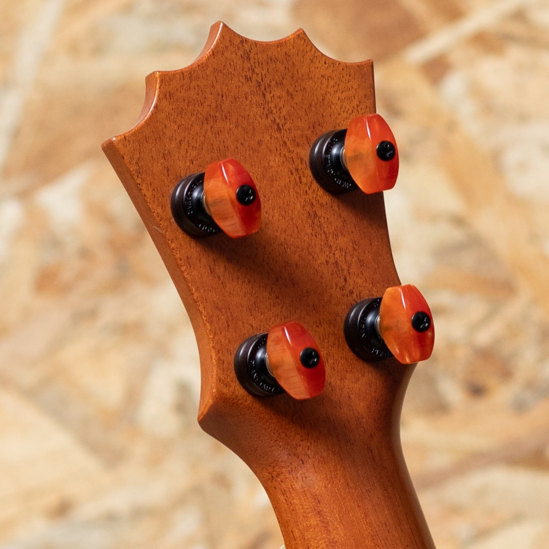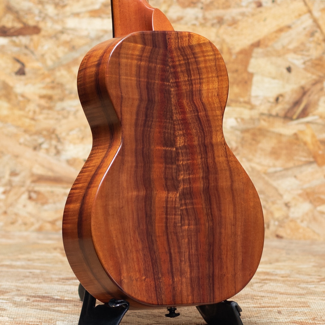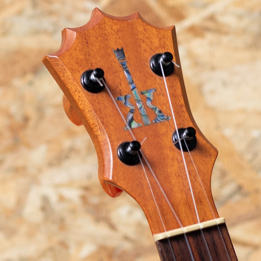 アルヴィン・オカミにより1995年に創設されたコアロハ・ウクレレ。現在は長男で社長のアランと、次男で副社長のポールを中心に、少数精鋭にて運営されております。今ではハワイを代表するウクレレメーカーの一つとなったコアロハ。モダンなルックスデザイン、優れた演奏性で、他のメーカーにはないハイファイでクリア、そしてなんと言っても大きな音量が特徴。本器は入荷も少ないスペシャルイシューのUSED品。こちらはトップにスプルース、サイド&バックにきれいなカーリー杢のハワイアンコア材を使用したコンサートモデル。マホガニーネック、ローズウッド指板&ブリッジ、ゴトー製プラネタリーペグ搭載。ハワイアンコアのピックガードでルックスも良く、より高級感が感じられます。スプルーストップでよりパワフルでハリのあるサウンドです。1弦ブリッジ下付近にやや大きめの打痕傷、その他小傷、打痕等は見られますが比較的きれいな状態が保たれています。なかなか見かけないスペシャルイシューモデル。セミライトケースが付属します。