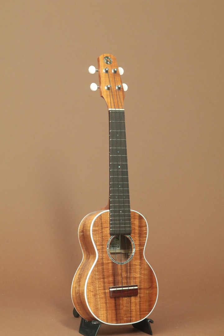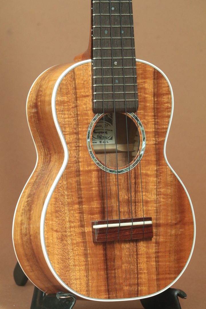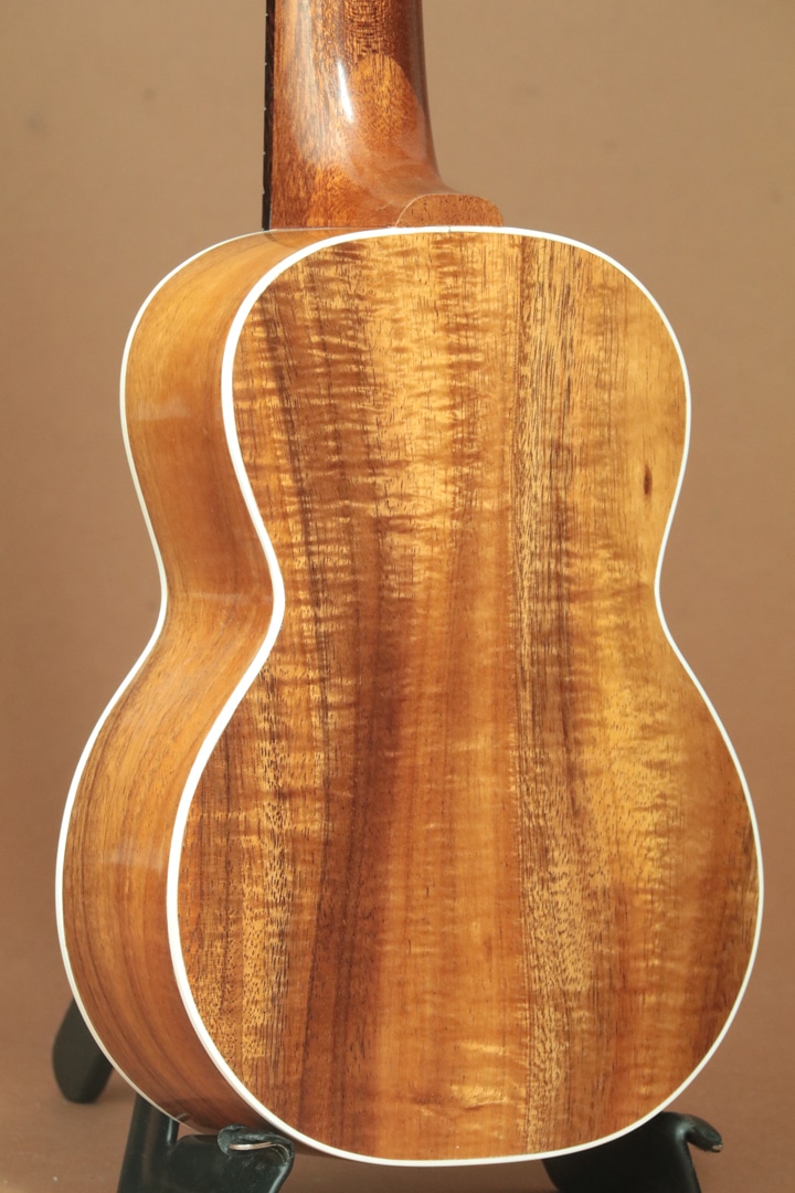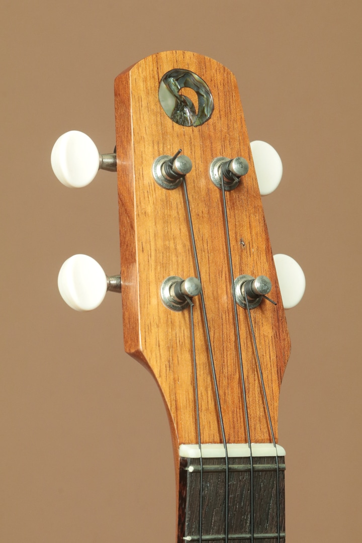 現在京都市の”占部弦楽器製作所”にて占部一家と同居しながら、自身のブランドを手掛けている”丸山嘉宏”氏の作品。コントラバスやチェロ等のクラシック楽器、そしてアーチトップギターの製作で有名な”チャキ弦楽器製作所”にて6年程務め、その後、2002~2003年の間、同製作所の先輩に当たる名工”占部英明”氏の立ち上げた”占部弦楽器製作所”にてウクレレ製作を担っていました。そして2005年よりカナダへ移住。トロントにある建築模型製作会社に努め、ビルやマンション、公共施設等、様々な建築模型の製作に携わり、その傍らで個人的に楽器製作。2012年にはハワイへ移住。ハワイ島コナ、キャプテン・クック地区にて製材所、木工所へ務め、やはりその傍らでは楽器製作。ギター、ウクレレ、ワイゼンボーンまで様々な楽器を手掛けます。そして2017年帰国。再び”占部弦楽器製作所”を訪ね、現在に至ります。チャキ、占部氏の下で基礎を築き、海外で独創性、創作性、木工技術を磨き、ハワイで独自の良材入手ルートを獲得。様々な経験を重ね、どんな時も楽器製作を続けてきた彼がまた原点とも言える占部氏の下へ。現在丸山氏が手掛ける楽器に占部氏は関与しておらず、ボディシェイプ、内部構造等も含め、オリジナルのウクレレとなっております。本器は丸みのある愛らしいフォルムに、やや長めのスケールを当てたソプラノモデル。ボディ材はもちろんハワイで手に入れた純正のハワイアンコア材。柔らかさと張りの具合が絶妙で、音の立ち上がり、胴の鳴り方も”丁度良い”。演奏性、音響特性ともにツボを押さえたウクレレとなっております。ヘッドのインレイは”禅”の”円相”すなわち”丸”の一筆書きを表しており、自身の名前にも掛けているとのこと。海外に長く滞在していたため、日本へのこだわりも募り、このブランド名に。新進気鋭の個人製作家ブランド”maruyama shōten”。今後大注目です。