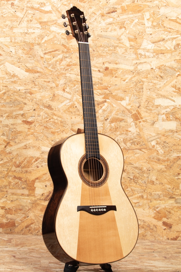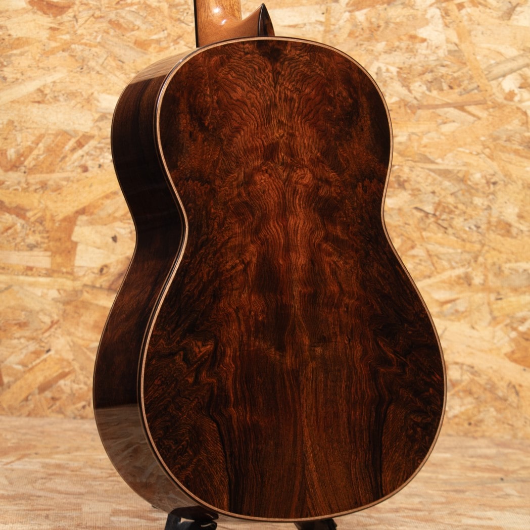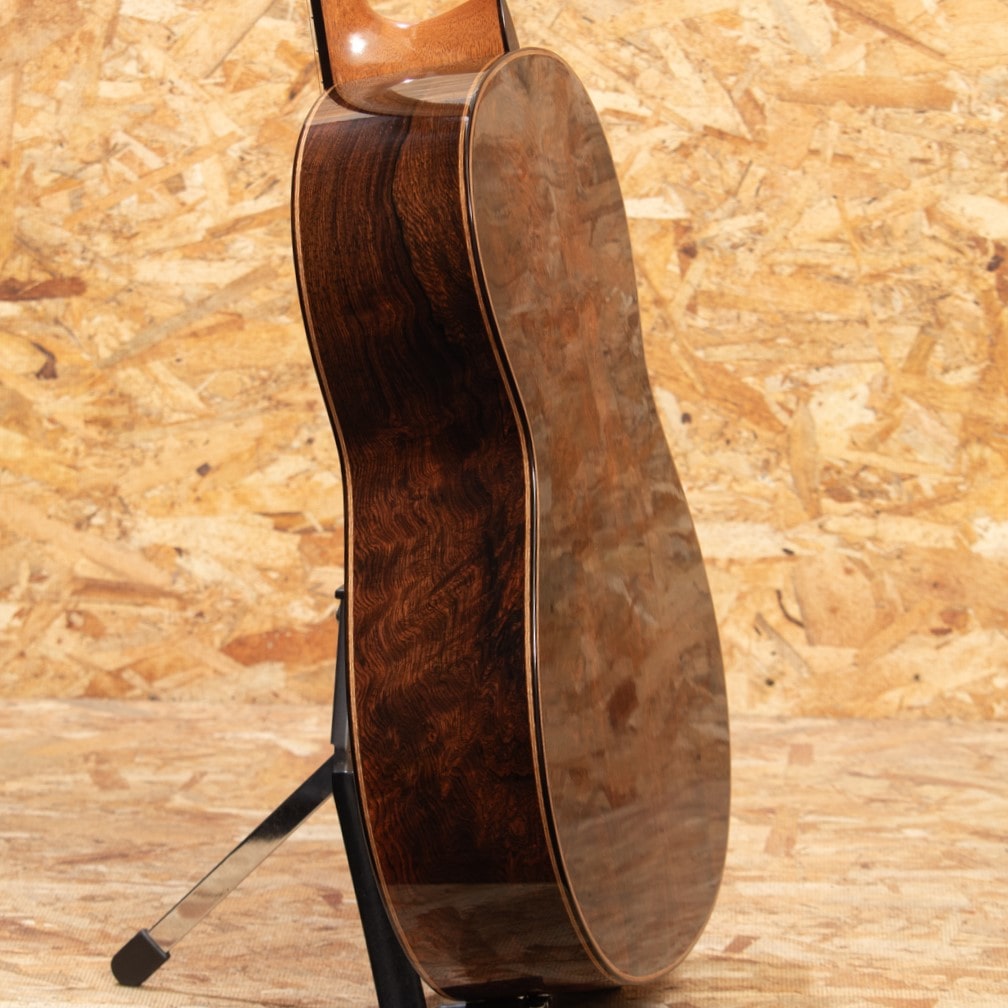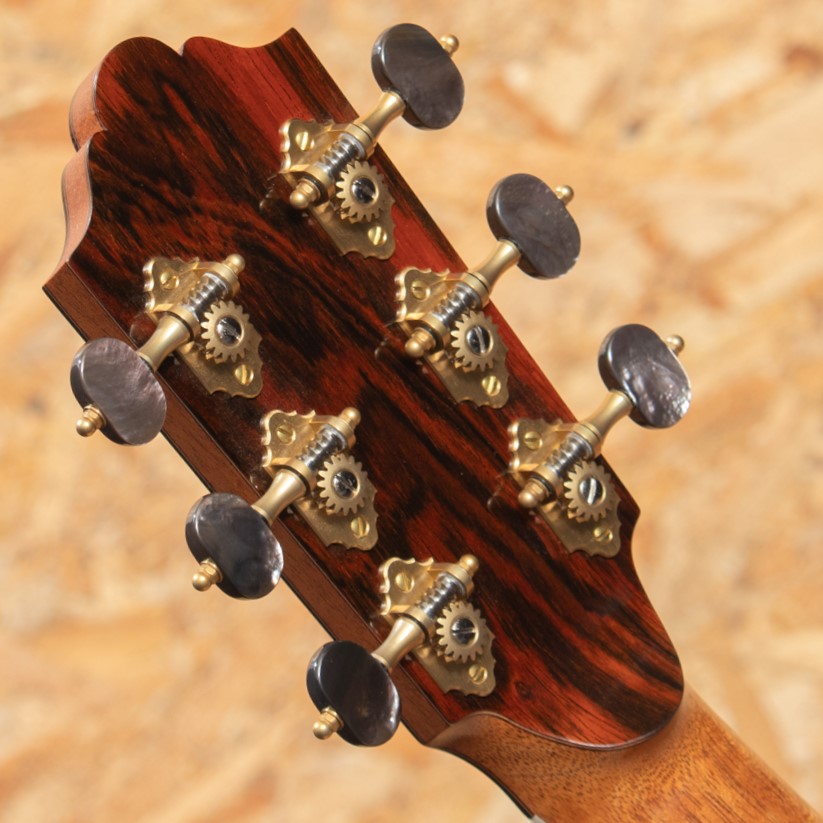 3ピーススプルーストップ、ハカランダサイド、ハカランダダブルバック、マホガニーネック、エボニー指板、ハカランダブリッジ、ゴトー製KG-02ペグ、ウッドラジアル&ヘリンボーンロゼッタ、マッカーサーエボニーバインディング、セラック塗装。