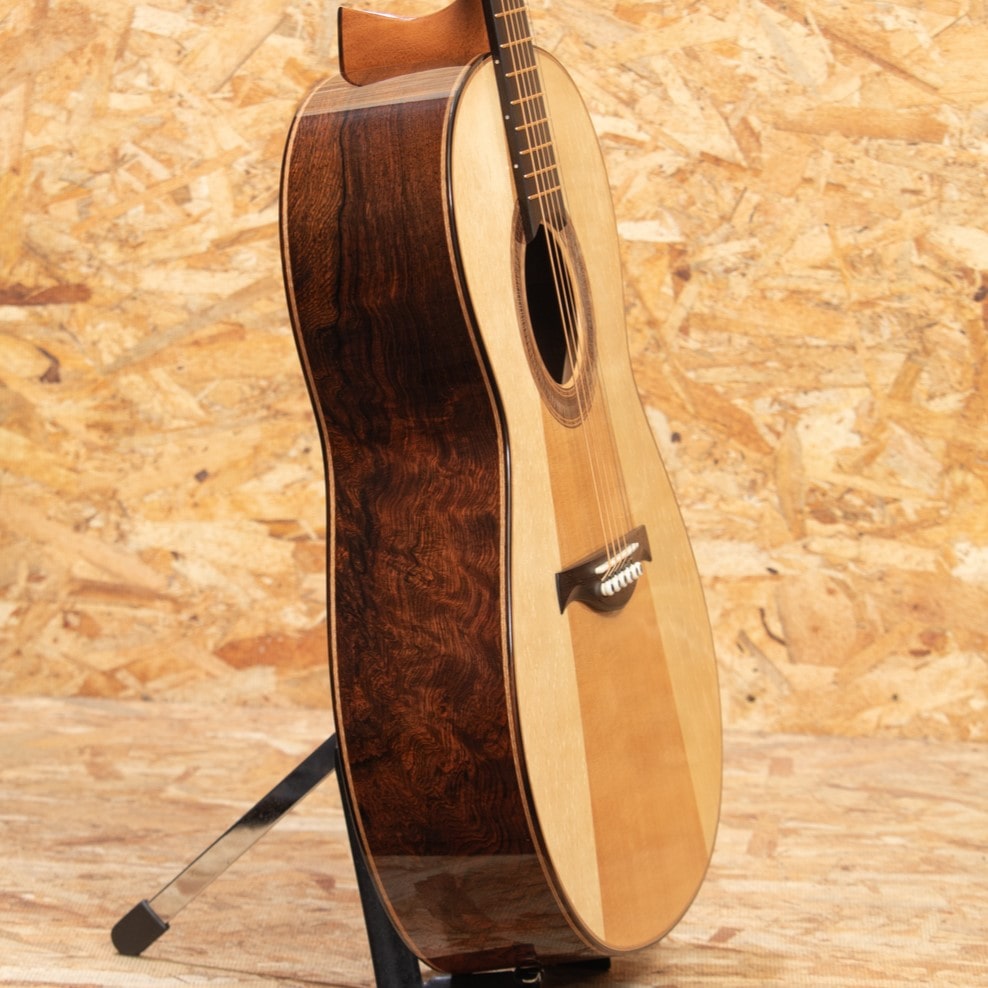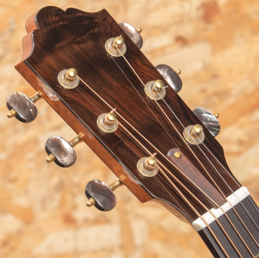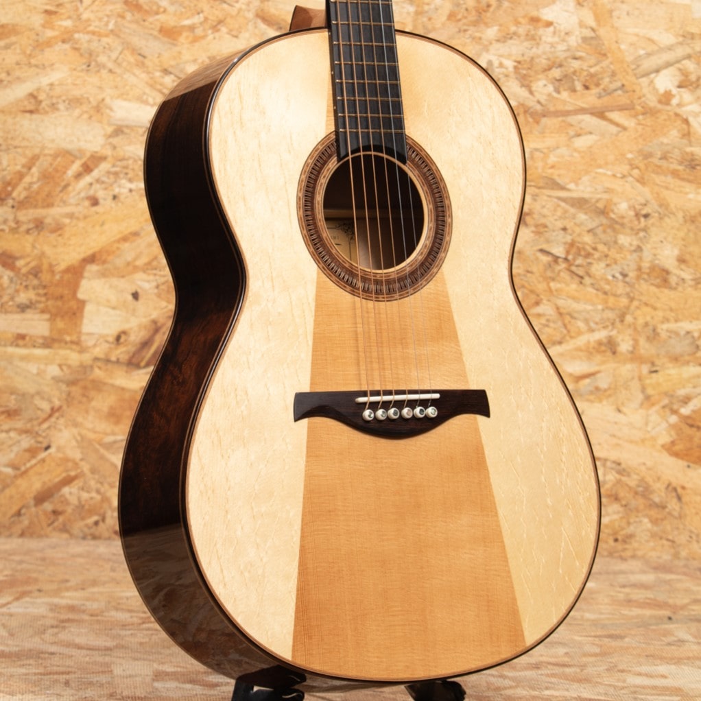 3ピーススプルーストップ、ハカランダサイド、ハカランダダブルバック、マホガニーネック、エボニー指板、ハカランダブリッジ、ゴトー製KG-02ペグ、ウッドラジアル&ヘリンボーンロゼッタ、マッカーサーエボニーバインディング、セラック塗装。