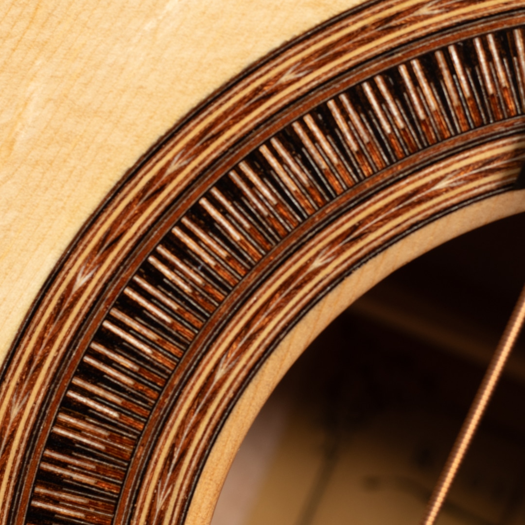 また、貝や樹脂は使用せず木材にこだわって施された装飾も魅力。特にメイプル、ローズウッド、グラナディロ、サペリ、ウェンジ、ボックスウッド材を緻密に組み込んだロゼッタは非常に意匠性が高く、こういった部分からも小林氏の技量の素晴らしさが窺えます。