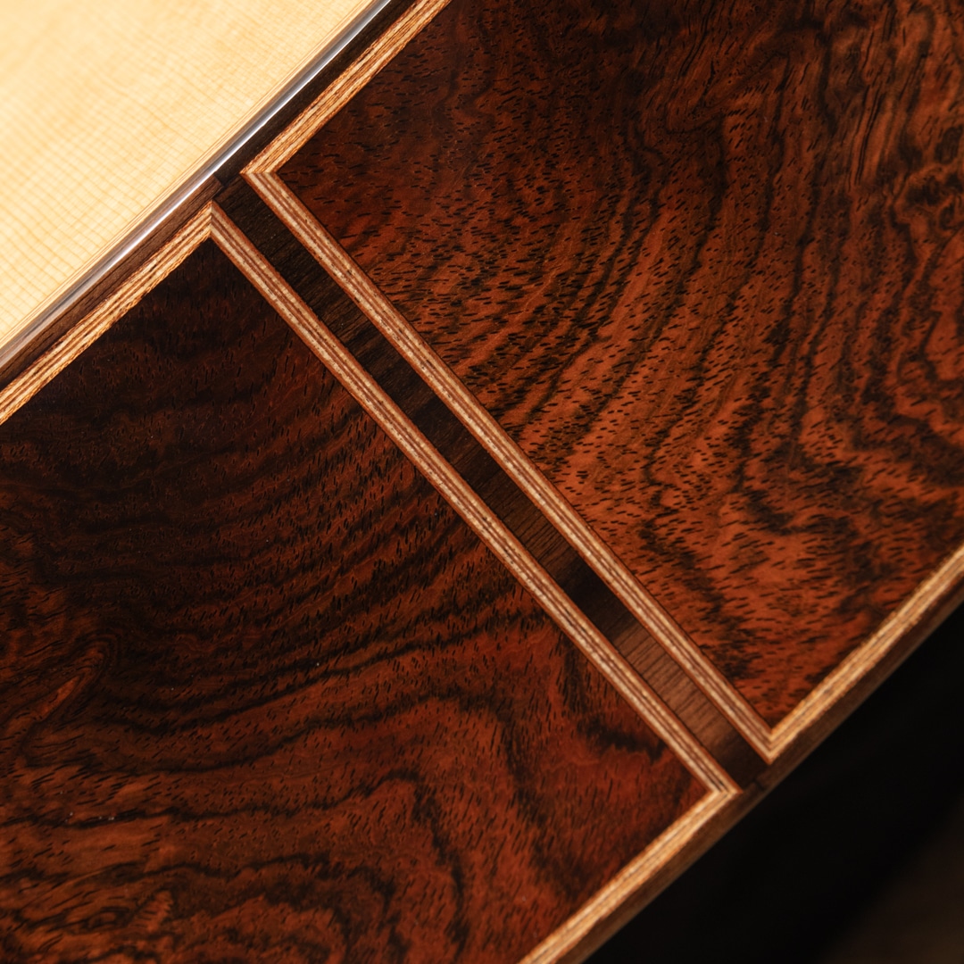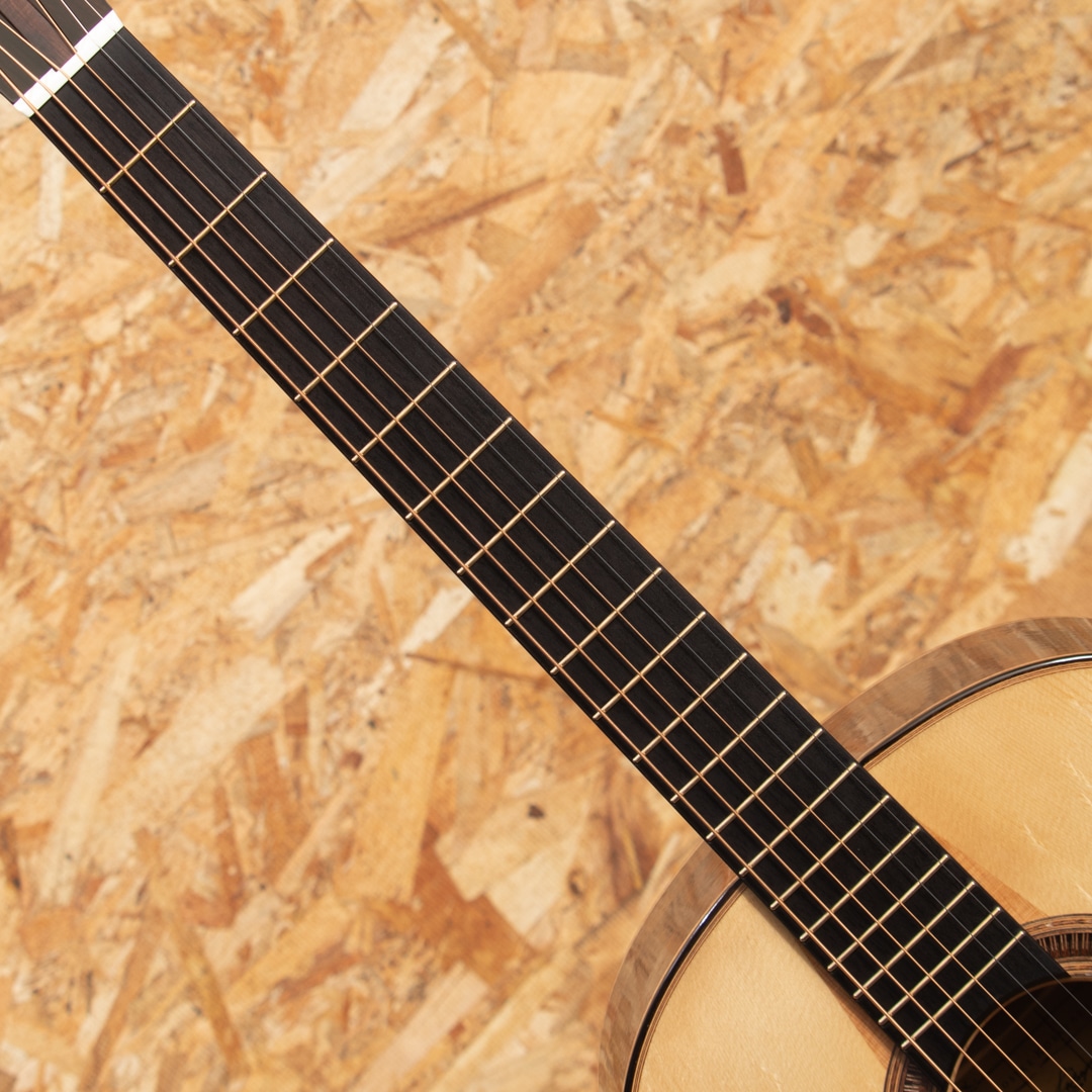 本器いちばんの特徴はやはり3ピーストップ構造。追柾目材のベアクロウ・イングルマンスプルースをトップ両サイドへ斜角に配置し、中央に50年天然乾燥を経た硬質なオールドグロース・スプルースを挟み込むことでトップ全体の剛性(音響性)をコントロール。内部ブレーシングもこの仕様に合わせて最適化されています。現在クラシックギターの名工の作品などで一部見られる3ピーストップ構造ですが、アコースティックギターへ採用されたものはほぼ皆無と言っていいでしょう。硬さ、柔軟性に関してのバランスや方向性が柾目材とは異なるため、一般的にはボディに追柾目材を利用するのは難しいとされておりますが、材の個性と構造の特性を理論的に捉え、見事3ピーストップというかたちで成立させております。