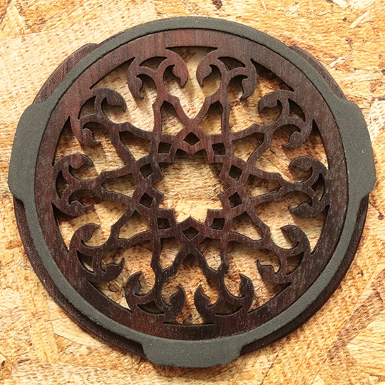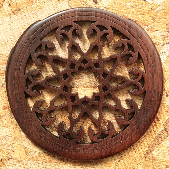 アメリカ・フロリダにて製作されているフィードバック抑制用のサウンドホールカバー。15種類のデザインと7種類のウッドマテリアルの組み合わせが存在し、それらの全ては精密なレーザー加工にて製作されております。アート性が高いのも特徴で、ギターの装飾の一部としてアクセントにもなるため、フィードバックの問題を抱えていない場合でもオシャレなアートカバーとしてお使い頂けます。完全密閉ではない構造のため、一般的なゴム製のサウンドホールカバーに比べ、大事なギター本来のサウンドを損なうことなく、自然な響きを残したままフィードバックを抑えることができます。そのデザイン性、品質の高さから海外アーティストを中心とする多数のアーティストがLUTE HOLEを愛用しています。