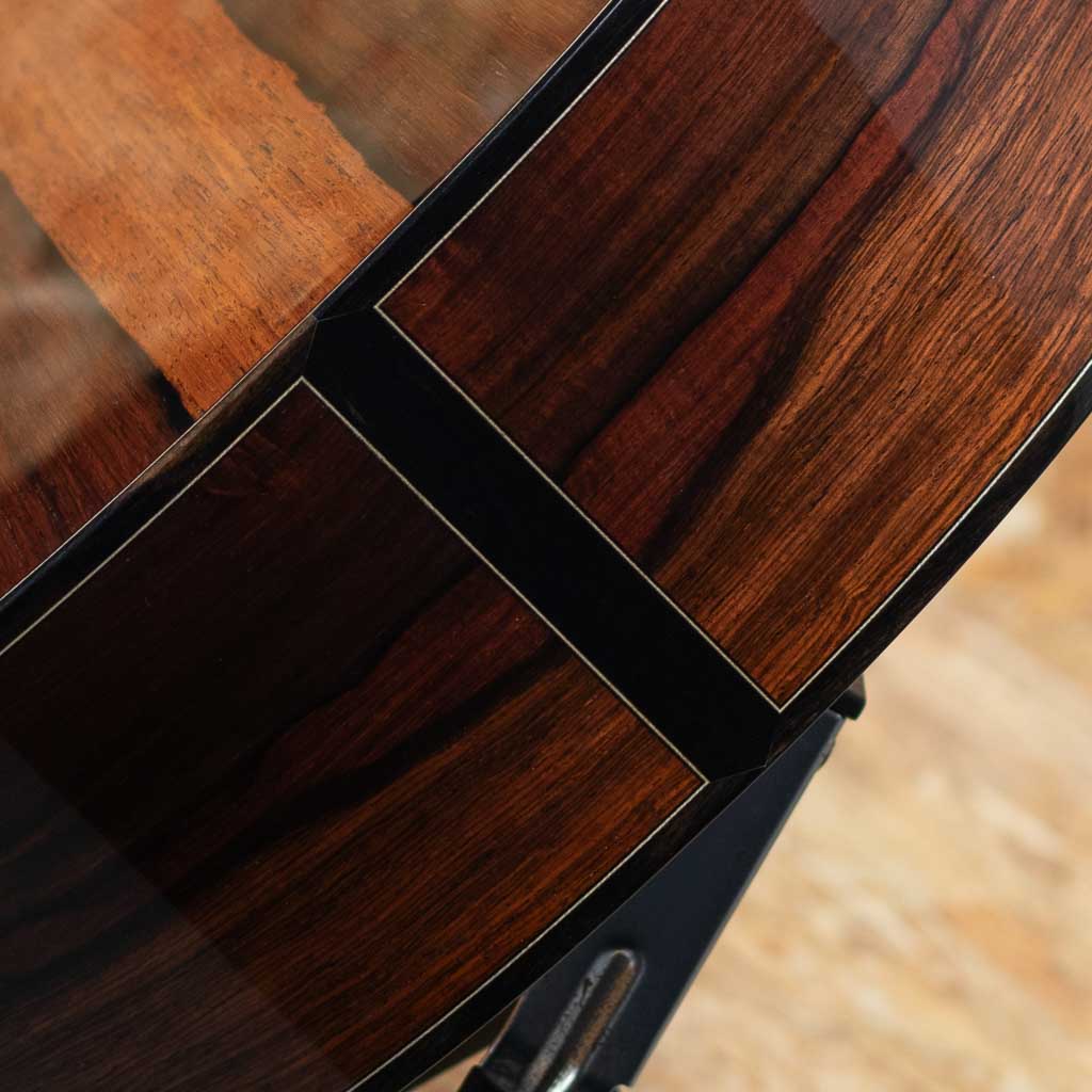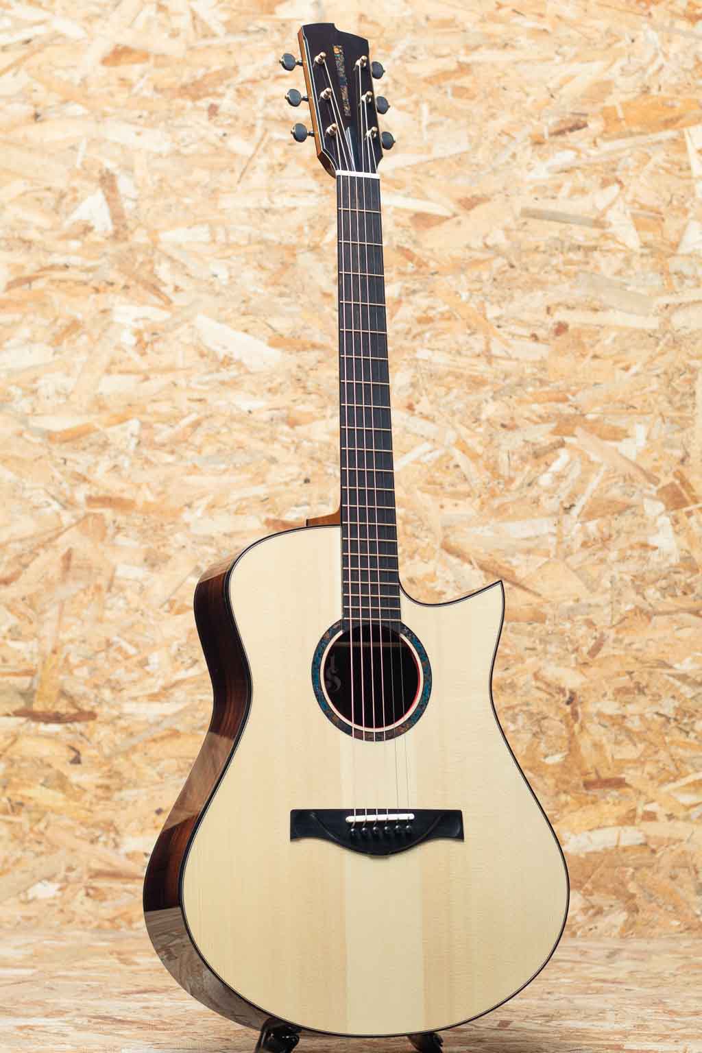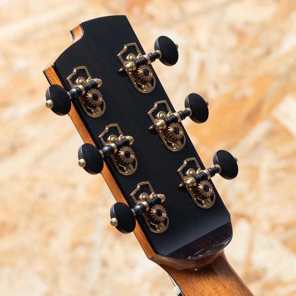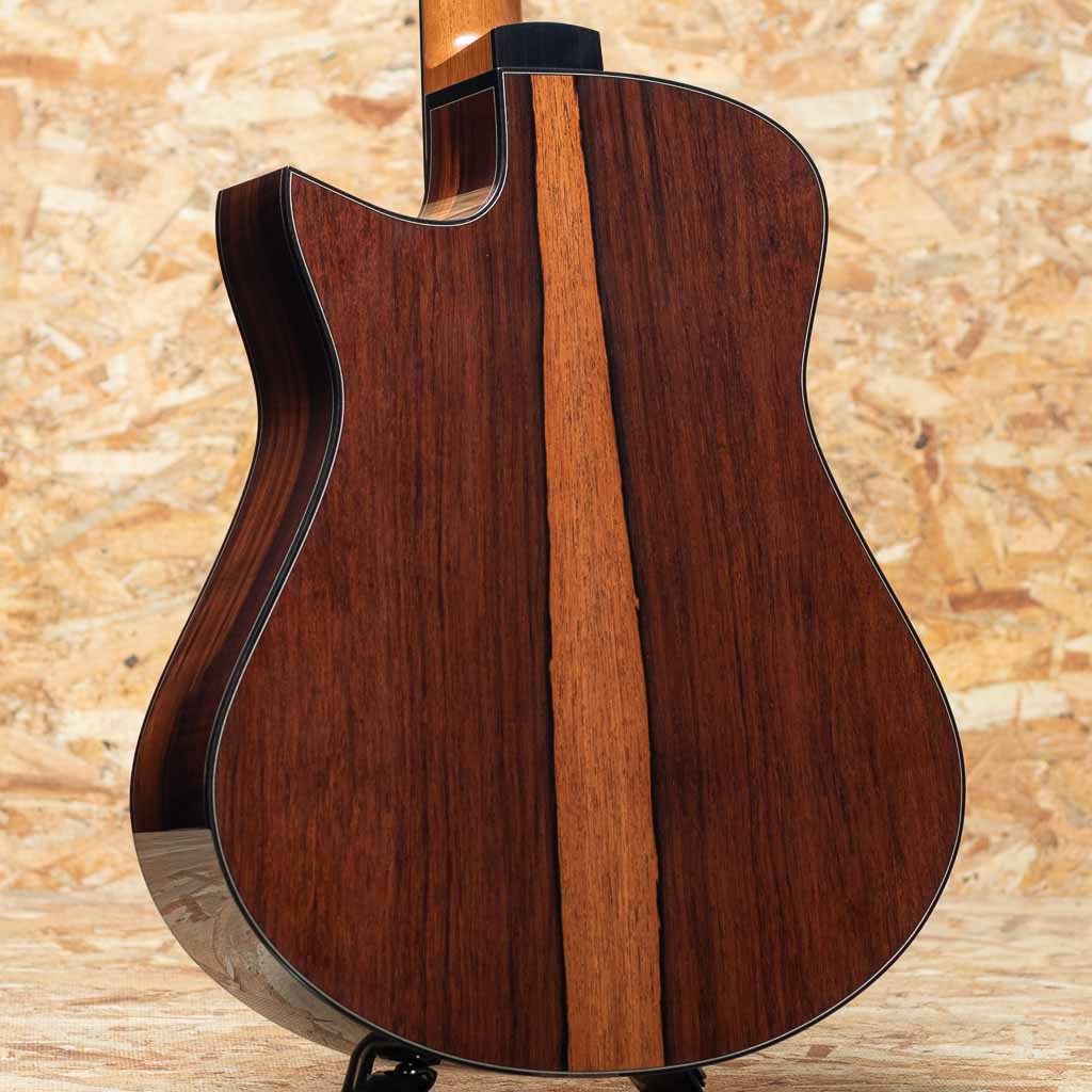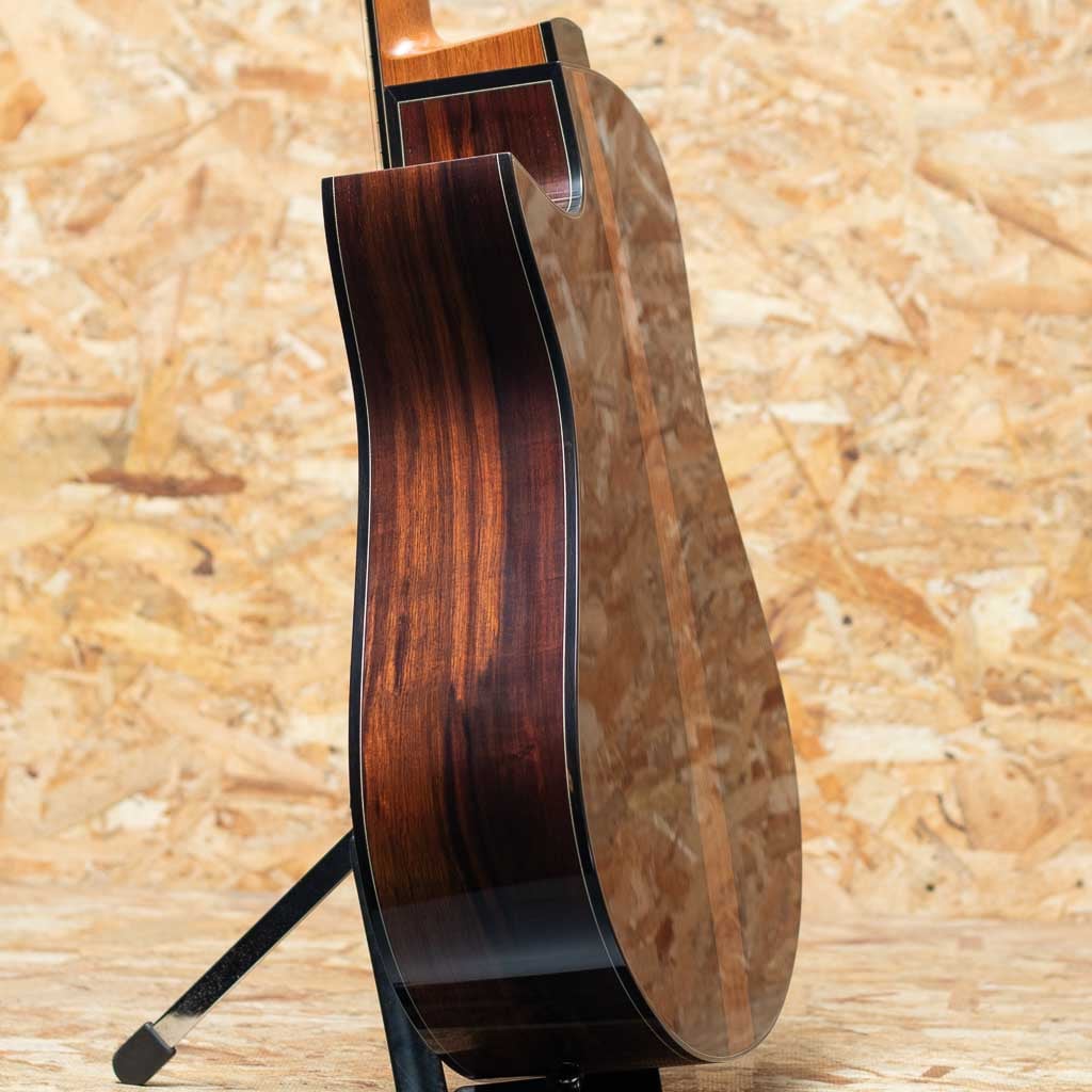 本器は2023年製のモデル。トップには良材のスイスムーンスプルース、サイド&バックには濃淡が美しく表れたマダガスカルローズウッドを採用。サイド材はダブルレイヤー構造です。スパニッシュシダーワンピースネック、エボニー指板&ブリッジ、銅とその緑青のデザインロゼッタ、シェラー製オープンバックペグ、フローレンタインカッタウェイ、トップはラティスブレーシング仕様。ネックとボディの接合はボルテッド・ダブル・モーティス&テノンジョイントを採用しており、より強固で安定した接合と、将来的なメンテナンス(ネックリセットなど)がしやすい設計。