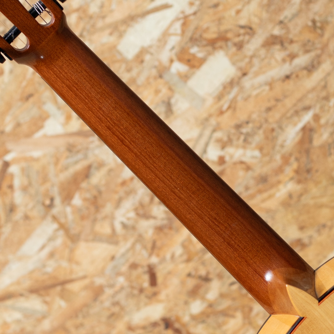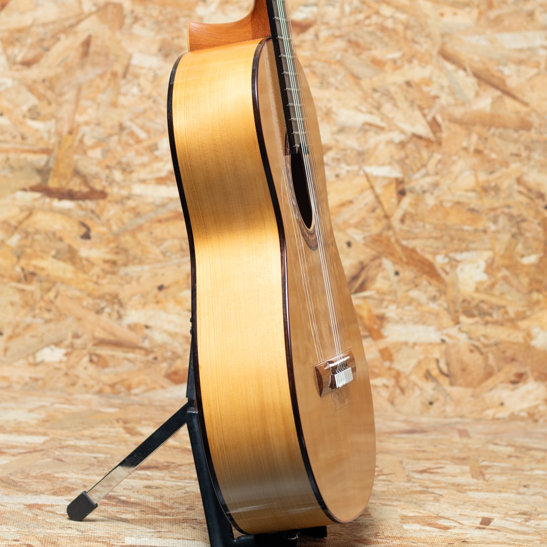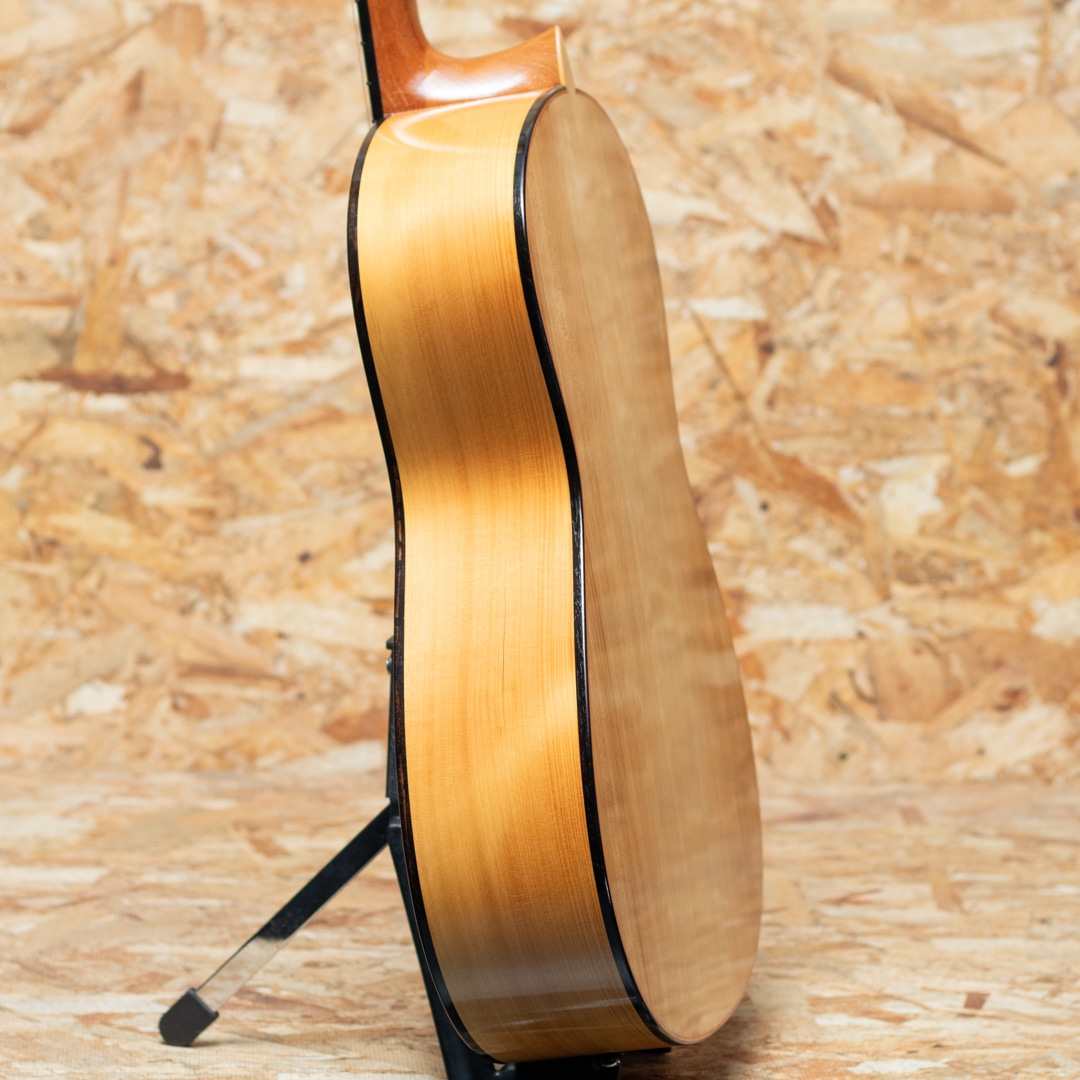 今もっとも脂の乗った製作家のひとりともいえる"Stephan Marchione(スティーブン・マルキオーネ)"のSteel String Acoustic。数々の有名ビルダーを輩出したPensa Suhr在籍後1993年に独立し、2001年からはテキサス州ヒューストンへ自身の工房を開いています。アーチトップをはじめ、ソリッド、クラシック、バイオリンまで、弦楽器のその大半を製作でき、そのすべての分野で喝采を博しています。本器は氏の得意とするフラメンコスタイル白モデル。ヨーロピアンスプルース、シープレスサイド&バック、スパニッシュシダーネック、エボニー指板、ハカランダブリッジ、ウッドロゼッタ、ローズウッドバインディング、マダガスカルローズウッドヘッド化粧板。弦楽器製作家によく見られる強いヘッド角に弦長655ミリの仕様ながらテンション感を感じさせない抜群の演奏性。一度爪弾けば、さながらハイエンドオーディオを思わせる、抜群のバランスと透明感のあるトーンが心地良く響きます。氏の作品に共通する指板の何処を押さえてもロス無く音が飛び出す感覚と絶妙な音の減衰の美しさも際立っており、氏の製作する全ての作品に共通する恐ろしく高い精度で製作されている事を感じさせます。極薄いスクラッチ傷や微かな塗装の荒れがあるものの非常に良好な状態を保っており、ネックコンディションも抜群です。ハードケースが付属いたします。