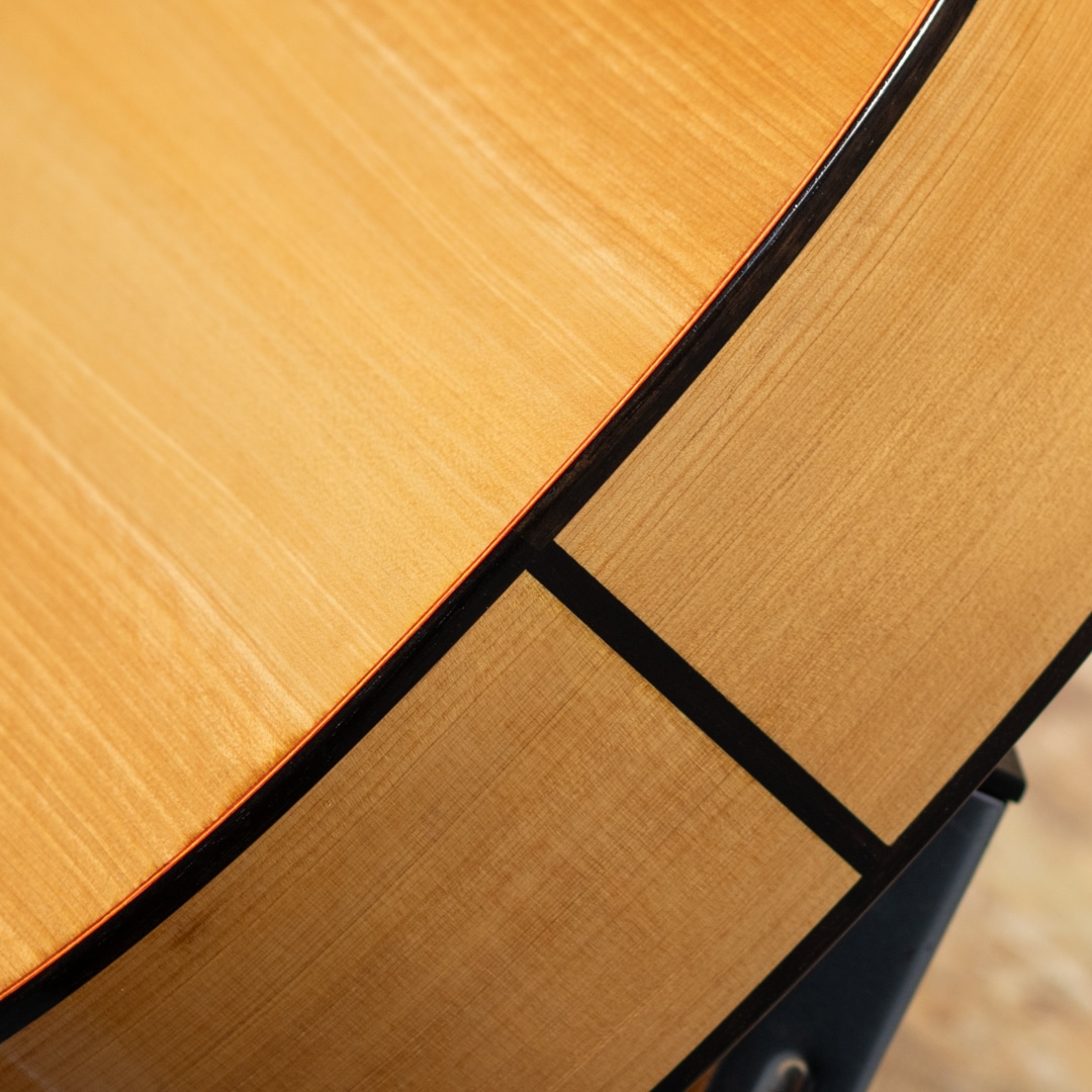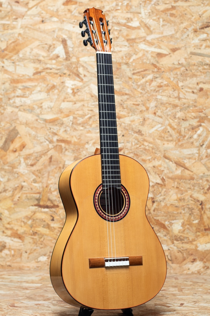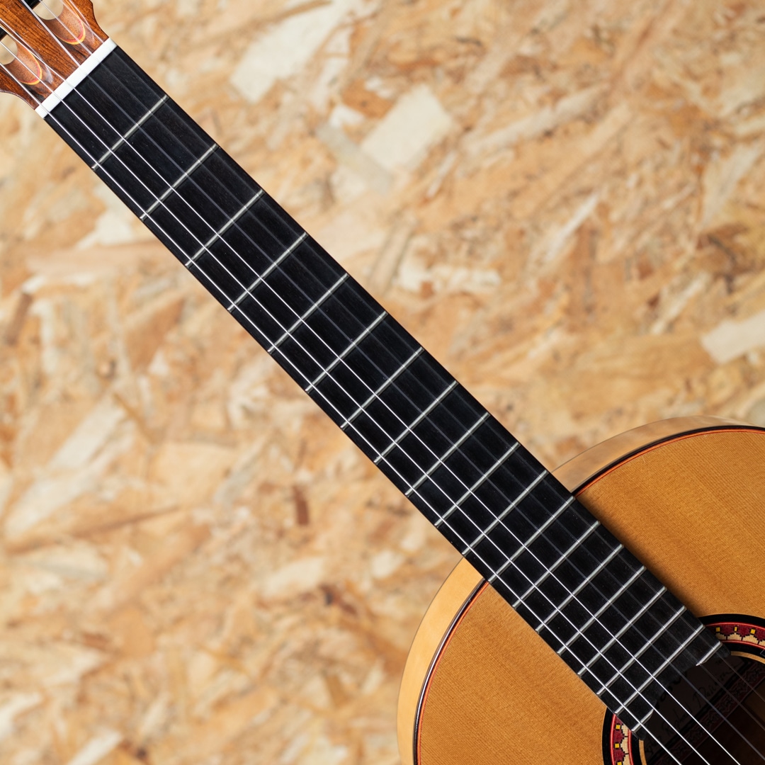 今もっとも脂の乗った製作家のひとりともいえる"Stephan Marchione(スティーブン・マルキオーネ)"のSteel String Acoustic。数々の有名ビルダーを輩出したPensa Suhr在籍後1993年に独立し、2001年からはテキサス州ヒューストンへ自身の工房を開いています。アーチトップをはじめ、ソリッド、クラシック、バイオリンまで、弦楽器のその大半を製作でき、そのすべての分野で喝采を博しています。本器は氏の得意とするフラメンコスタイル白モデル。ヨーロピアンスプルース、シープレスサイド&バック、スパニッシュシダーネック、エボニー指板、ハカランダブリッジ、ウッドロゼッタ、ローズウッドバインディング、マダガスカルローズウッドヘッド化粧板。弦楽器製作家によく見られる強いヘッド角に弦長655ミリの仕様ながらテンション感を感じさせない抜群の演奏性。一度爪弾けば、さながらハイエンドオーディオを思わせる、抜群のバランスと透明感のあるトーンが心地良く響きます。氏の作品に共通する指板の何処を押さえてもロス無く音が飛び出す感覚と絶妙な音の減衰の美しさも際立っており、氏の製作する全ての作品に共通する恐ろしく高い精度で製作されている事を感じさせます。極薄いスクラッチ傷や微かな塗装の荒れがあるものの非常に良好な状態を保っており、ネックコンディションも抜群です。ハードケースが付属いたします。