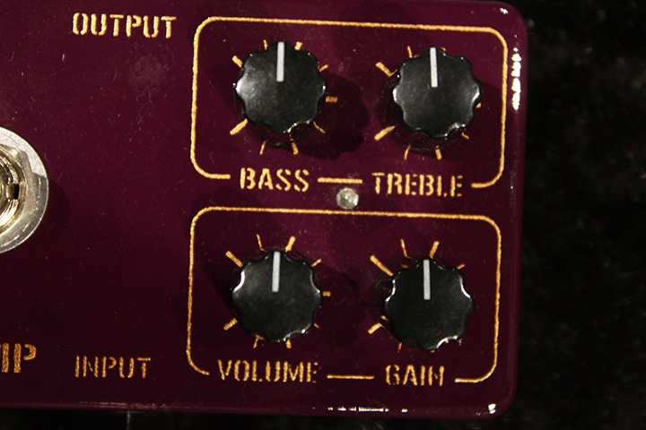 ゲインは歪みを感じる境界線周辺の変化を重視した設計となっています。チューブアンプのようにクリーンから滲むように歪ませることが出来ます。ピークを少し歪ませる事で得られるコンプ感は、サウンドに程よい太さを与えます。最大値付近ではFuzzのように過激に歪ませる事も可能です。