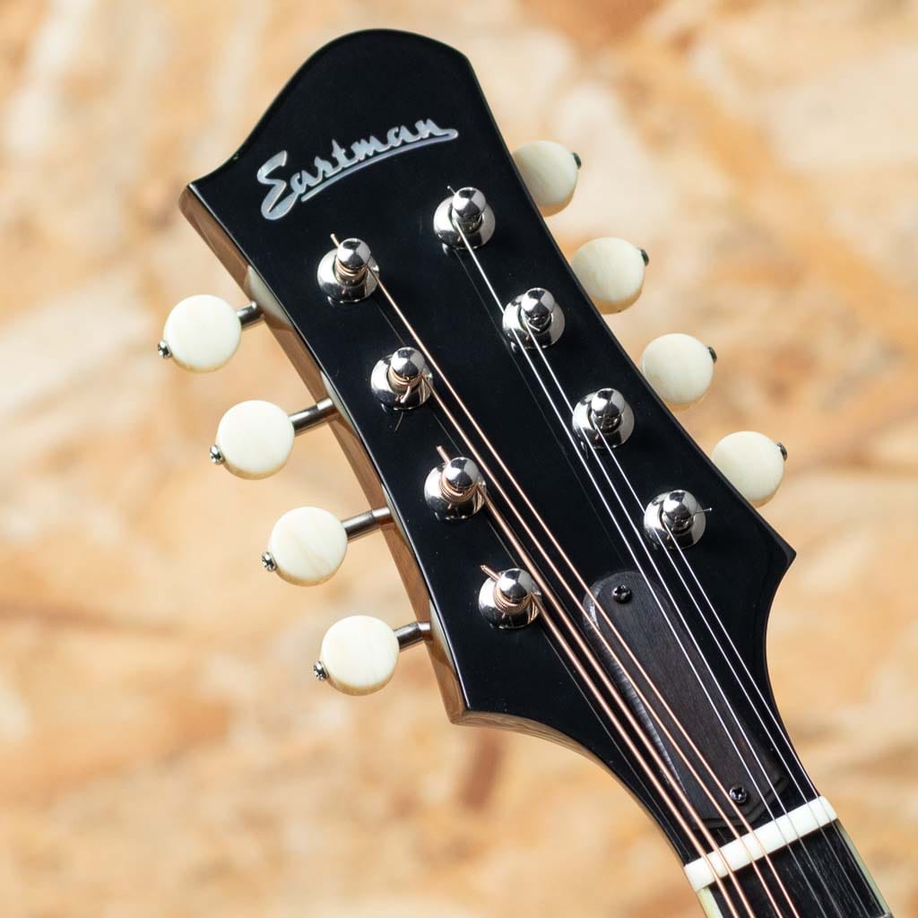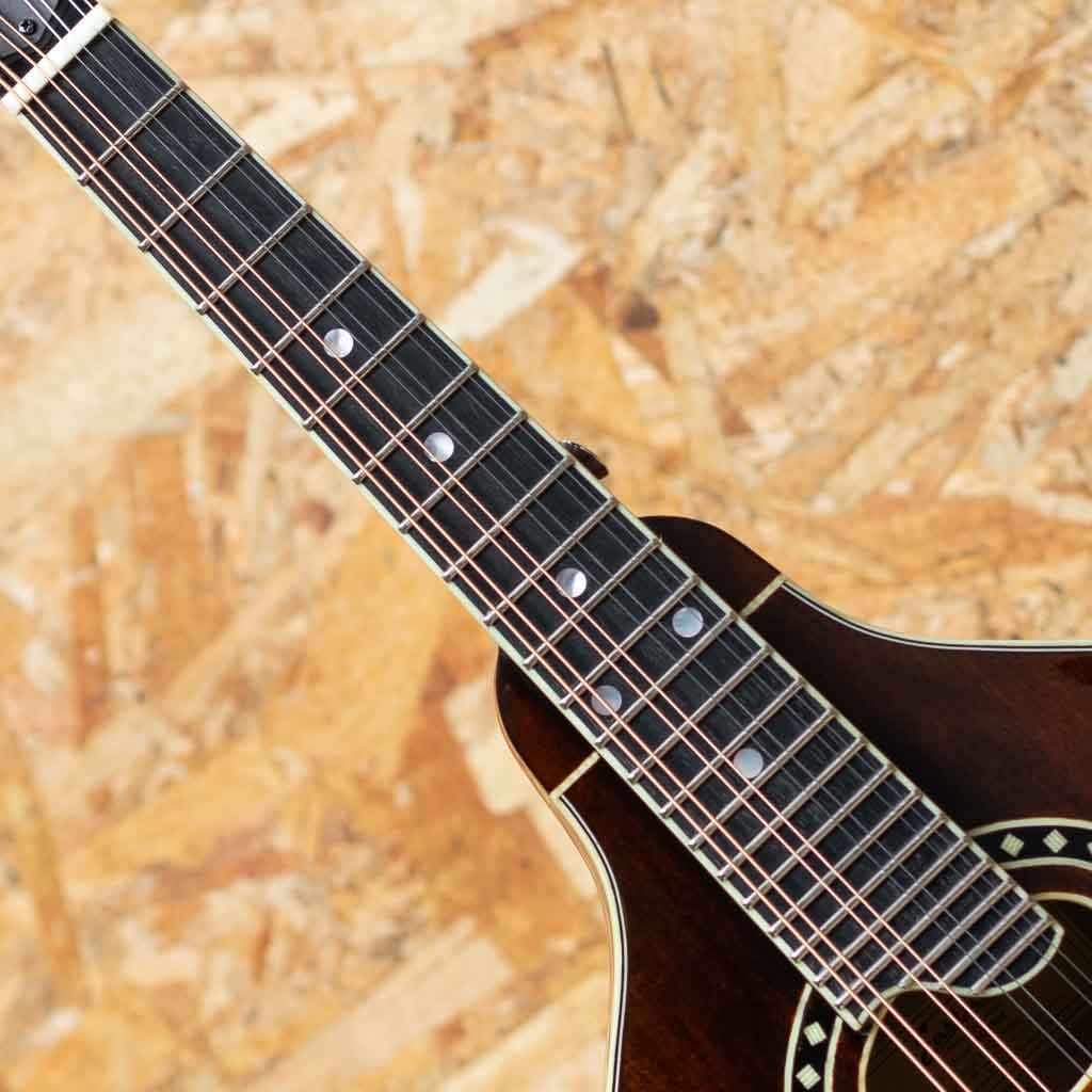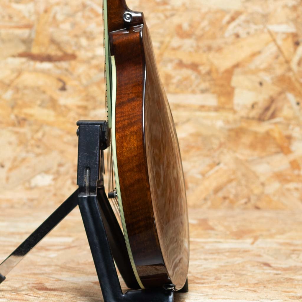 アメリカ本国にて大変人気のEastman Guitars。オール単板削り出しという音に拘るスペックをもちながらもリーズナブルな価格で人気のEastman Mandolin。こちらは”MD504” 2022年製USED品。スプルース単板トップ、メイプルサイド、メイプルバック、トップとバックはいずれもハンド・カーヴィングによる削り出しで、Fホールタイプに比べてより開放的で温かみのあるサウンドキャラクターを持ち、特に中低域のふくらみと自然なサスティンが際立ちます。ネックは1ピースメイプル、指板はエボニーのラディアスで確かな剛性と滑らかなプレイフィールを両立。仕上げはグロス・ラッカーで高級感もあります。ネックヒールにストラップピン打ちあり。全体に使用感は極少なく全体に光にかざすと見える程度のわずかな拭きキズが見える程度です。オーバルホール特有の空気感豊かな響きは、ソロ演奏やアンサンブル内でのメロディラインに最適です。初めてのマンドリンにもおすすめです。オリジナルハードケース付属