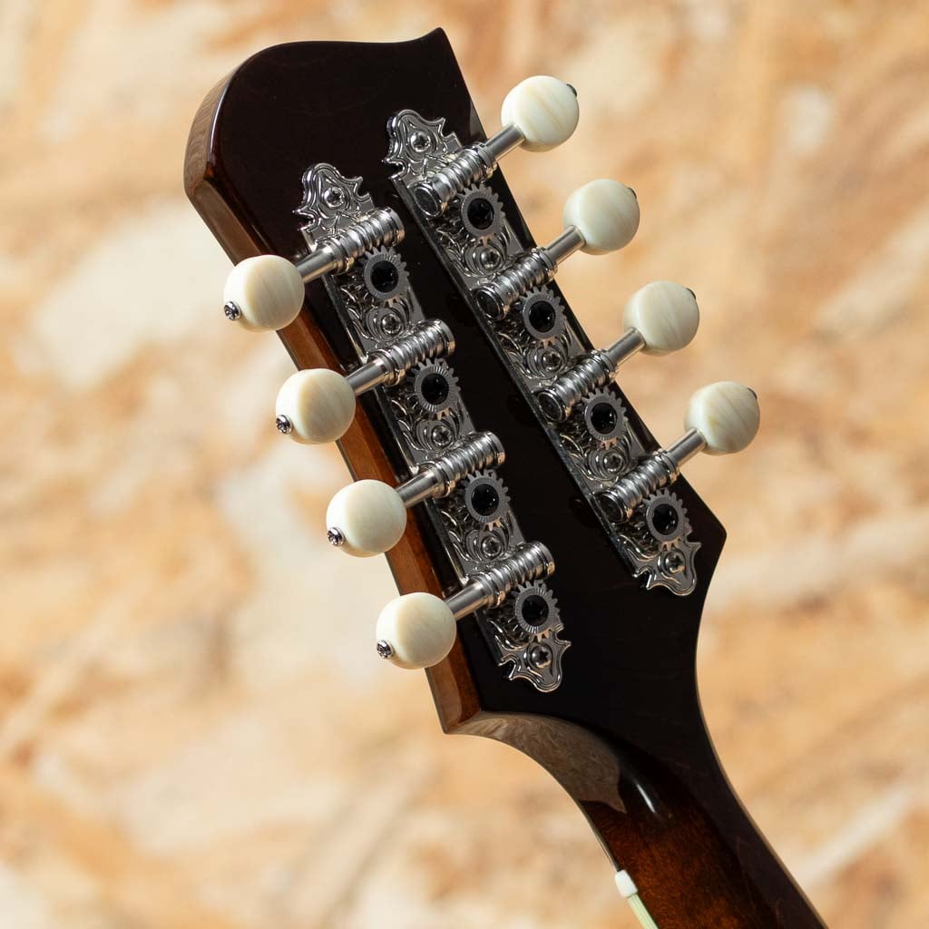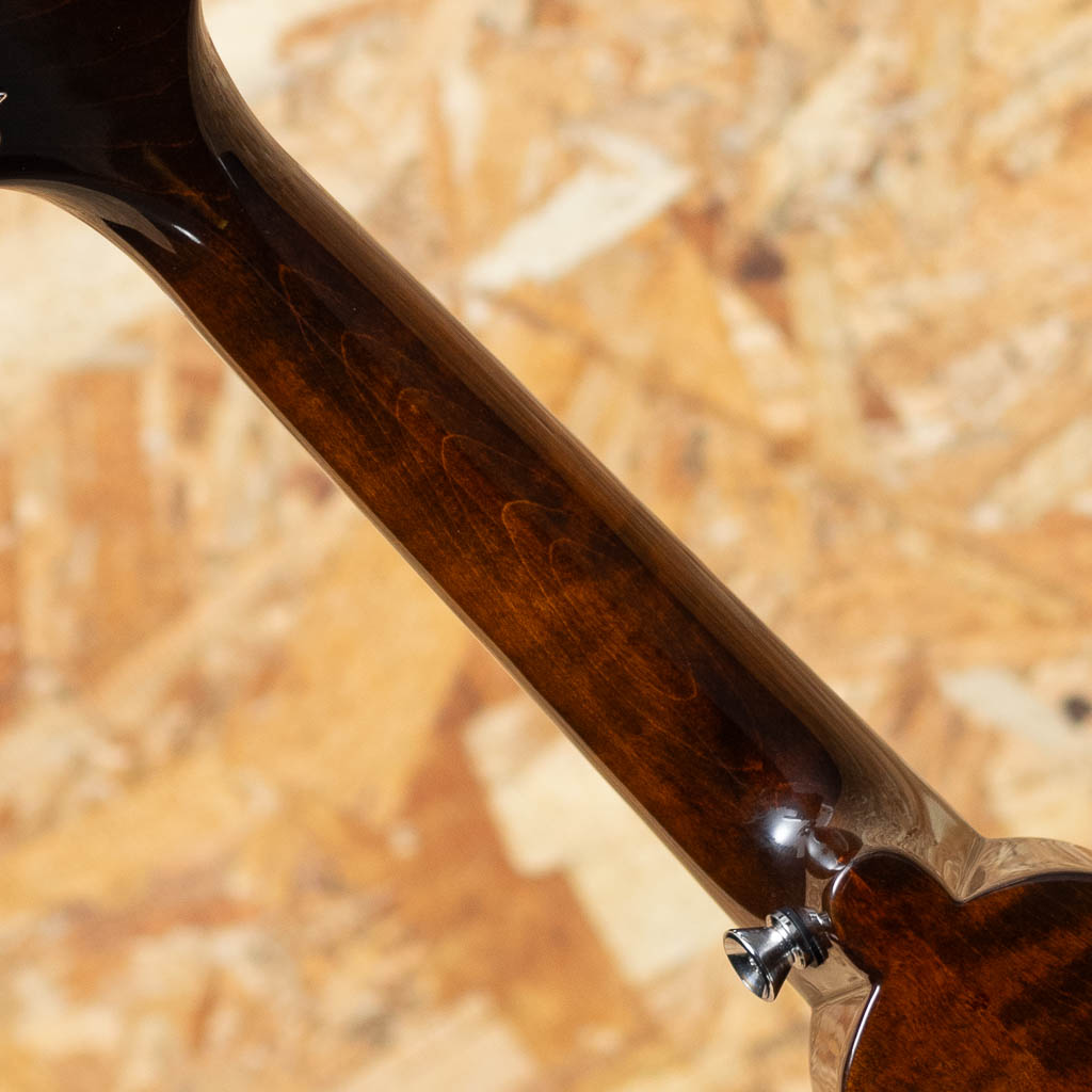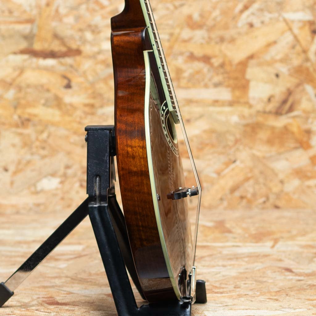 アメリカ本国にて大変人気のEastman Guitars。オール単板削り出しという音に拘るスペックをもちながらもリーズナブルな価格で人気のEastman Mandolin。こちらは”MD504” 2022年製USED品。スプルース単板トップ、メイプルサイド、メイプルバック、トップとバックはいずれもハンド・カーヴィングによる削り出しで、Fホールタイプに比べてより開放的で温かみのあるサウンドキャラクターを持ち、特に中低域のふくらみと自然なサスティンが際立ちます。ネックは1ピースメイプル、指板はエボニーのラディアスで確かな剛性と滑らかなプレイフィールを両立。仕上げはグロス・ラッカーで高級感もあります。ネックヒールにストラップピン打ちあり。全体に使用感は極少なく全体に光にかざすと見える程度のわずかな拭きキズが見える程度です。オーバルホール特有の空気感豊かな響きは、ソロ演奏やアンサンブル内でのメロディラインに最適です。初めてのマンドリンにもおすすめです。オリジナルハードケース付属