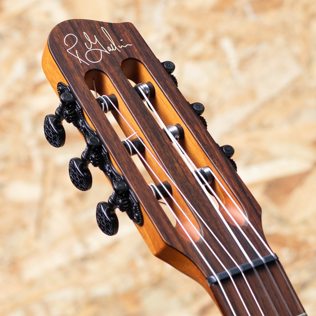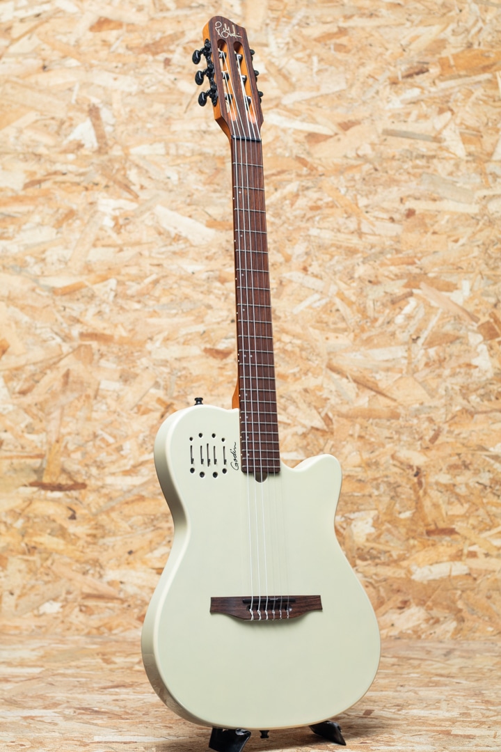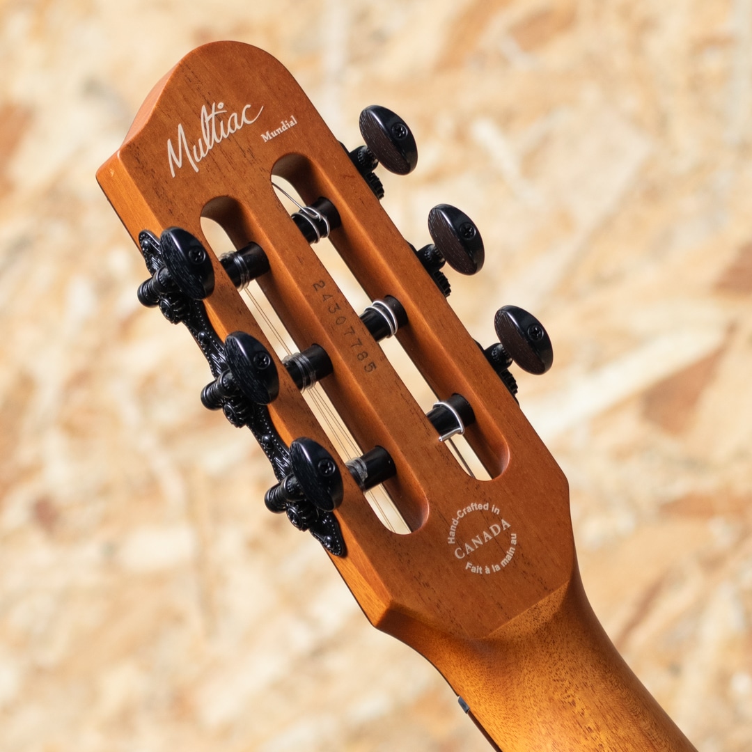 エレクトリックナイロンギターと言えばGodin、Godinと言えばエレクトリックナイロンギター。そういっても過言ではない程定着化したカナダのハンドメイドブランド、Godin (ゴダン)。その革新的なギター構造は今や唯一無二、一つのジャンルとして世界中のアーティストに支持されています。本器はMultiac Nylon SAの発売から30年を経て開発されたモデル”Multiac Mundial”。表板にシダートップ、シルバーリーフメイプルボディ、スパニッシュシダーネックの組み合わせにより、優れた演奏性と自然なサウンドを実現しています。Godin Double Source Customプリアンプを搭載し、アンダーサドル・ピックアップとギター内のセンサーをミックス可能で、高い汎用性とプラグドでも自然なナイロンサウンドを実現。ハウリングの心配もなく、柔らかい弦のエレキギターを弾いているような感覚での演奏が可能です。 Condition :NEW Top :Cedar Side & Back :Hollowed Silver Leaf Maple Neck :Spanish Cedar Fingerboard :Rosewood Bridge :Rosewood Machine Head :Original Fingerboard Inlay :Dots Rosette :None Binding :None Pick Guard :None Pick Up :Custom Godin Dual Source System Nut Width :48.26mm Scale :647.7mm Case :Original Gig Case