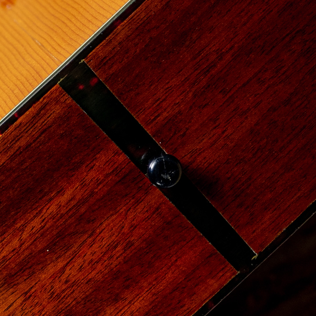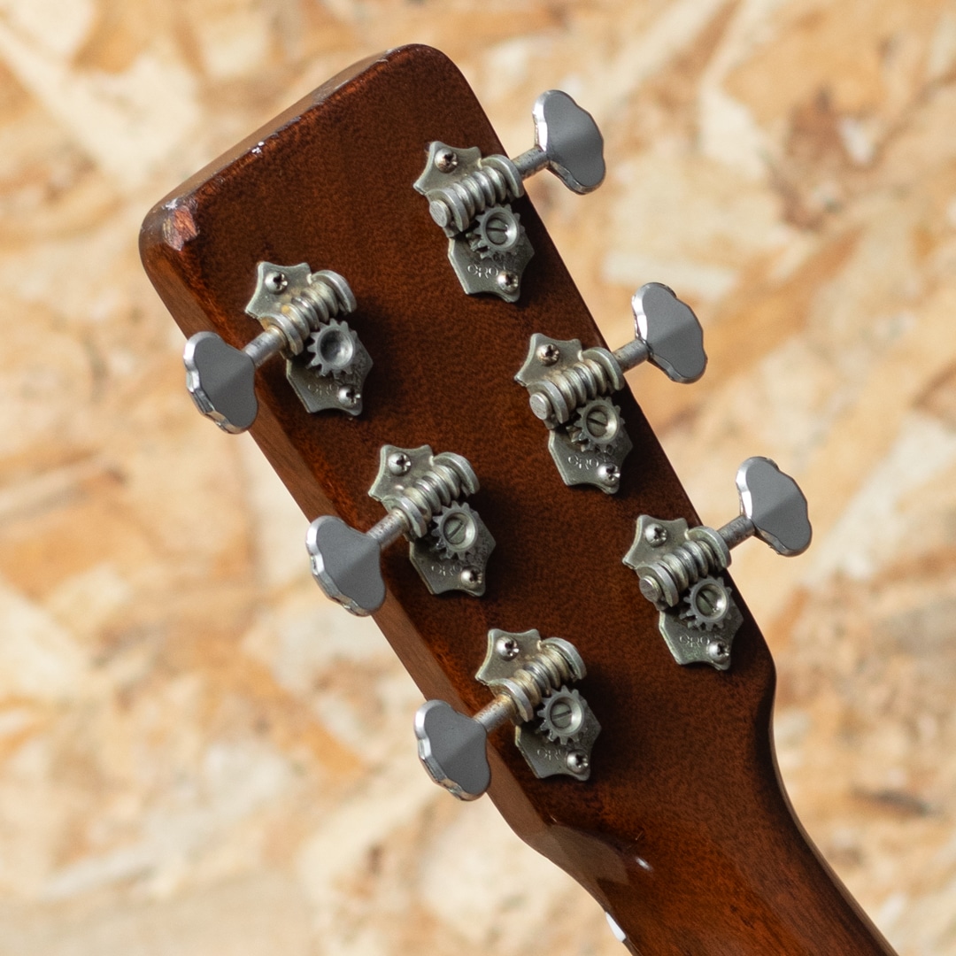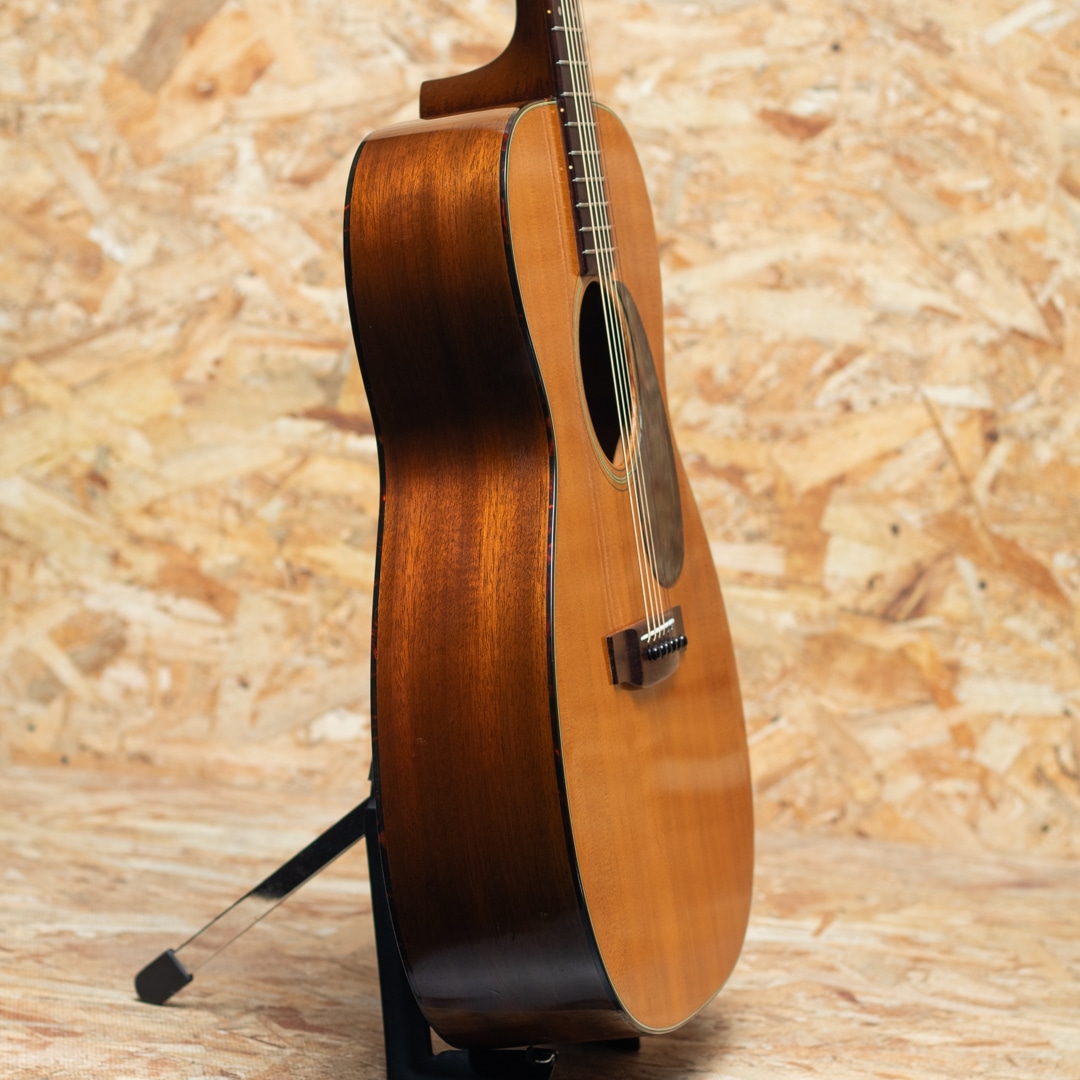 マーチン・オーディトリアムサイズボディの代表モデルのひとつ"OOO-18"。1965年製の1本。スプルーストップ、マホガニーサイド&バック、マホガニーネック、ハカランダ指板&ブリッジ、グローバー製オープンバックペグ、ハカランダ化粧板、パール指板ドット、塗り込みベッコウ柄セルピックガード、ベッコウセルバインディング、スチールTバーロッド。この時代らしいドライで爽快なトーンを持ったサウンド。しっかりとした枯れ感があり、現行品とは異なる響きと味わいをお楽しみいただけます。トップセンターシーム割れ修正痕がある他、トップ6弦側下部に一箇所割れ修正痕、バックに一箇所8cm程度の長さの割れ修正痕有り。全体的に雰囲気を損ねない程度のオーバースプレーが見られますが、その他は特に目立ったリペア歴は無く、大変美しい状態です。ウェザーチェックの具合もよく、年代相応の貫禄があります。ネックの状態も良好で、プレイコンディションも十分な状態。市場に出回る個体数としても少なくなってきている60sの1本。狙い目です。