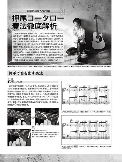 盟友、南澤大介による採譜・楽譜作成と奏法解説。押尾コータロー本人完全監修による正確無比のパーフェクト・スコア!!15曲のレコーディングに16本の異なるギターを使用した、聴きどころ満載のアルバム全曲を収載。各曲の奏法解説とテクニック解析を掲載。直筆メッセージ入り。