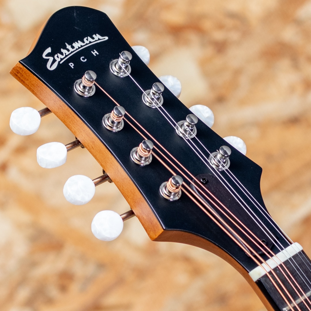 アメリカ本国にて大変人気のEastman Guitars。こちらは2024年Namm Showで発表されたニュカマー。フラットトップ&バックのシンプルなスタイルにサイドバックにプライマホガニーを使用し、リーズナブルな価格を実現したマンドリン。スプルース単板トップ、マホガニーサイドバック、メイプルネック、ローズウッド指板、指板はラディアスがついており演奏性抜群です。ボディーはやや厚めにデザインし深みのある芳醇な響きを持ちます。オーバルホールを採用しクラシカルなルックスもグッド!極薄のTruetoneフィニッシュで鳴りを活かしたサテン仕上げになっています。マンドリン入門におすすめです。オリジナルギグバッグ付属 Condition:NEW Top:Solid Spruce Side:Laminated Mahogany Back:Laminated Mahogany Neck:Maple Fingerboard:Rosewood Bridge:Ebony Machine Head:Chrome/Pearloid Fingerboard Inlay:Pearl Dots Binding:Ivoroid Pick Guard:none Pick up:None Nut width:30mm Scale:352.4mm Case:Original Gig Bag