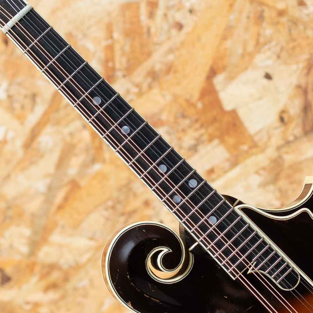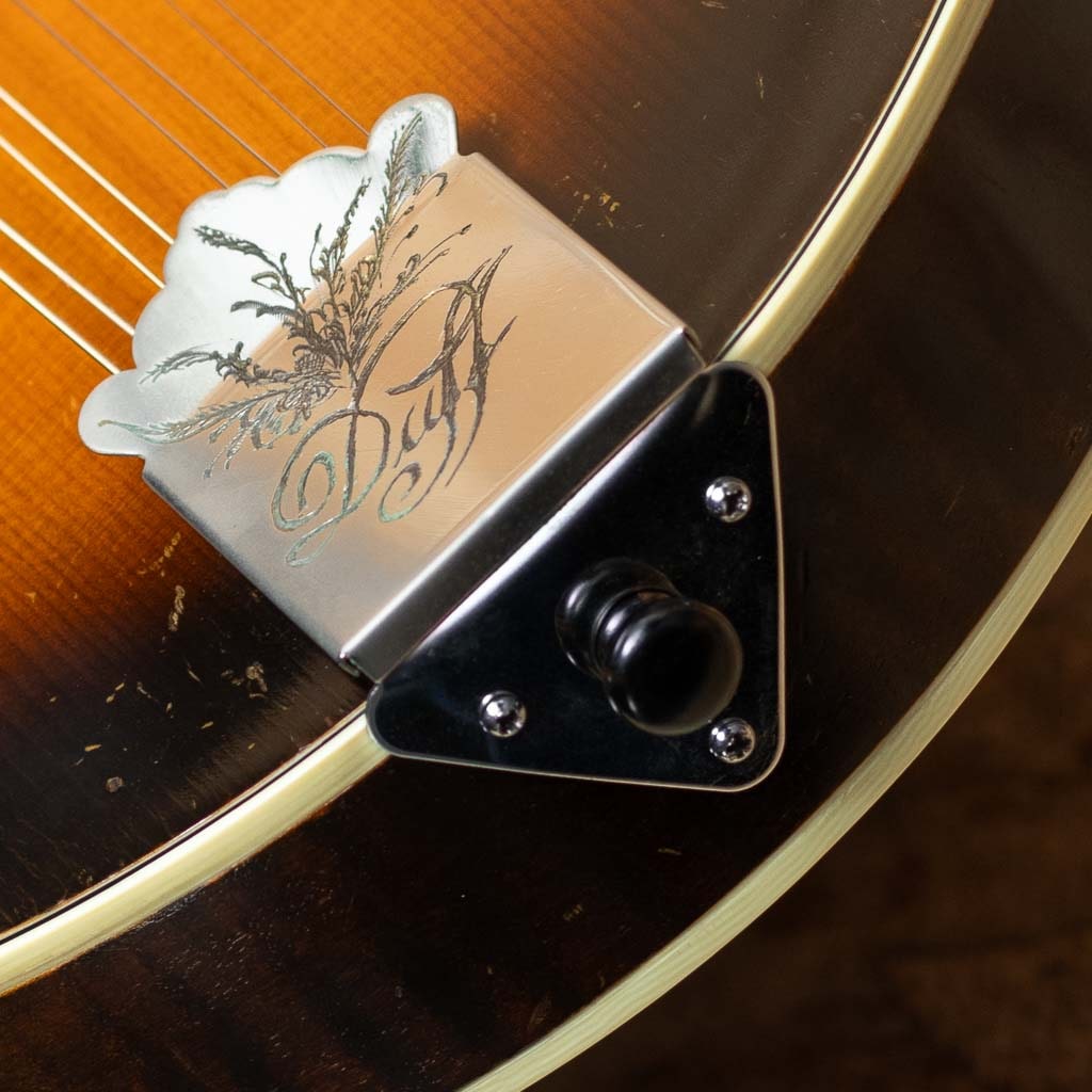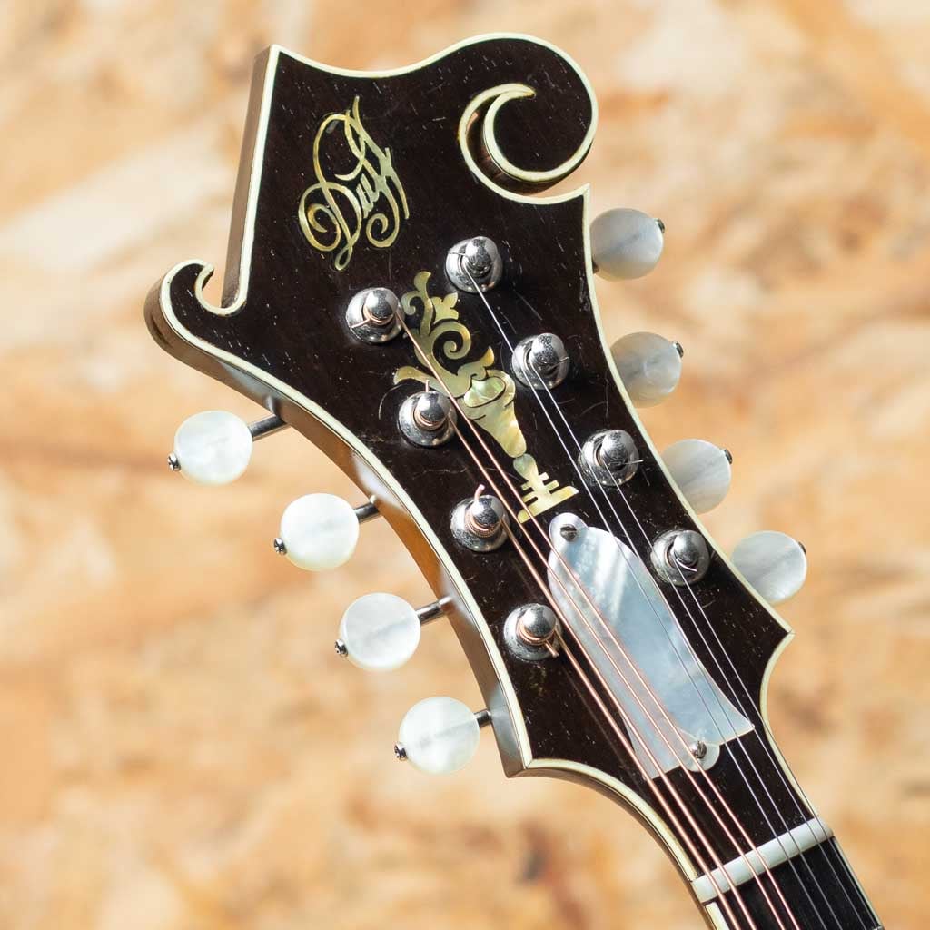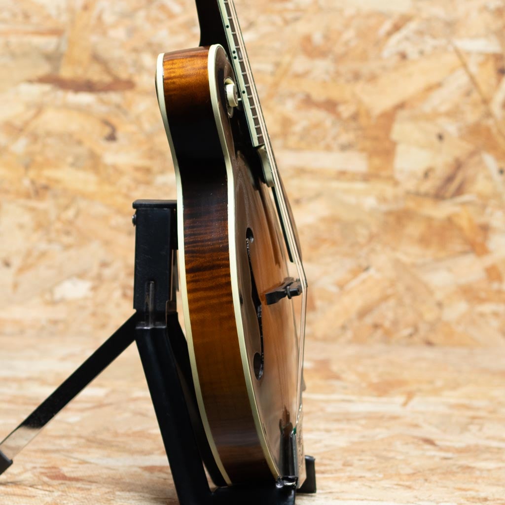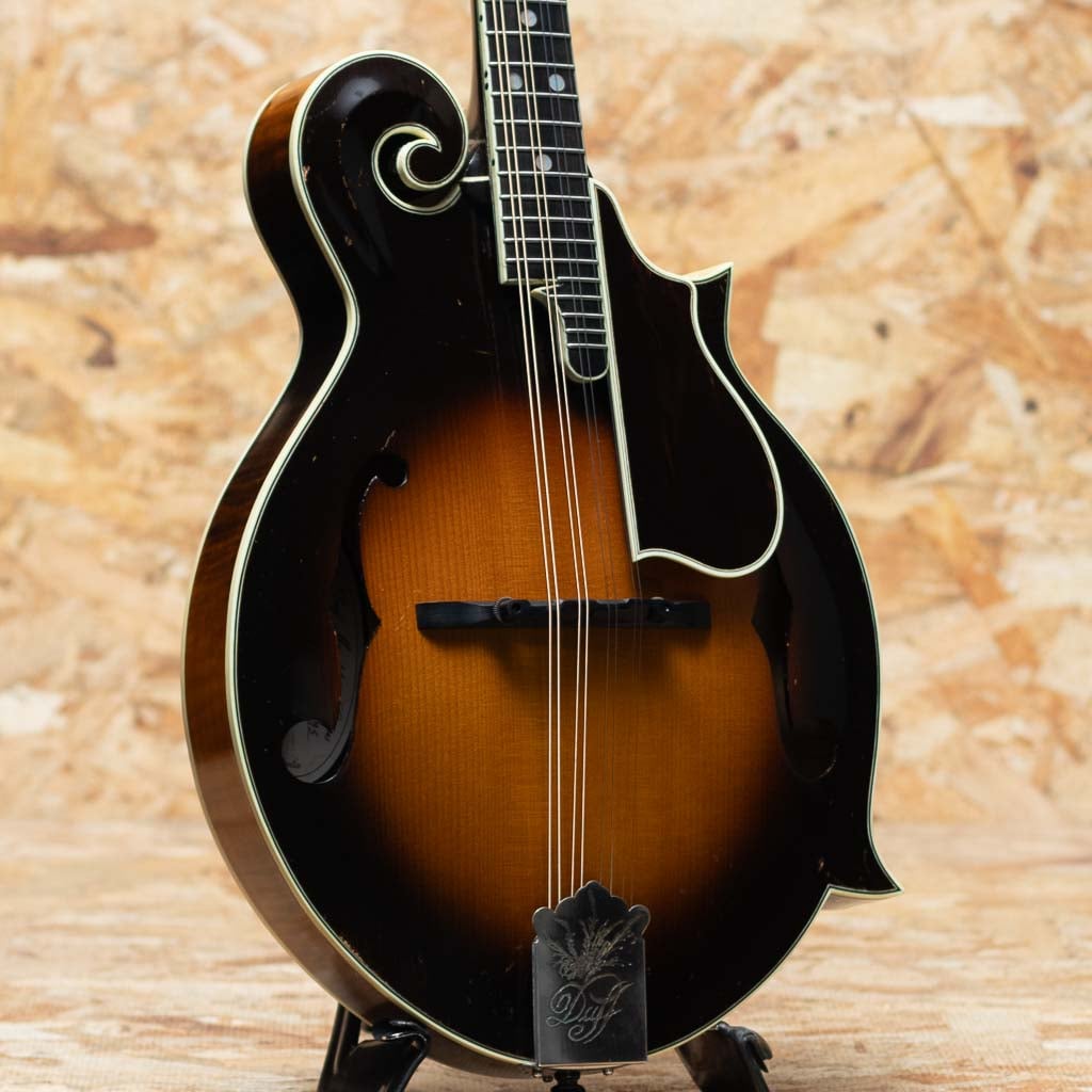 オーストラリアのルシアー、Paul Duff によって製作されるDuff Mandolinsは、現代のルシアーメイドマンドリン界において極めて高い評価を受けるブランドの一つです。1980年代初頭より製作を開始したPaul Duffは、1920年代のGibson F-5、いわゆる“ロアー期”のサウンドと構造を徹底的に研究し、長年にわたりその再現と発展に取り組んできました。その製作は現在に至るまで一貫して少量生産を貫き、トップやバックの削り出し、ボイシング、フィニッシュに至るまでほぼ全工程を手作業で行うことで、工業製品では到達し得ない繊細なニュアンスと高い完成度を実現しています。乾いた立ち上がりと芯のあるトーン、そして豊かな音量は、世界中のプレイヤーから高く評価されています。Duffの代表モデルであるF-5は、ブルーグラス・マンドリンの基準ともいえる伝統的なスタイルを踏襲したフラッグシップモデルです。当器は1995年製のF-5。アディロンダックスプルーストップ、フィギャードメイプルサイド、贅沢なフィギャードメイプル1pcバック、フィギャードメイプル1pcネック、ラディアスエボニー指板、MOPナット、ヘッドにはMOPにてDuffロゴとフラワーポットインレイ、トラスロッドカバーまでMOPです。ロアーレプリカエボニーアジャスタブルブリッジ、フルバインディング、ハンドステインの味のあるバーストカラー、フレンチポリッシュバーニッシュフィニッシュです。また本来F-5はトーンバー・ブレーシングを採用するのが一般的ですが、DuffはオプションでXブレーシング構造にすることができますが本個体はXブレーシングを採用した仕様となっています。アディロンダックスプルーストップ、メイプルバック&サイドという王道のマテリアル構成に加え、立ち上がりの速さやブライトになりすぎないDuffらしい特徴をしっかりと持ちながらもXブレーシング特有のふくよかさと空間的な広がりが加わることで、ヴィンテージ志向のトーンにモダンな表現力を兼ね備えたサウンドに仕上がっています。全体的に使い込まれたネック裏塗装のハゲや使用キズや小さな打痕など使用感が見られますがかえって良い顔つきへと経年した表情を魅せます。フレットはローポジションを中心にわずかな減りが見られますが使用に問題のないレベルでネックは綺麗なストレート状態をキープしています。クラック補修などもみられずよいコンディションをキープしています。長年の経年と演奏によって十分に弾き込まれ、ハイポジションでも音やせせずファットな響きをもち、こなれた鳴りを獲得しています。Duff Mandolinの魅力を深く味わえる、コレクションとしても演奏用としても価値の高い逸品です。Presto Hard Case付属