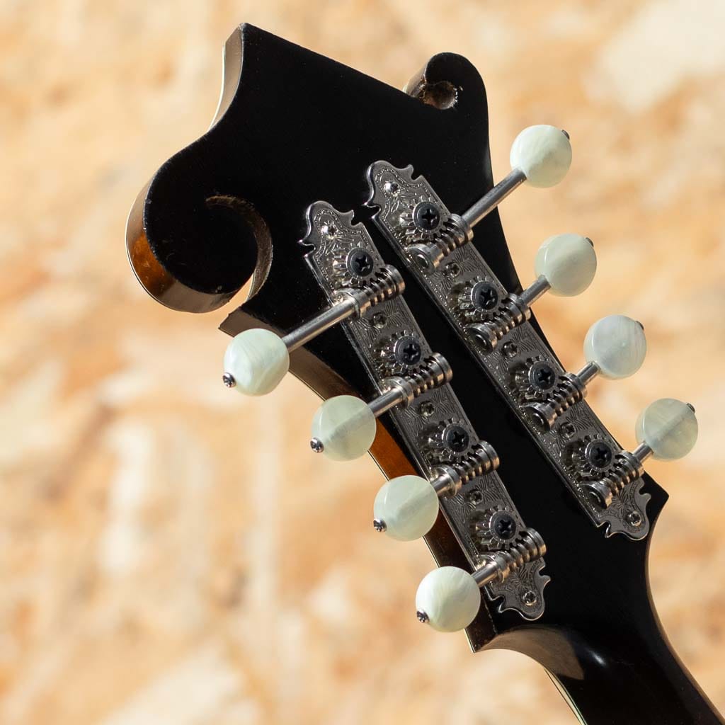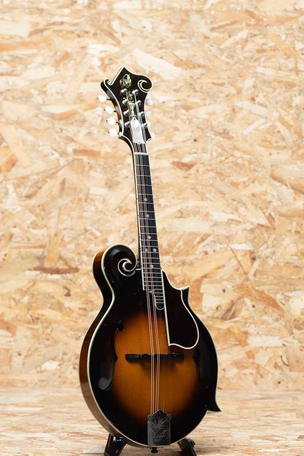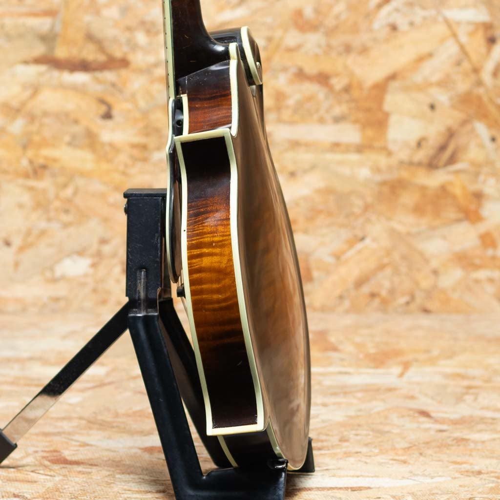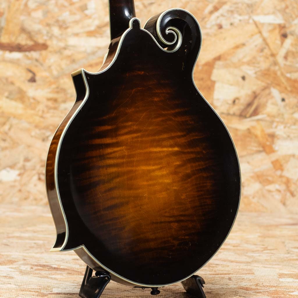 オーストラリアのルシアー、Paul Duff によって製作されるDuff Mandolinsは、現代のルシアーメイドマンドリン界において極めて高い評価を受けるブランドの一つです。1980年代初頭より製作を開始したPaul Duffは、1920年代のGibson F-5、いわゆる“ロアー期”のサウンドと構造を徹底的に研究し、長年にわたりその再現と発展に取り組んできました。その製作は現在に至るまで一貫して少量生産を貫き、トップやバックの削り出し、ボイシング、フィニッシュに至るまでほぼ全工程を手作業で行うことで、工業製品では到達し得ない繊細なニュアンスと高い完成度を実現しています。乾いた立ち上がりと芯のあるトーン、そして豊かな音量は、世界中のプレイヤーから高く評価されています。Duffの代表モデルであるF-5は、ブルーグラス・マンドリンの基準ともいえる伝統的なスタイルを踏襲したフラッグシップモデルです。当器は1995年製のF-5。アディロンダックスプルーストップ、フィギャードメイプルサイド、贅沢なフィギャードメイプル1pcバック、フィギャードメイプル1pcネック、ラディアスエボニー指板、MOPナット、ヘッドにはMOPにてDuffロゴとフラワーポットインレイ、トラスロッドカバーまでMOPです。ロアーレプリカエボニーアジャスタブルブリッジ、フルバインディング、ハンドステインの味のあるバーストカラー、フレンチポリッシュバーニッシュフィニッシュです。また本来F-5はトーンバー・ブレーシングを採用するのが一般的ですが、DuffはオプションでXブレーシング構造にすることができますが本個体はXブレーシングを採用した仕様となっています。アディロンダックスプルーストップ、メイプルバック&サイドという王道のマテリアル構成に加え、立ち上がりの速さやブライトになりすぎないDuffらしい特徴をしっかりと持ちながらもXブレーシング特有のふくよかさと空間的な広がりが加わることで、ヴィンテージ志向のトーンにモダンな表現力を兼ね備えたサウンドに仕上がっています。全体的に使い込まれたネック裏塗装のハゲや使用キズや小さな打痕など使用感が見られますがかえって良い顔つきへと経年した表情を魅せます。フレットはローポジションを中心にわずかな減りが見られますが使用に問題のないレベルでネックは綺麗なストレート状態をキープしています。クラック補修などもみられずよいコンディションをキープしています。長年の経年と演奏によって十分に弾き込まれ、ハイポジションでも音やせせずファットな響きをもち、こなれた鳴りを獲得しています。Duff Mandolinの魅力を深く味わえる、コレクションとしても演奏用としても価値の高い逸品です。Presto Hard Case付属