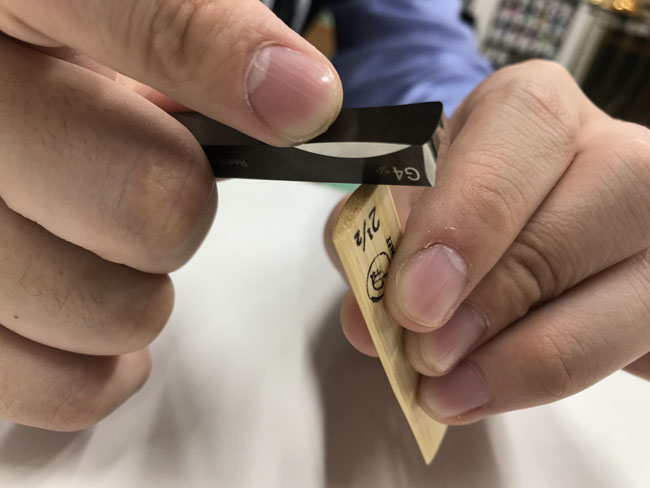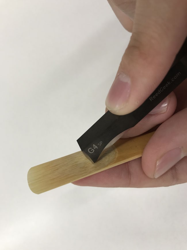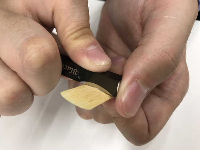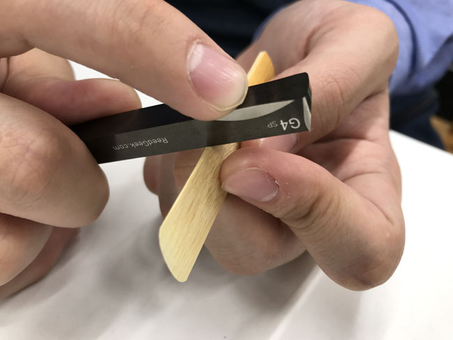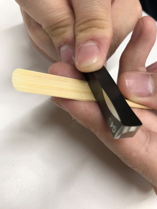 箱を開けたばかりの未使用のリードでも左右の厚みが違ったり、リードの全体的な厚みを調節する場合に、このツールを使えば左右のバランスやリードの硬さを微調整できます。これまで吹けないと思って諦めていたリード、捨てていたリードがもしかすると多く使えるようになるかもしれません。