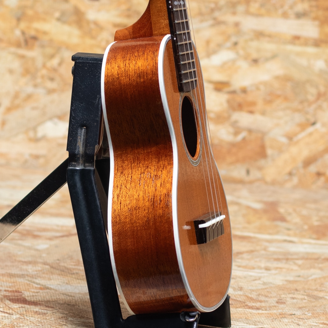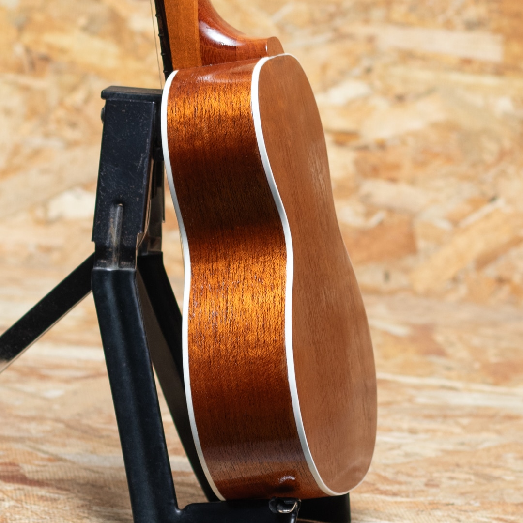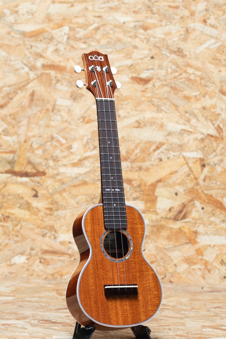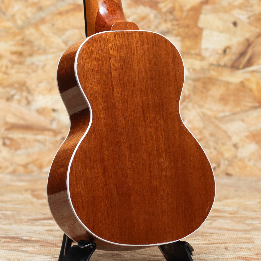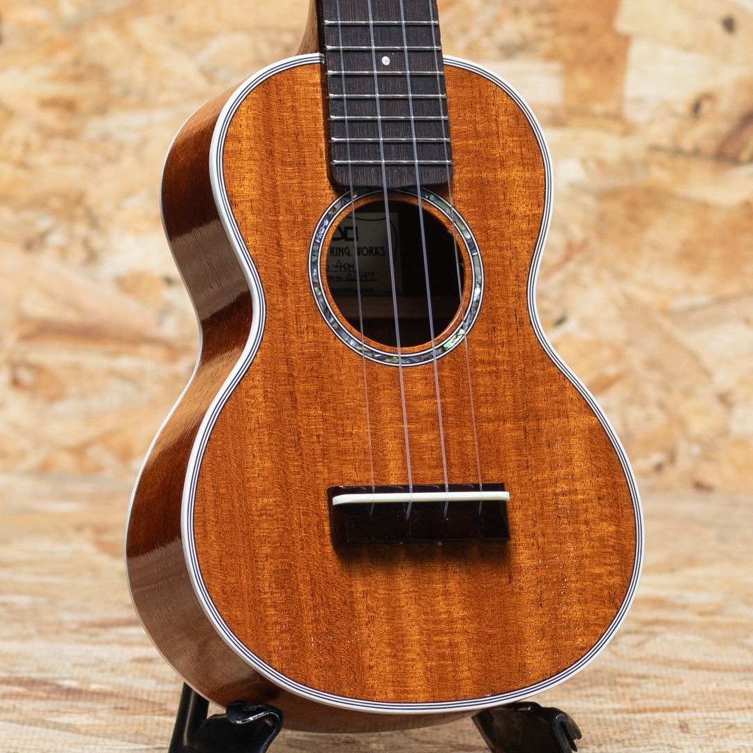 京都市の工房にて占部英明氏、息子の直宏氏によって製作される完全ハンドメイドウクレレ。本器はホンジュラス・マホガニーボディのソプラノモデル。ホンジュラスマホガニーネック、ウェンジ指板、ローズウッドブリッジ、ホワイトボディバインディング、アバロンロゼッタ、指板12フレット上キャツアイインレイ、グローバー製ギヤペグ。占部ウクレレ特有のやや薄めで握り易いネックシェイプ、0フレット仕様でローポジションの弾き易さは格別。ホンジュラスマホガニーの軽やかで軽快な響きとソプラノらしいコロコロとした雰囲気の音色の1本。ボディの大きさ、スケール等、扱い易いサイズ感ですので、女性の方にもオススメです。